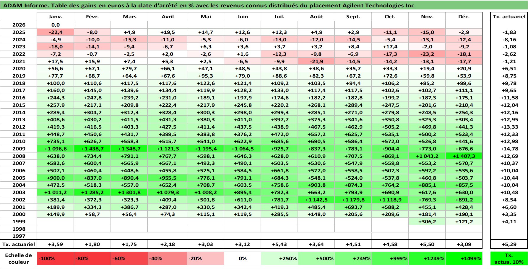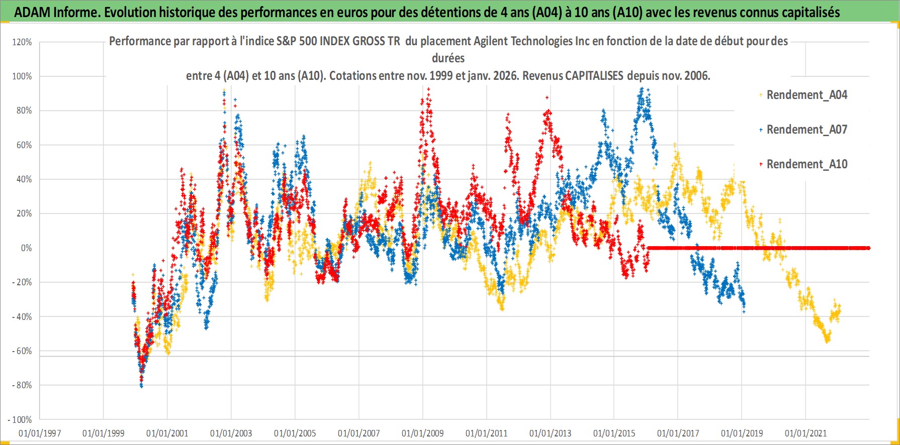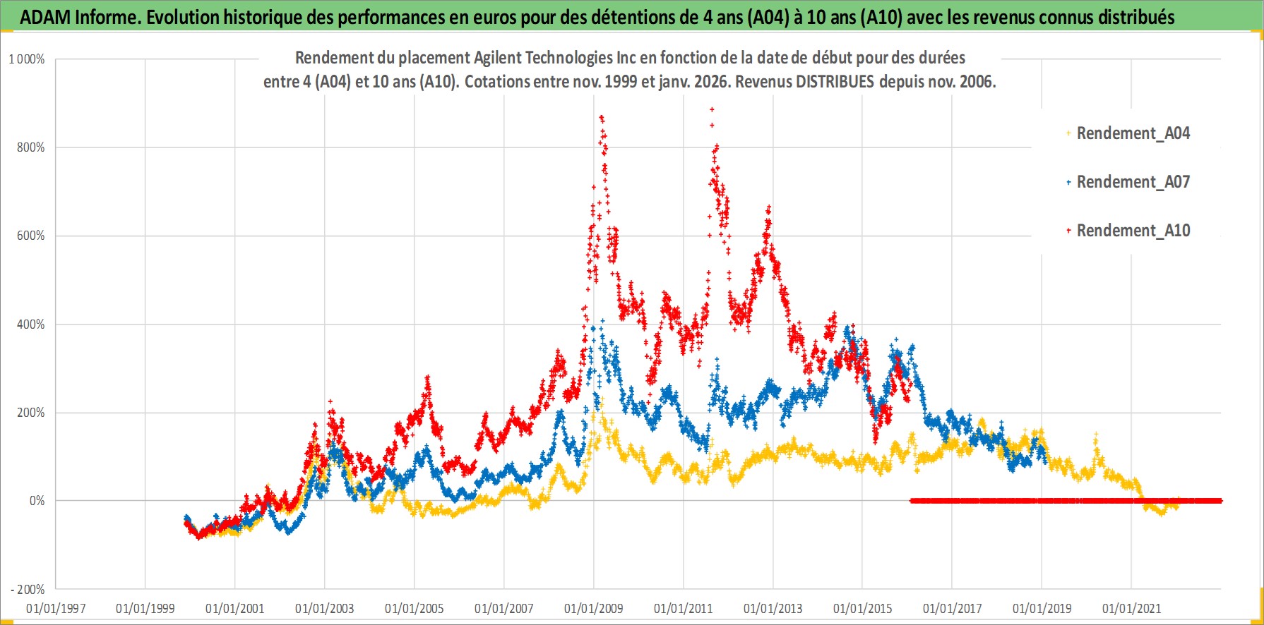 Site dédié aux investisseursPage dédiée sur site financeAnalyse des valorisations hebdomadaires de l'action Agilent Technologies Inc. Cet actif est cote en USD. Les valorisations sont en contrevaleur EURO et couvrent les semaines 1999W46 a 2026W05. Les revenus de cet actif financier sont pris en compte depuis la semaine 2006W44. La note globale ESG de cet actif est estimee a 13.0 (apres rebasage entre 0 et 20).