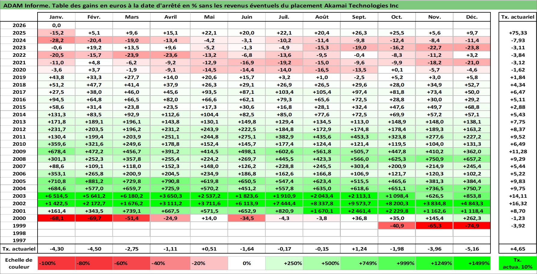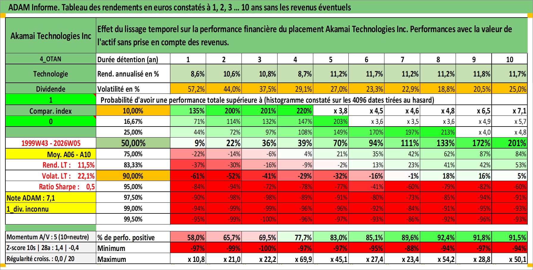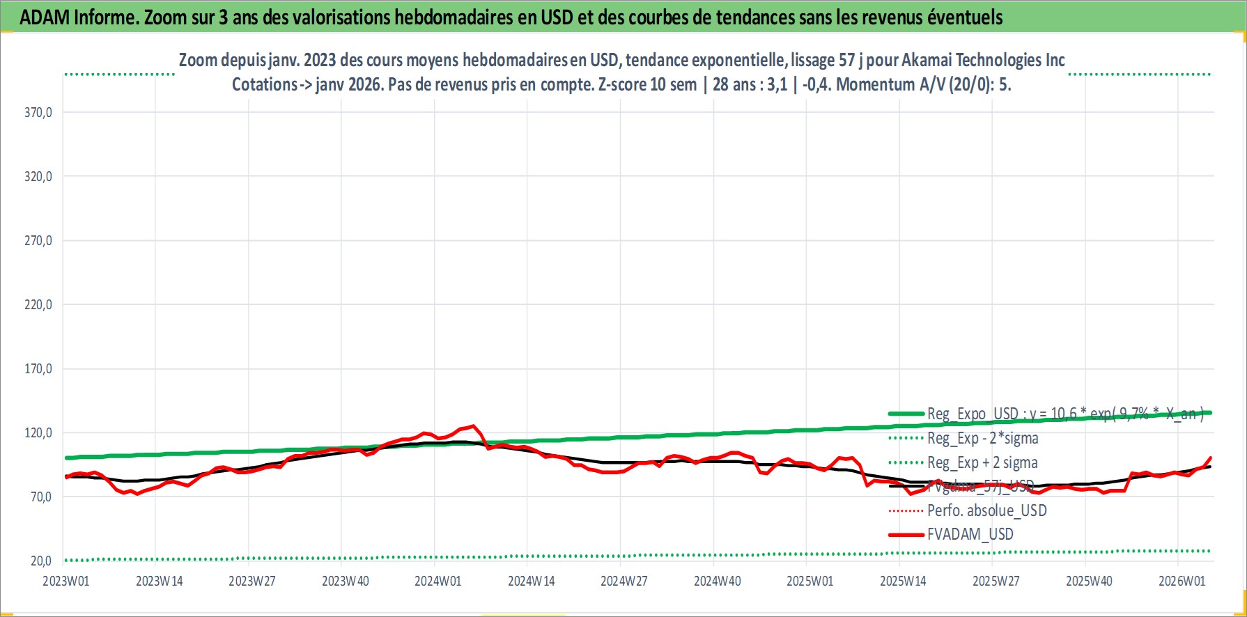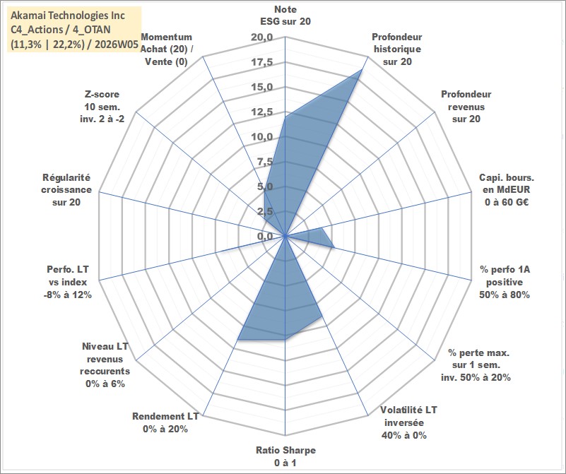 Site dédié aux investisseursPage dédiée sur site financeAnalyse des valorisations hebdomadaires de l'action Akamai Technologies Inc. Cet actif est cote en USD. Les valorisations sont en contrevaleur EURO et couvrent les semaines 1999W43 a 2026W05. Les revenus de cet actif financier ne sont pas connus car non existants ou non disponibles sur le site Yahoo Finance. La note globale ESG de cet actif est estimee a 12.0 (apres rebasage entre 0 et 20).