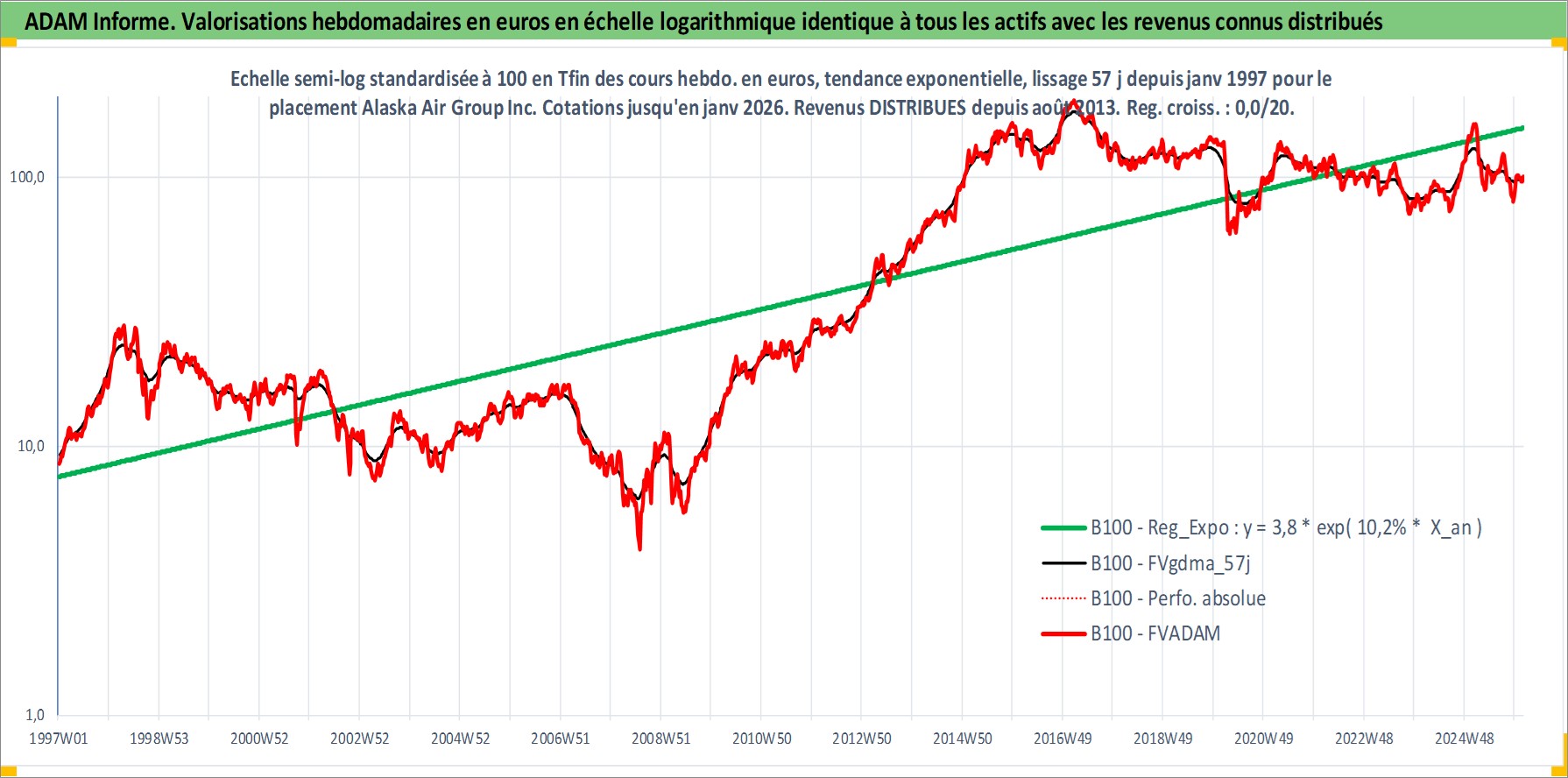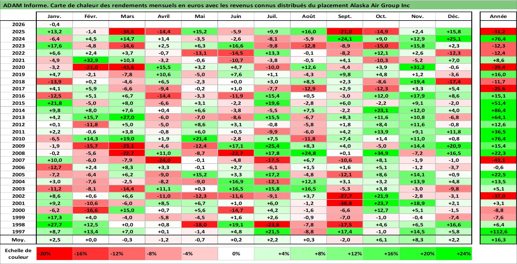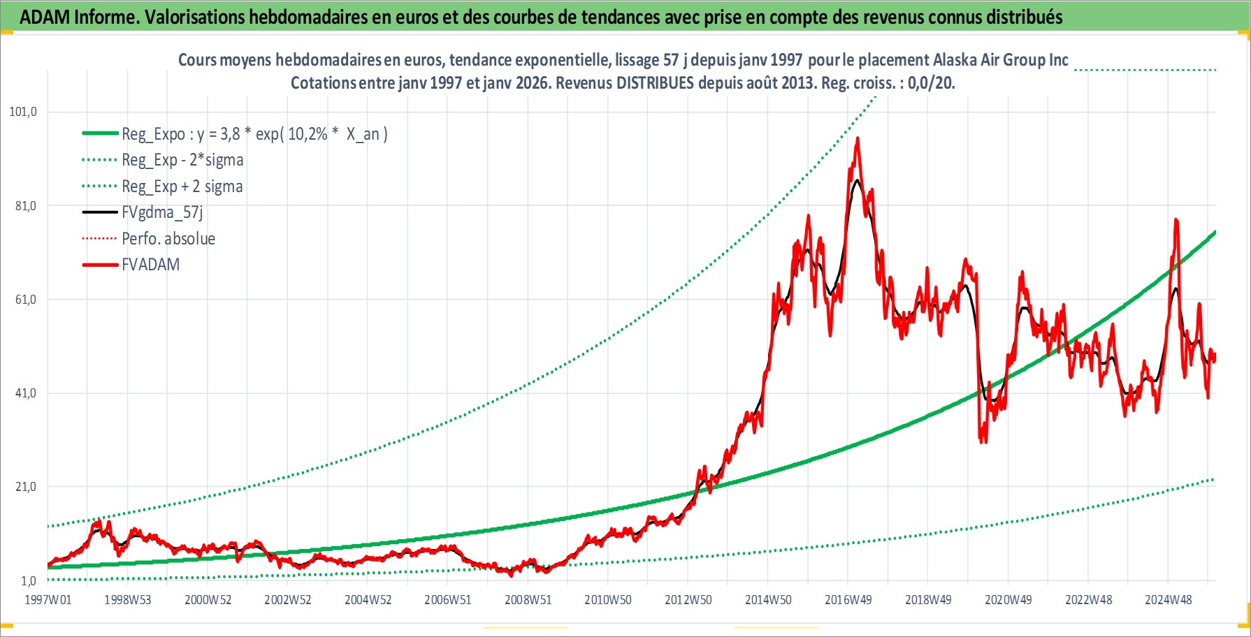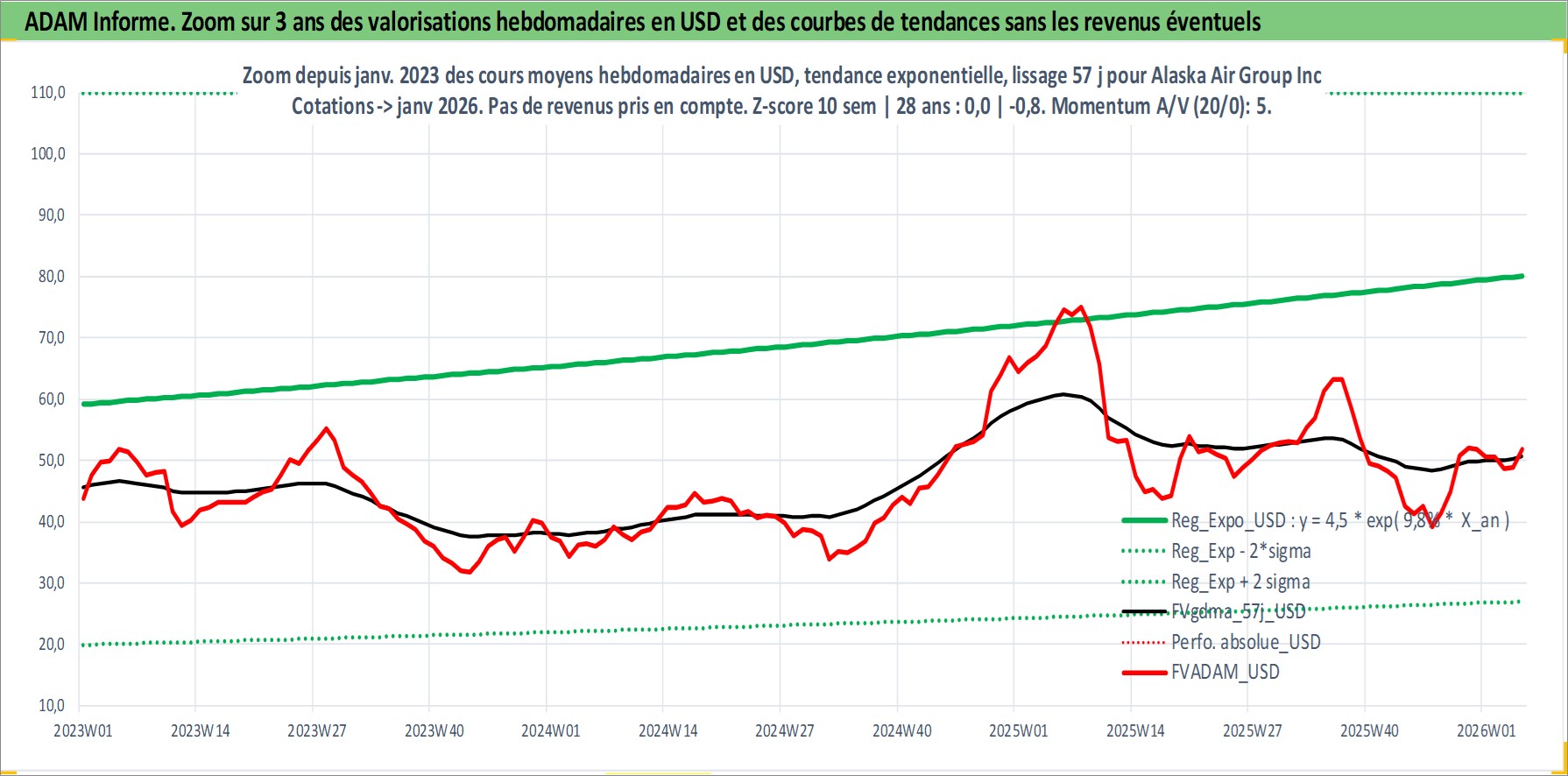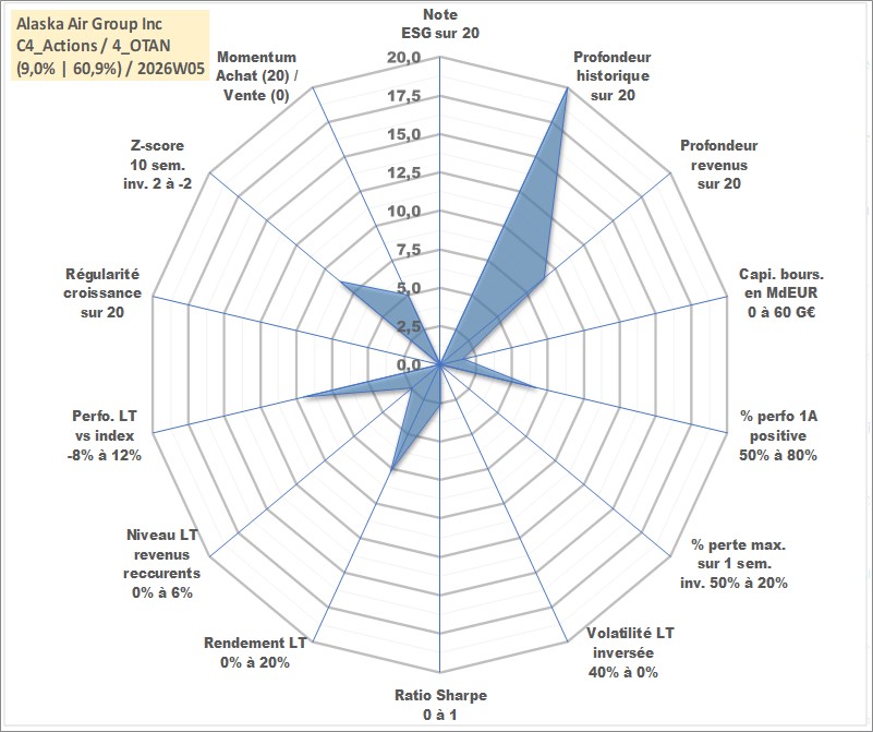 Site dédié aux investisseursPage dédiée sur site financeAnalyse des valorisations hebdomadaires de l'action Alaska Air Group Inc. Cet actif est cote en USD. Les valorisations sont en contrevaleur EURO et couvrent les semaines 1997W01 a 2026W05. Les revenus de cet actif financier sont pris en compte depuis la semaine 2013W31. La note ESG de cet actif n'est pas connue.