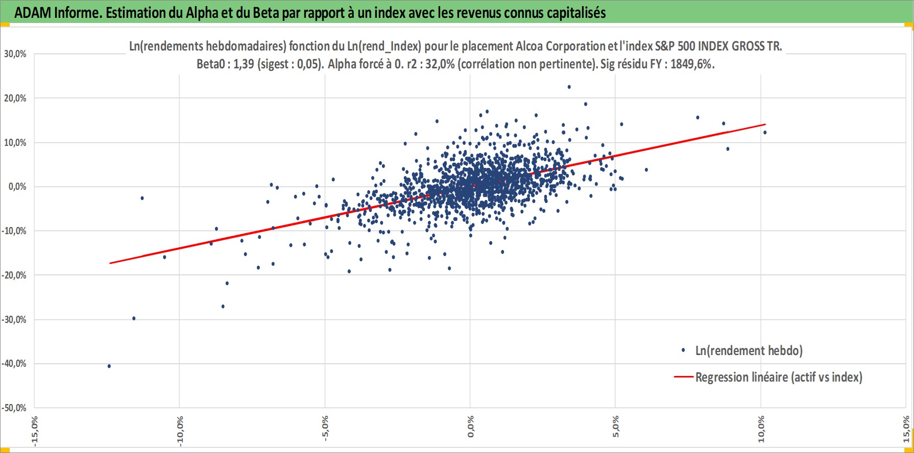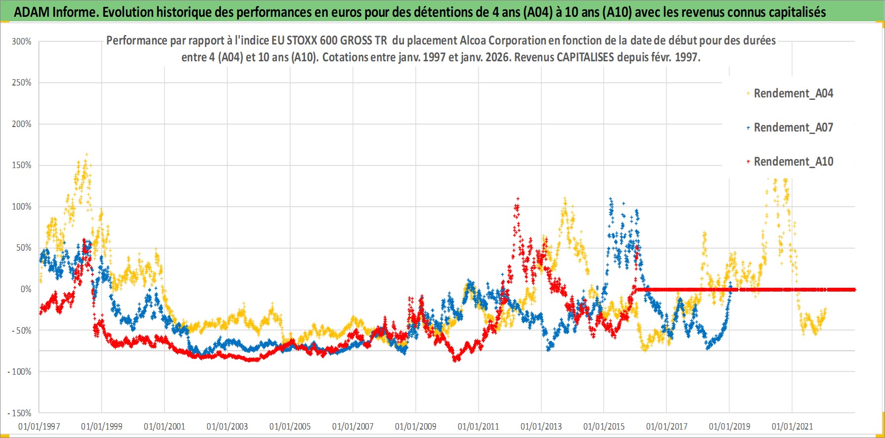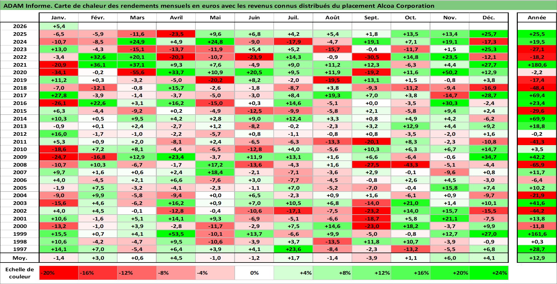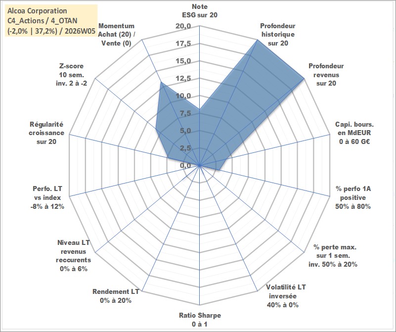 Site dédié aux investisseursPage dédiée sur site financeAnalyse des valorisations hebdomadaires de l'action Alcoa Corporation. Cet actif est cote en USD. Les valorisations sont en contrevaleur EURO et couvrent les semaines 1997W01 a 2026W05. Les revenus de cet actif financier sont pris en compte depuis la semaine 1997W06. La note globale ESG de cet actif est estimee a 8.0 (apres rebasage entre 0 et 20).