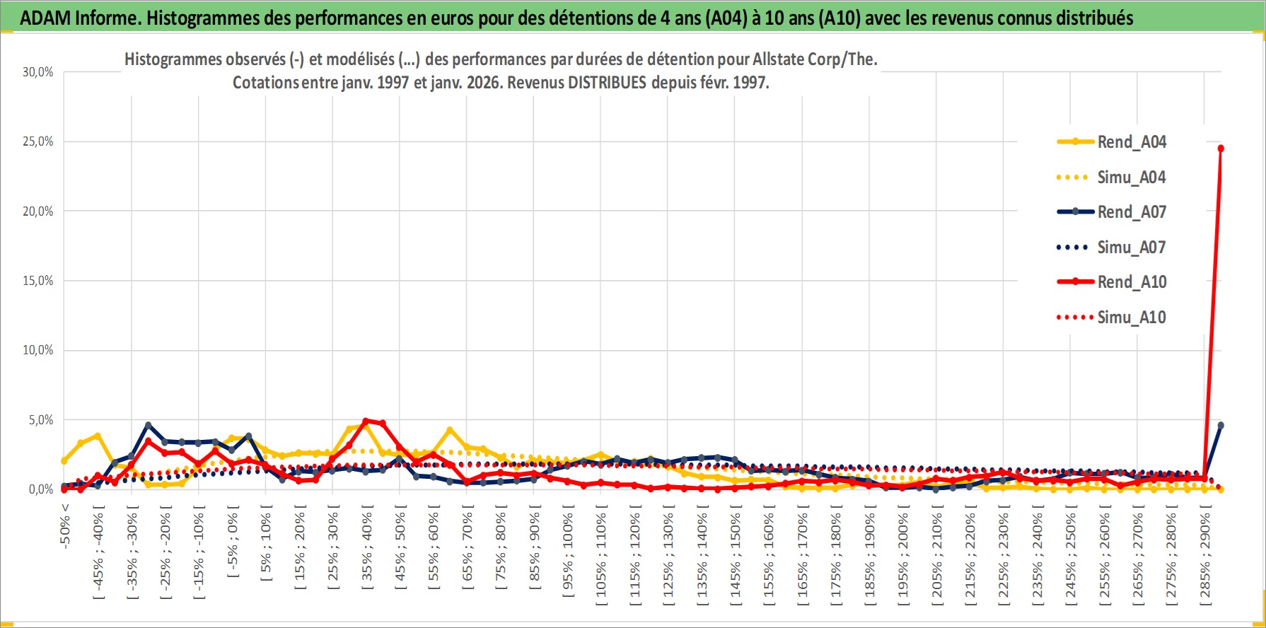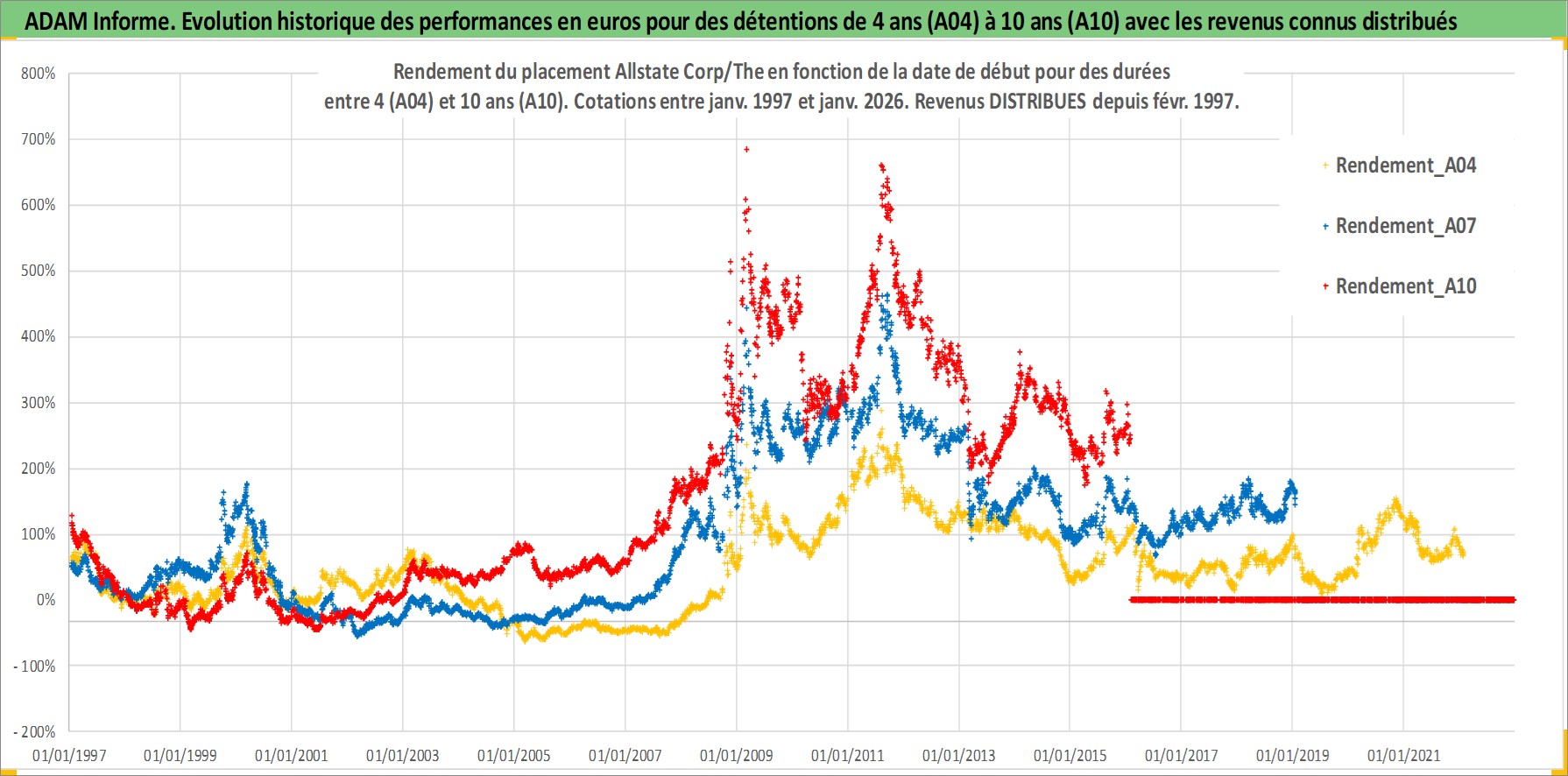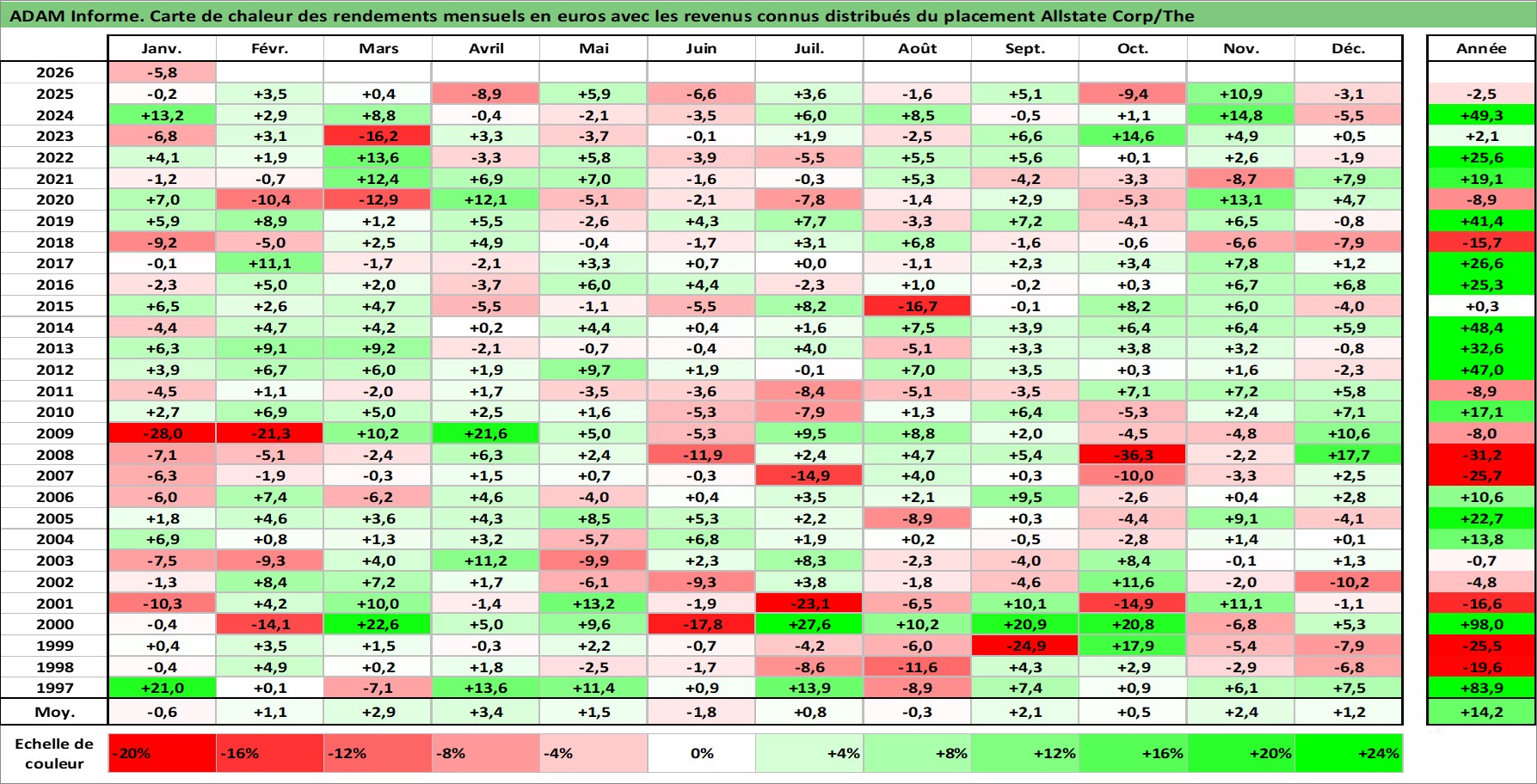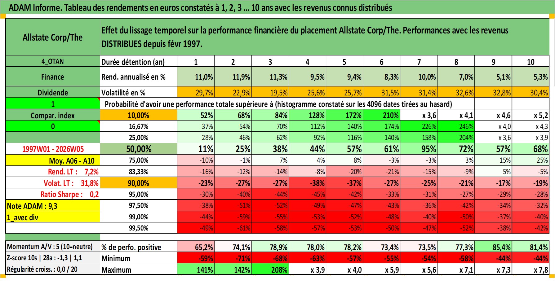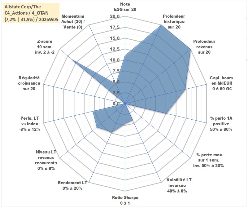 Site dédié aux investisseursPage dédiée sur site financeAnalyse des valorisations hebdomadaires de l'action Allstate Corp/The. Cet actif est cote en USD. Les valorisations sont en contrevaleur EURO et couvrent les semaines 1997W01 a 2026W05. Les revenus de cet actif financier sont pris en compte depuis la semaine 1997W09. La note globale ESG de cet actif est estimee a 11.0 (apres rebasage entre 0 et 20).