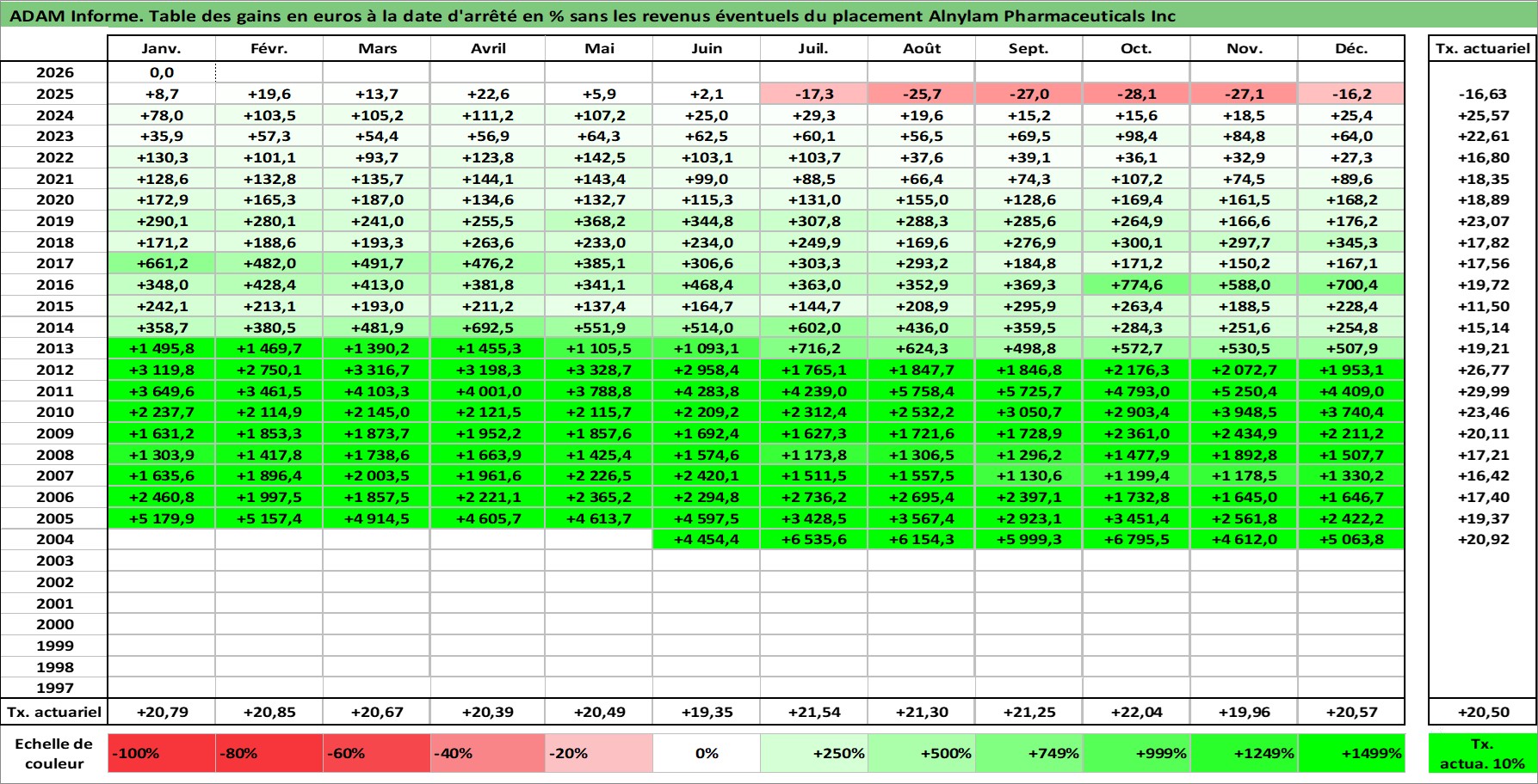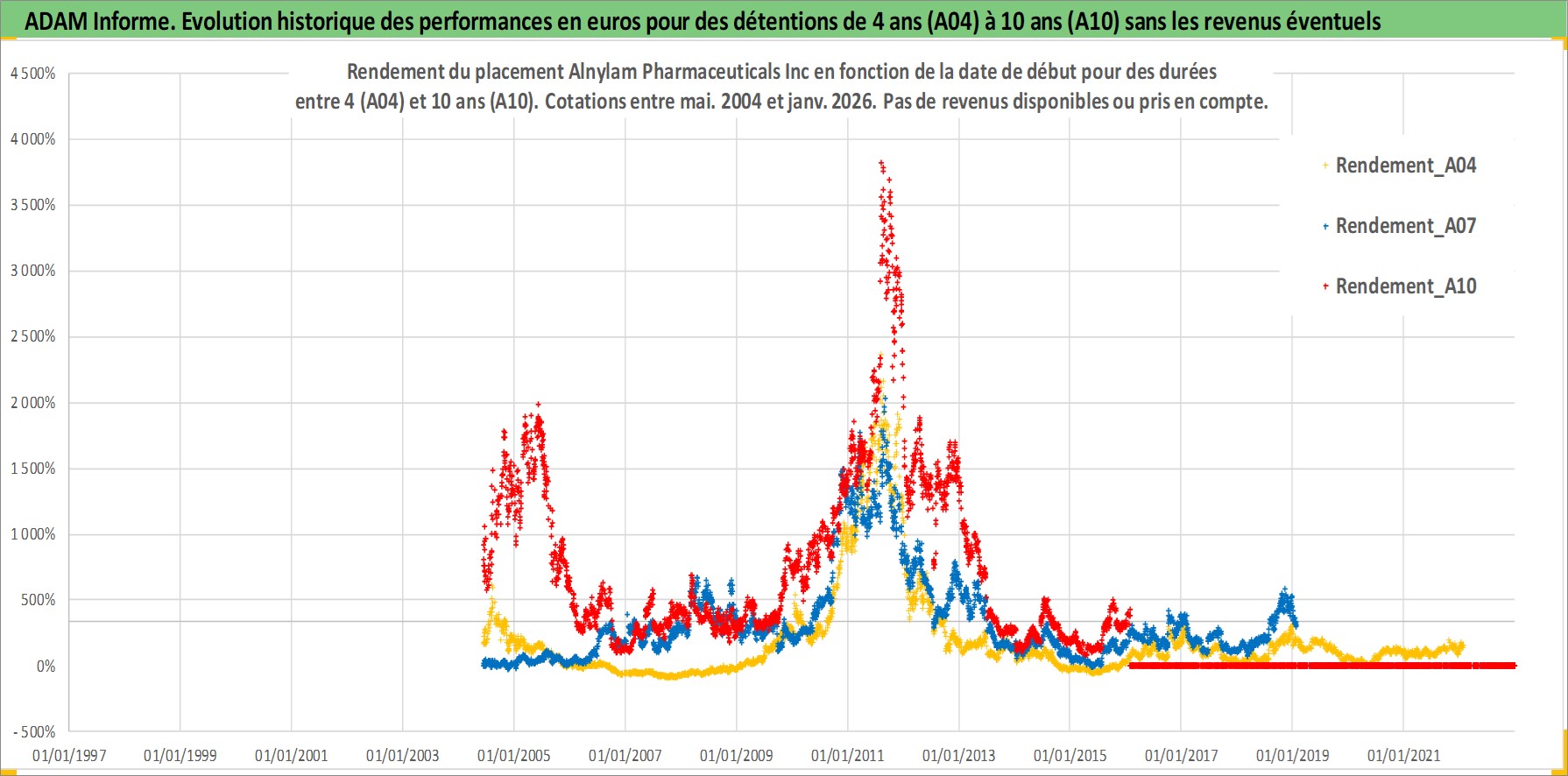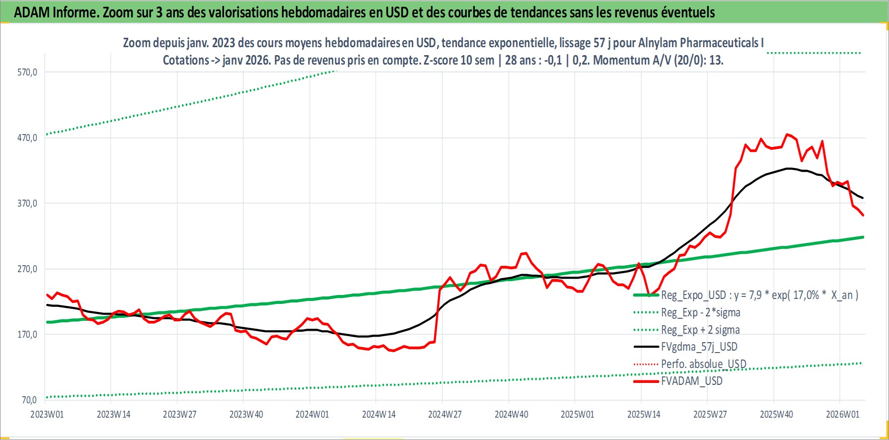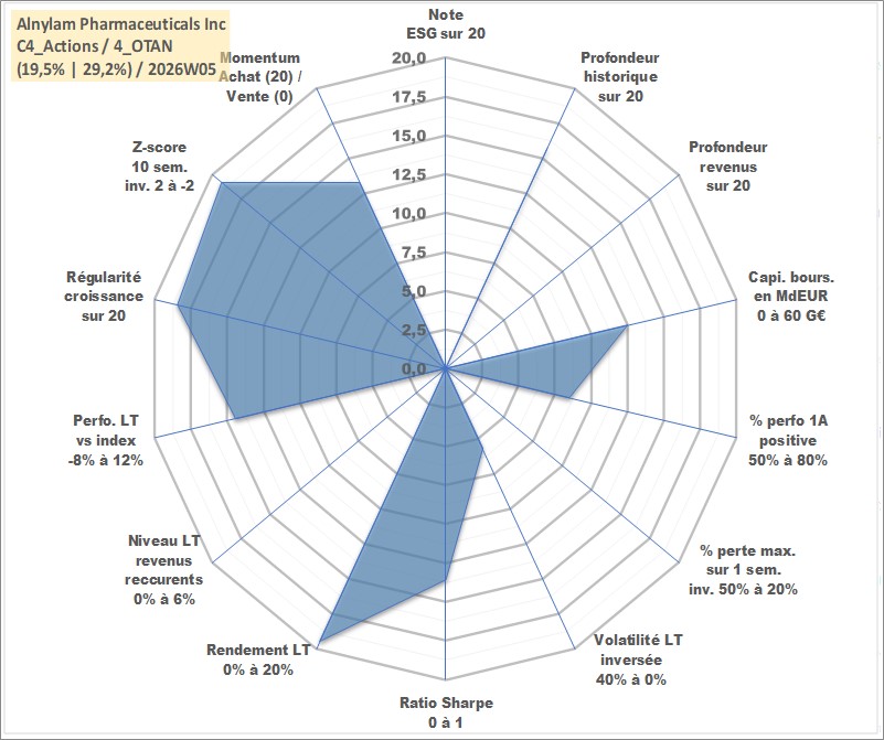 Site dédié aux investisseursPage dédiée sur site financeAnalyse des valorisations hebdomadaires de l'action Alnylam Pharmaceuticals Inc. Cet actif est cote en USD. Les valorisations sont en contrevaleur EURO et couvrent les semaines 2004W23 a 2026W05. Les revenus de cet actif financier ne sont pas connus car non existants ou non disponibles sur le site Yahoo Finance. La note ESG de cet actif n'est pas connue.