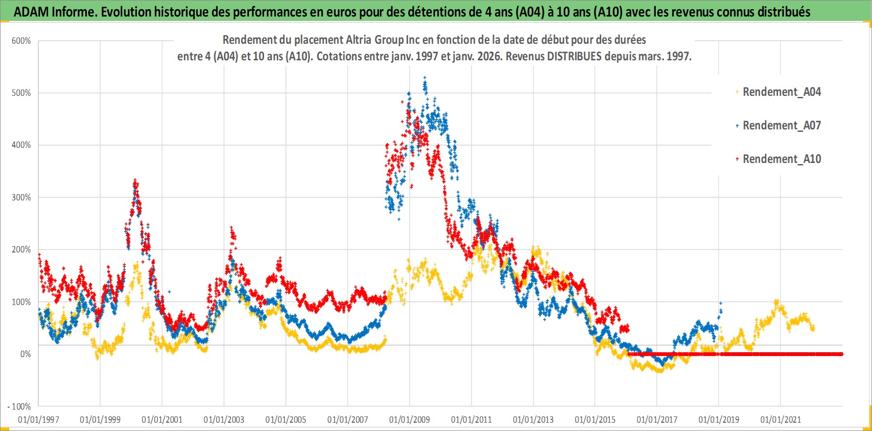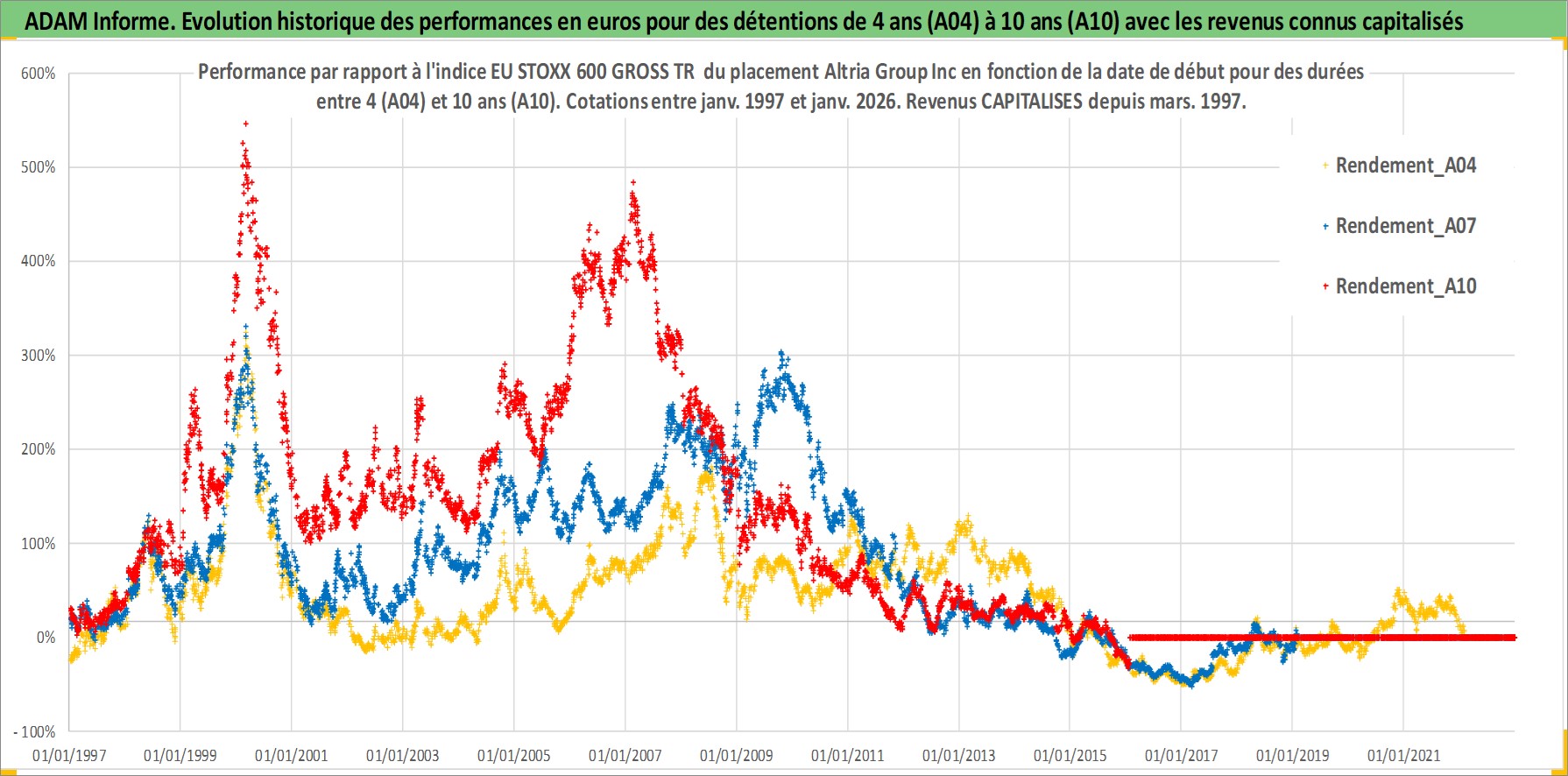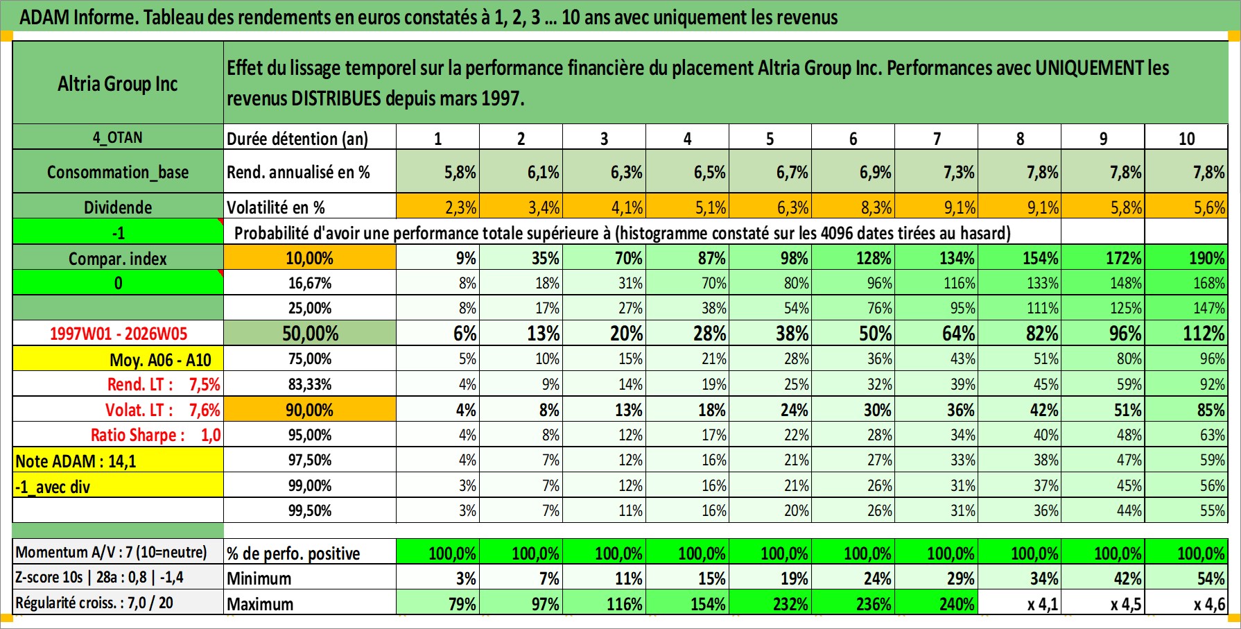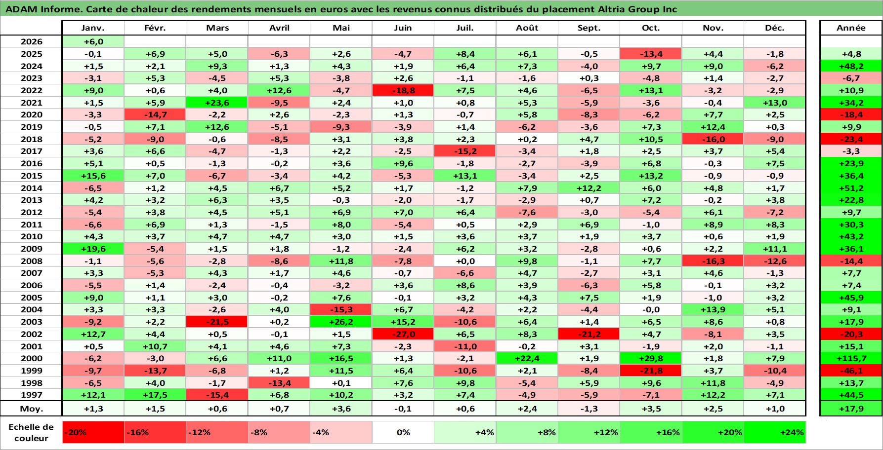 Site dédié aux investisseursPage dédiée sur site financeAnalyse des valorisations hebdomadaires de l'action Altria Group Inc. Cet actif est cote en USD. Les valorisations sont en contrevaleur EURO et couvrent les semaines 1997W01 a 2026W05. Les revenus de cet actif financier sont pris en compte depuis la semaine 1997W11. La note globale ESG de cet actif est estimee a 8.0 (apres rebasage entre 0 et 20).