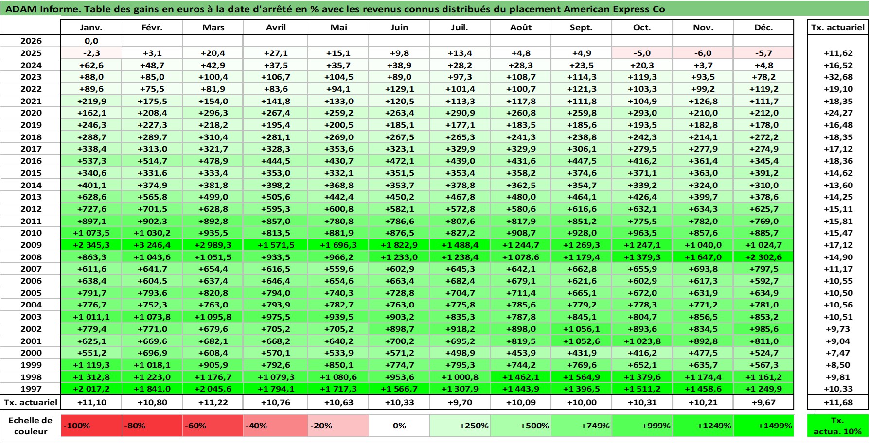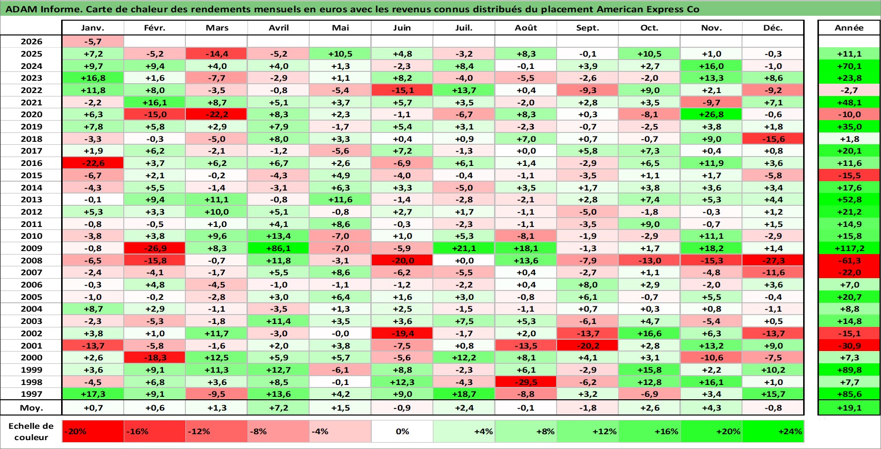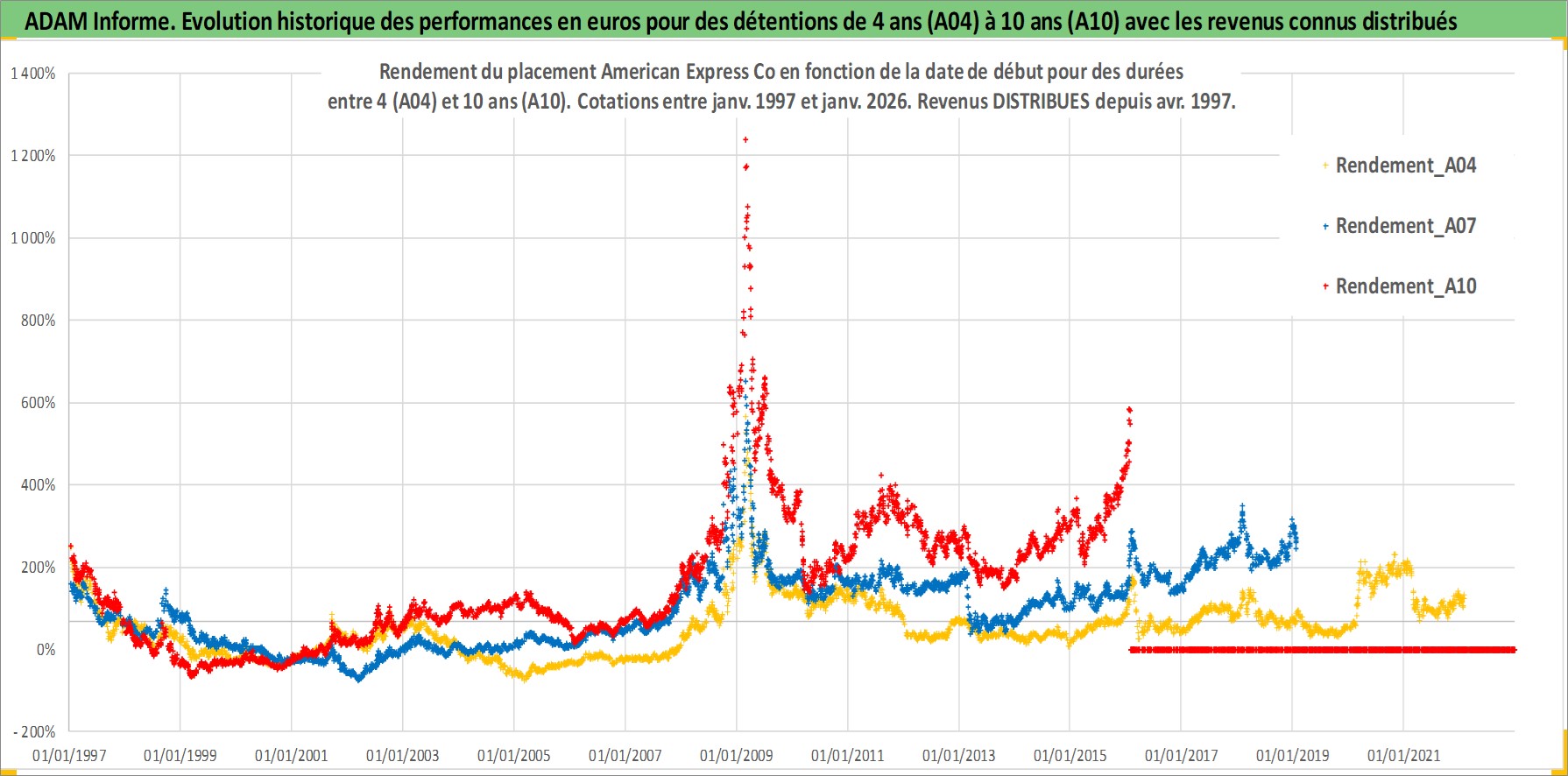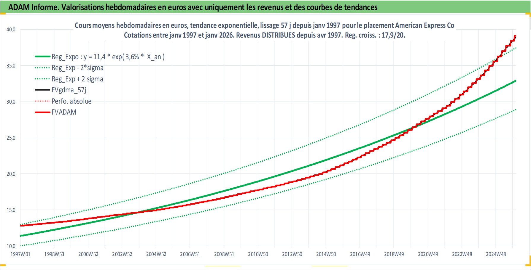 Site dédié aux investisseursPage dédiée sur site financeAnalyse des valorisations hebdomadaires de l'action American Express Co. Cet actif est cote en USD. Les valorisations sont en contrevaleur EURO et couvrent les semaines 1997W01 a 2026W05. Les revenus de cet actif financier sont pris en compte depuis la semaine 1997W14. La note globale ESG de cet actif est estimee a 11.0 (apres rebasage entre 0 et 20).