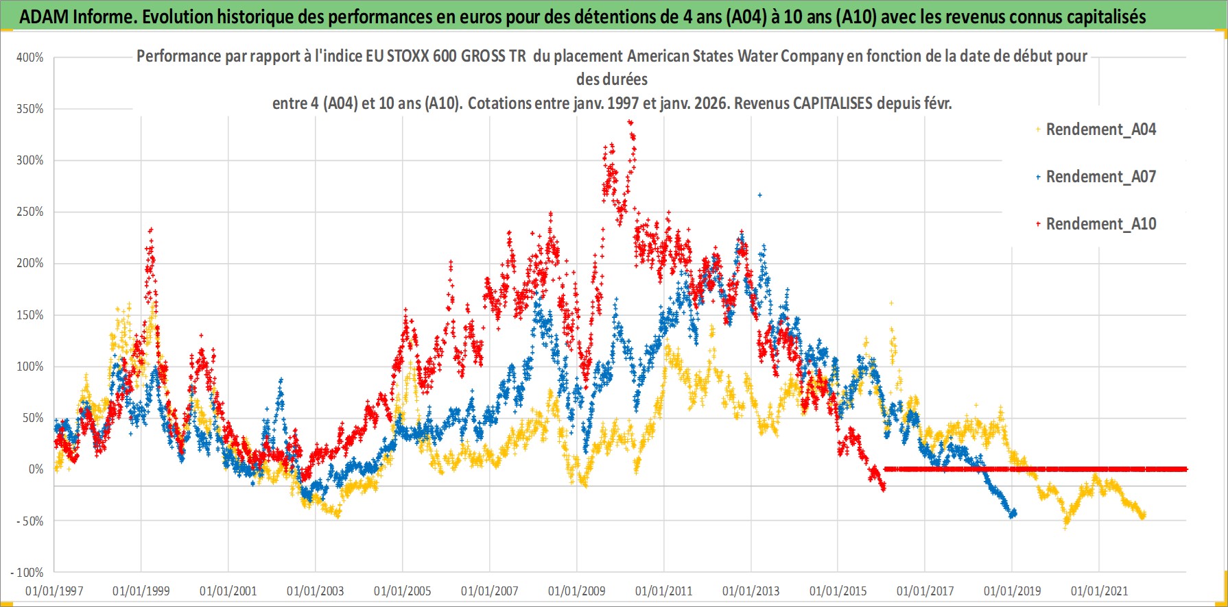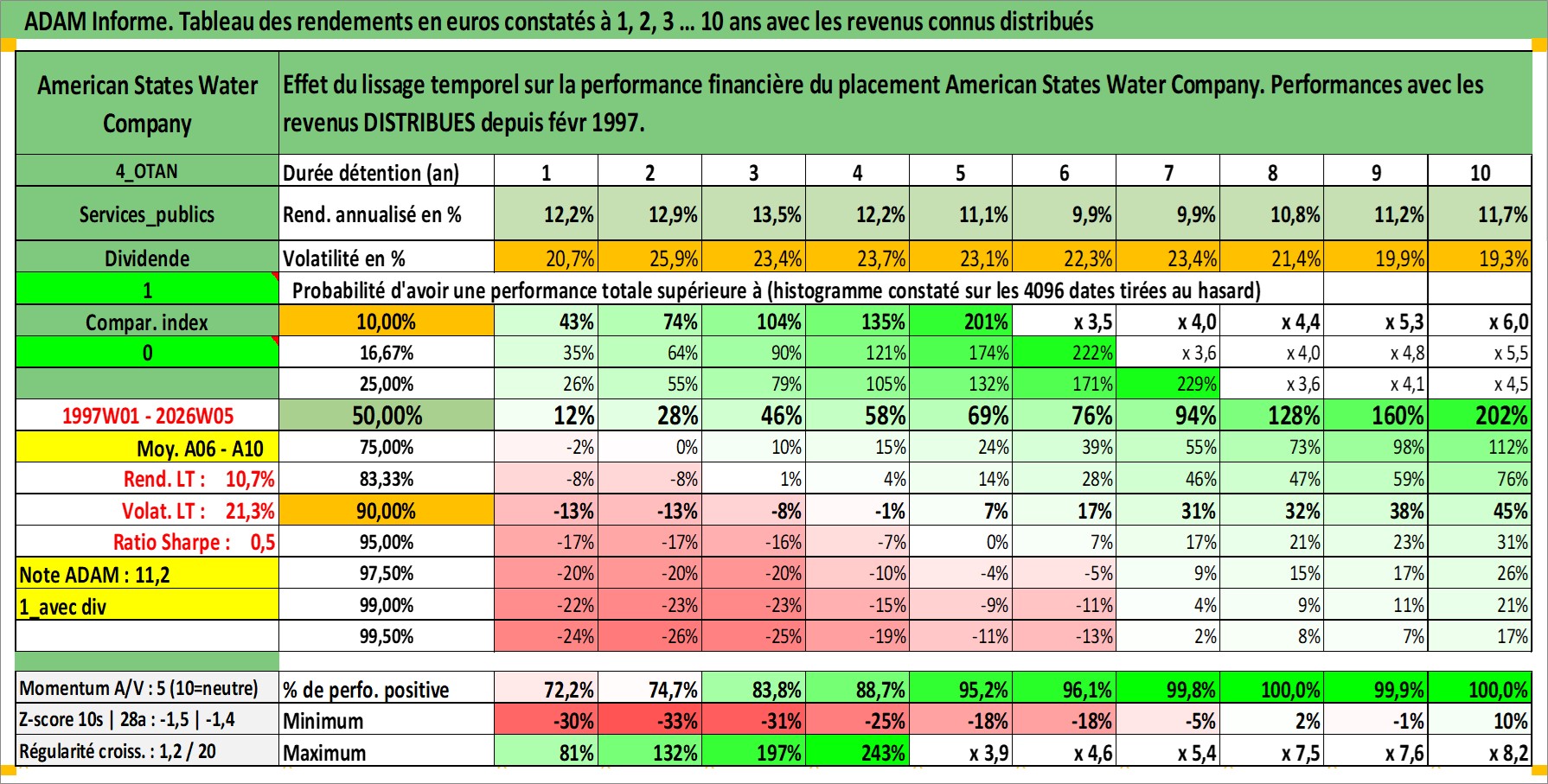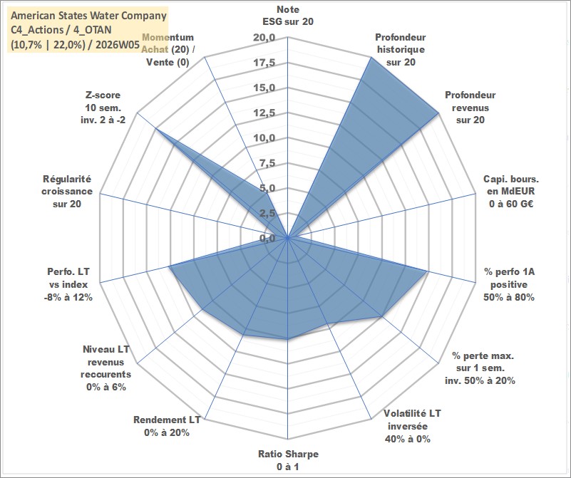 Site dédié aux investisseursPage dédiée sur site financeAnalyse des valorisations hebdomadaires de l'action American States Water Company. Cet actif est cote en USD. Les valorisations sont en contrevaleur EURO et couvrent les semaines 1997W01 a 2026W05. Les revenus de cet actif financier sont pris en compte depuis la semaine 1997W06. La note ESG de cet actif n'est pas connue.