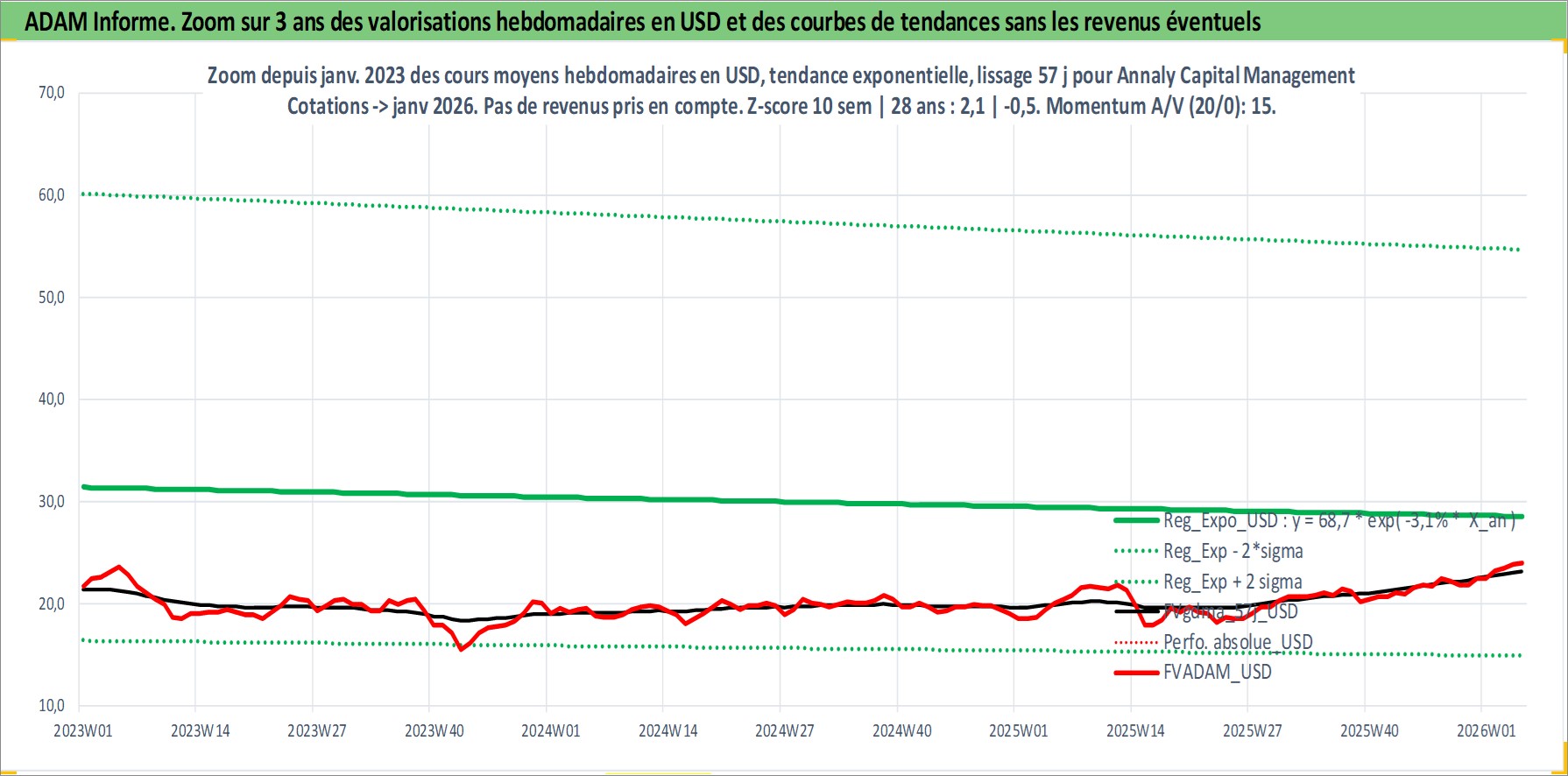 Site dédié aux investisseursPage dédiée sur site financeAnalyse des valorisations hebdomadaires de l'action Annaly Capital Management Inc. Cet actif est cote en USD. Les valorisations sont en contrevaleur EURO et couvrent les semaines 1997W41 a 2026W05. Les revenus de cet actif financier sont pris en compte depuis la semaine 1998W01. La note globale ESG de cet actif est estimee a 11.0 (apres rebasage entre 0 et 20).