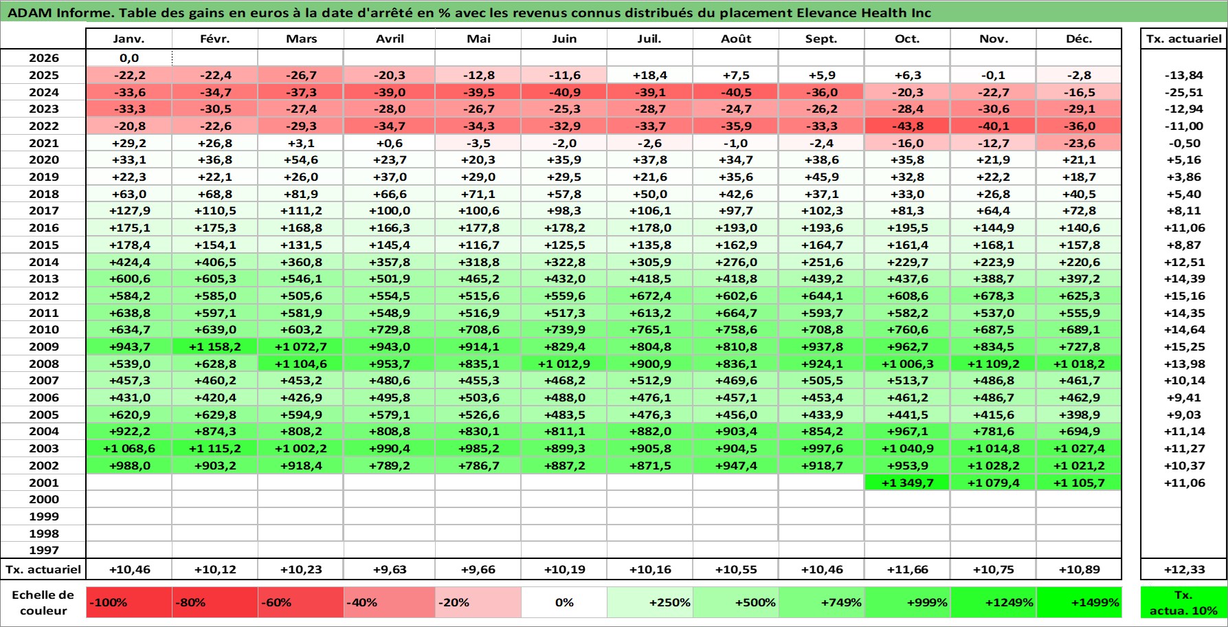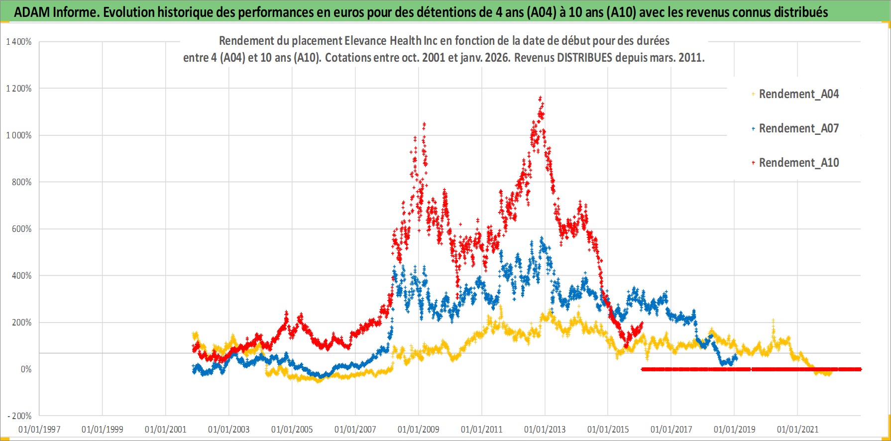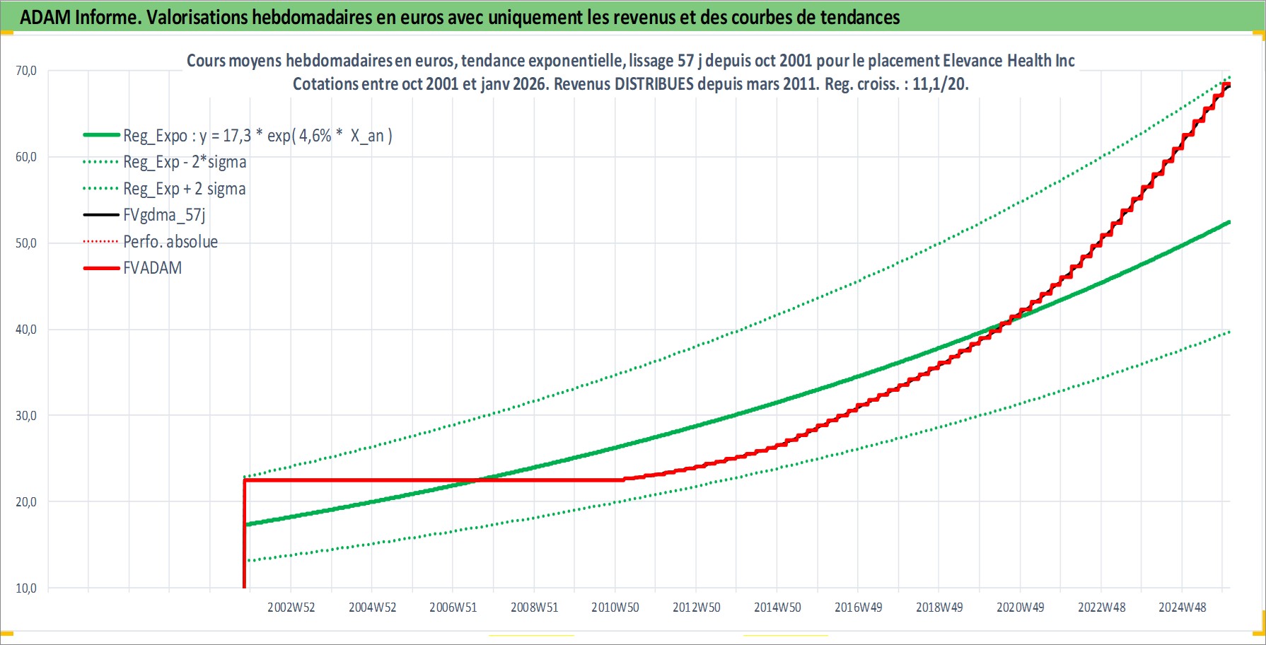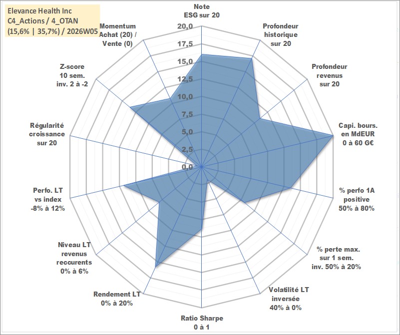 Site dédié aux investisseursPage dédiée sur site financeAnalyse des valorisations hebdomadaires de l'action Elevance Health Inc. Cet actif est cote en USD. Les valorisations sont en contrevaleur EURO et couvrent les semaines 2001W44 a 2026W05. Les revenus de cet actif financier sont pris en compte depuis la semaine 2011W10. La note globale ESG de cet actif est estimee a 16.0 (apres rebasage entre 0 et 20).