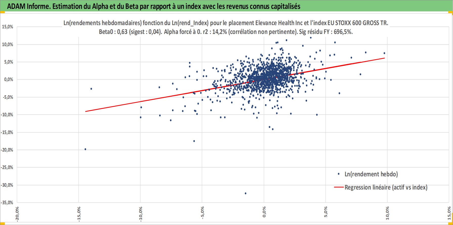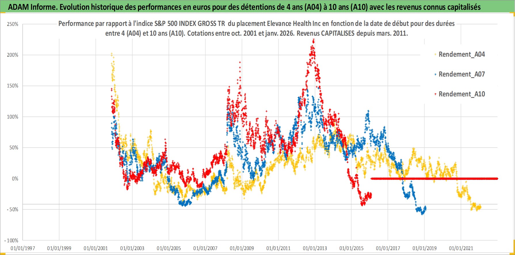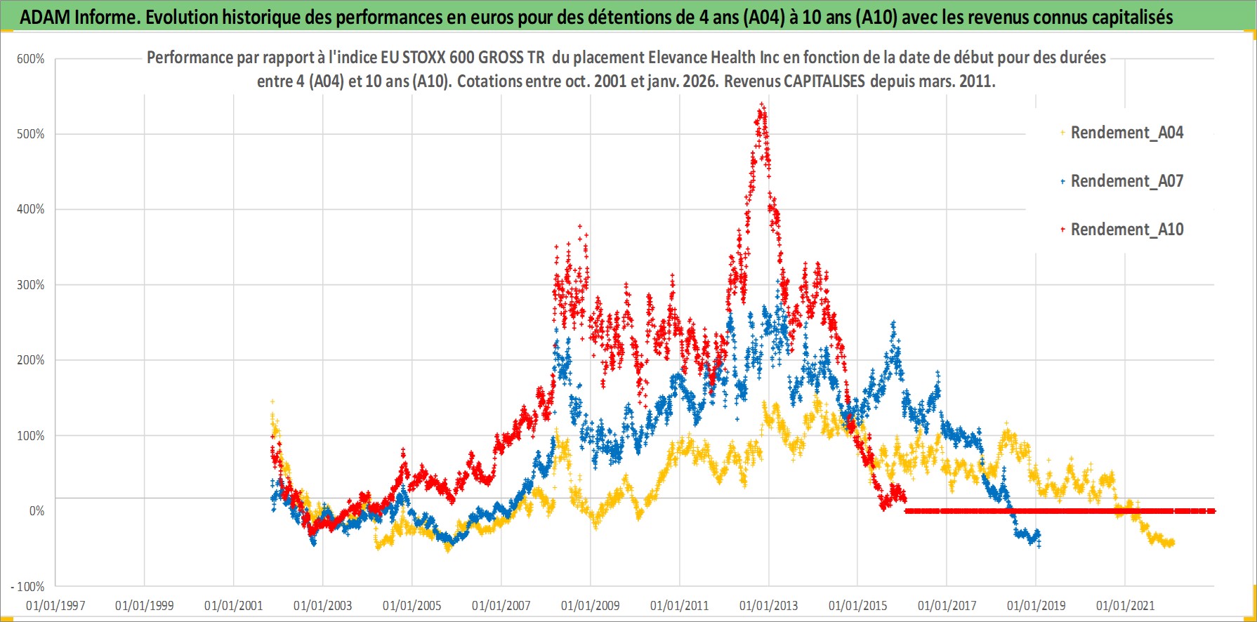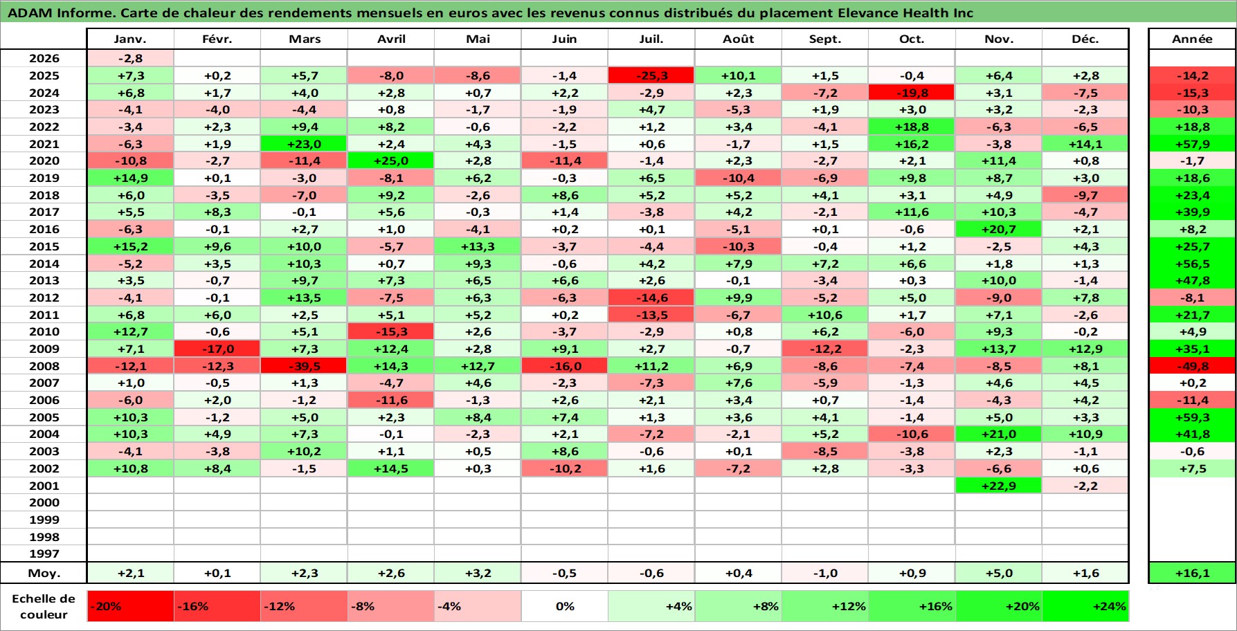 Site dédié aux investisseursPage dédiée sur site financeAnalyse des valorisations hebdomadaires de l'action Elevance Health Inc. Cet actif est cote en USD. Les valorisations sont en contrevaleur EURO et couvrent les semaines 2001W44 a 2026W05. Les revenus de cet actif financier sont pris en compte depuis la semaine 2011W10. La note globale ESG de cet actif est estimee a 16.0 (apres rebasage entre 0 et 20).