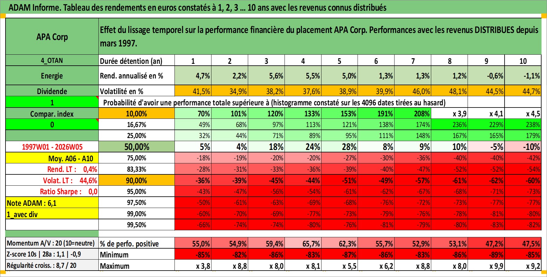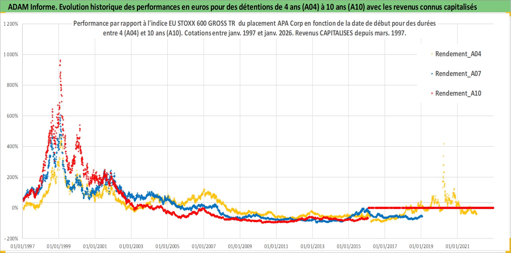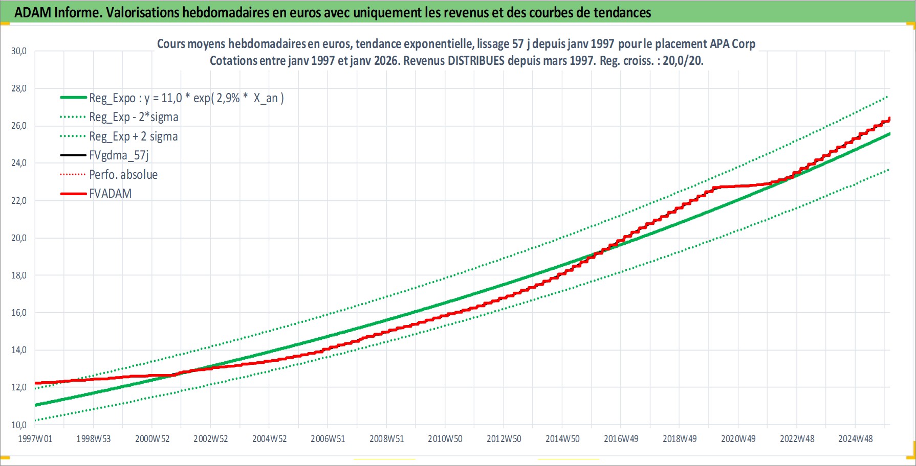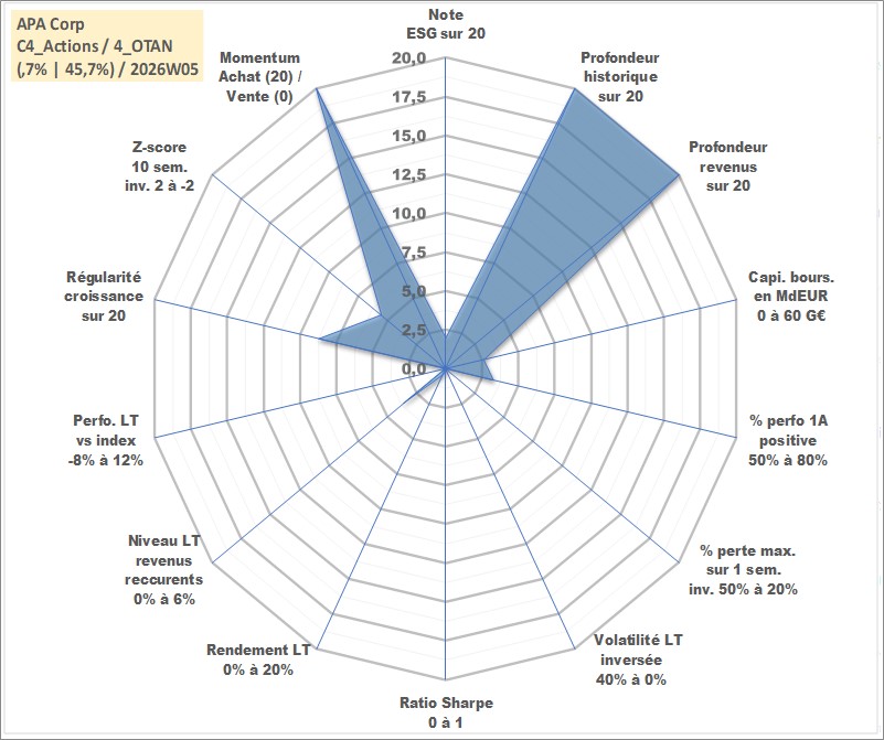 Site dédié aux investisseursPage dédiée sur site financeAnalyse des valorisations hebdomadaires de l'action APA Corp. Cet actif est cote en USD. Les valorisations sont en contrevaleur EURO et couvrent les semaines 1997W01 a 2026W05. Les revenus de cet actif financier sont pris en compte depuis la semaine 1997W13. La note globale ESG de cet actif est estimee a 2.0 (apres rebasage entre 0 et 20).