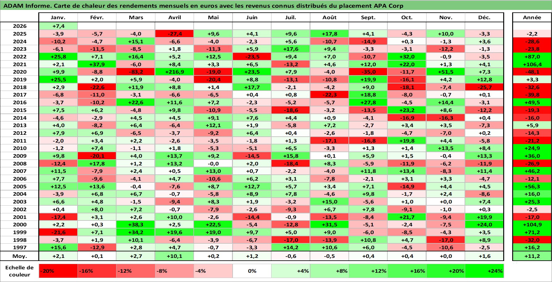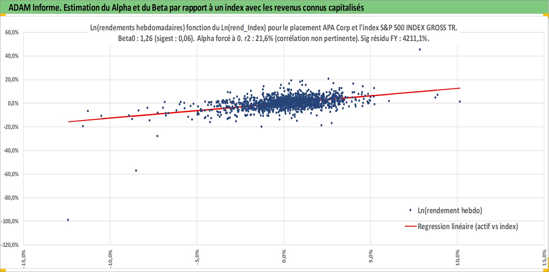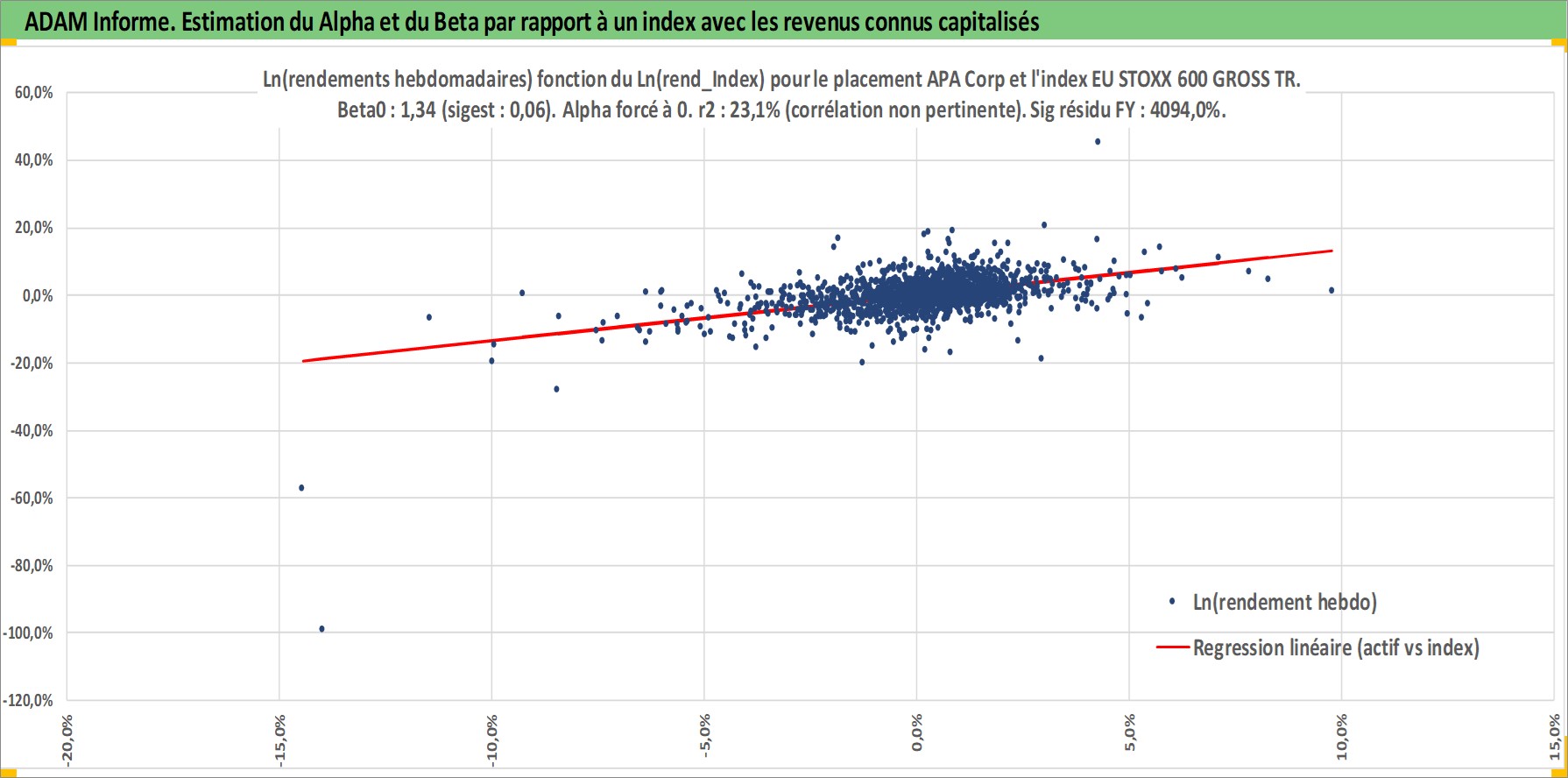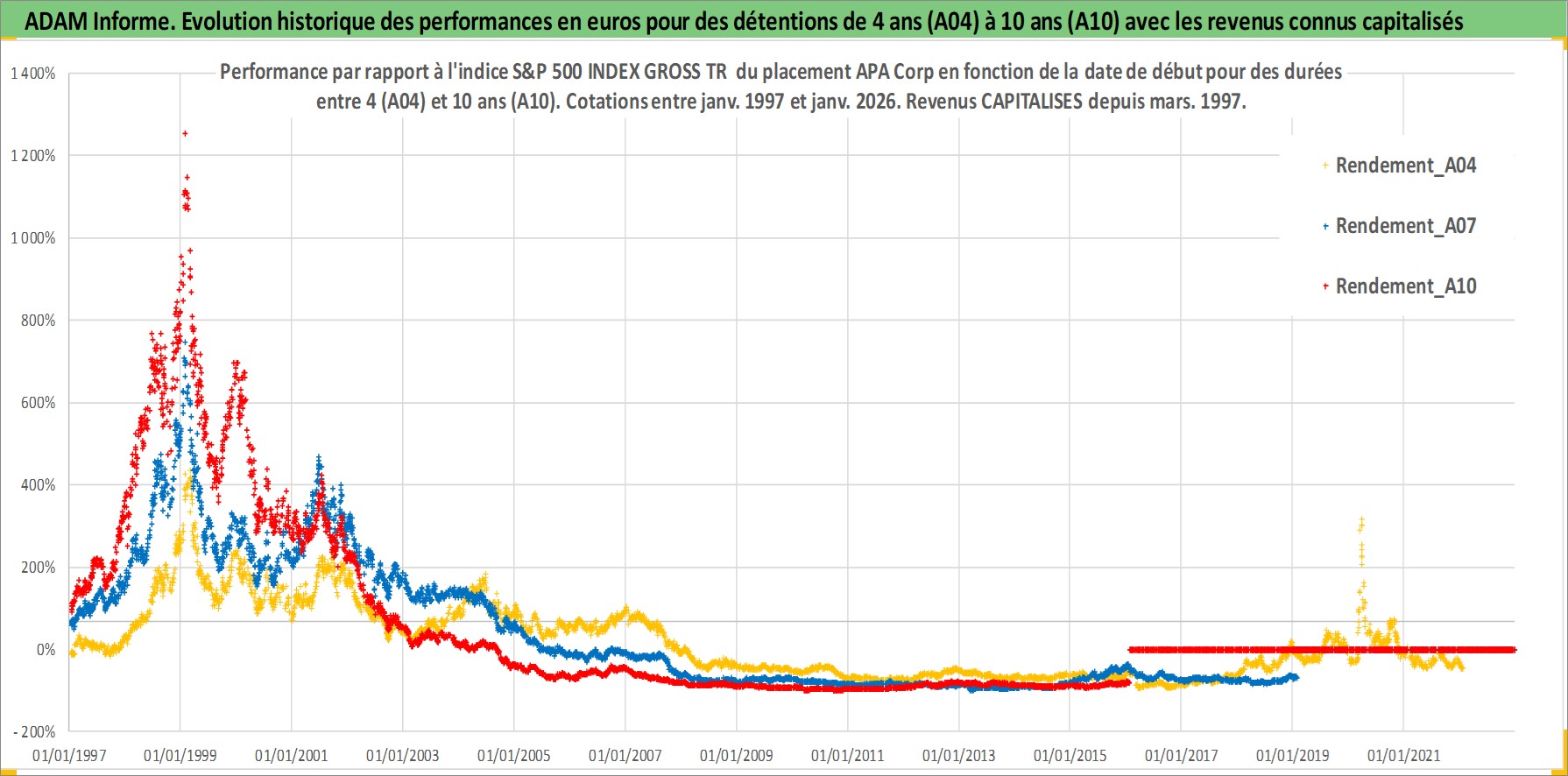Site dédié aux investisseursPage dédiée sur site financeAnalyse des valorisations hebdomadaires de l'action APA Corp. Cet actif est cote en USD. Les valorisations sont en contrevaleur EURO et couvrent les semaines 1997W01 a 2026W05. Les revenus de cet actif financier sont pris en compte depuis la semaine 1997W13. La note globale ESG de cet actif est estimee a 2.0 (apres rebasage entre 0 et 20).