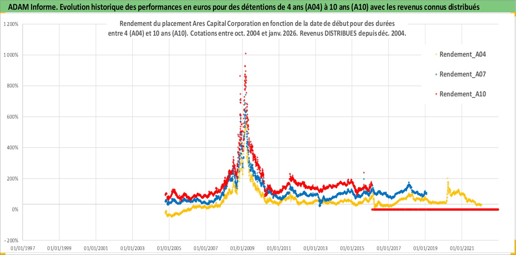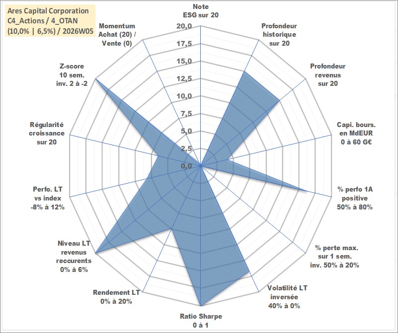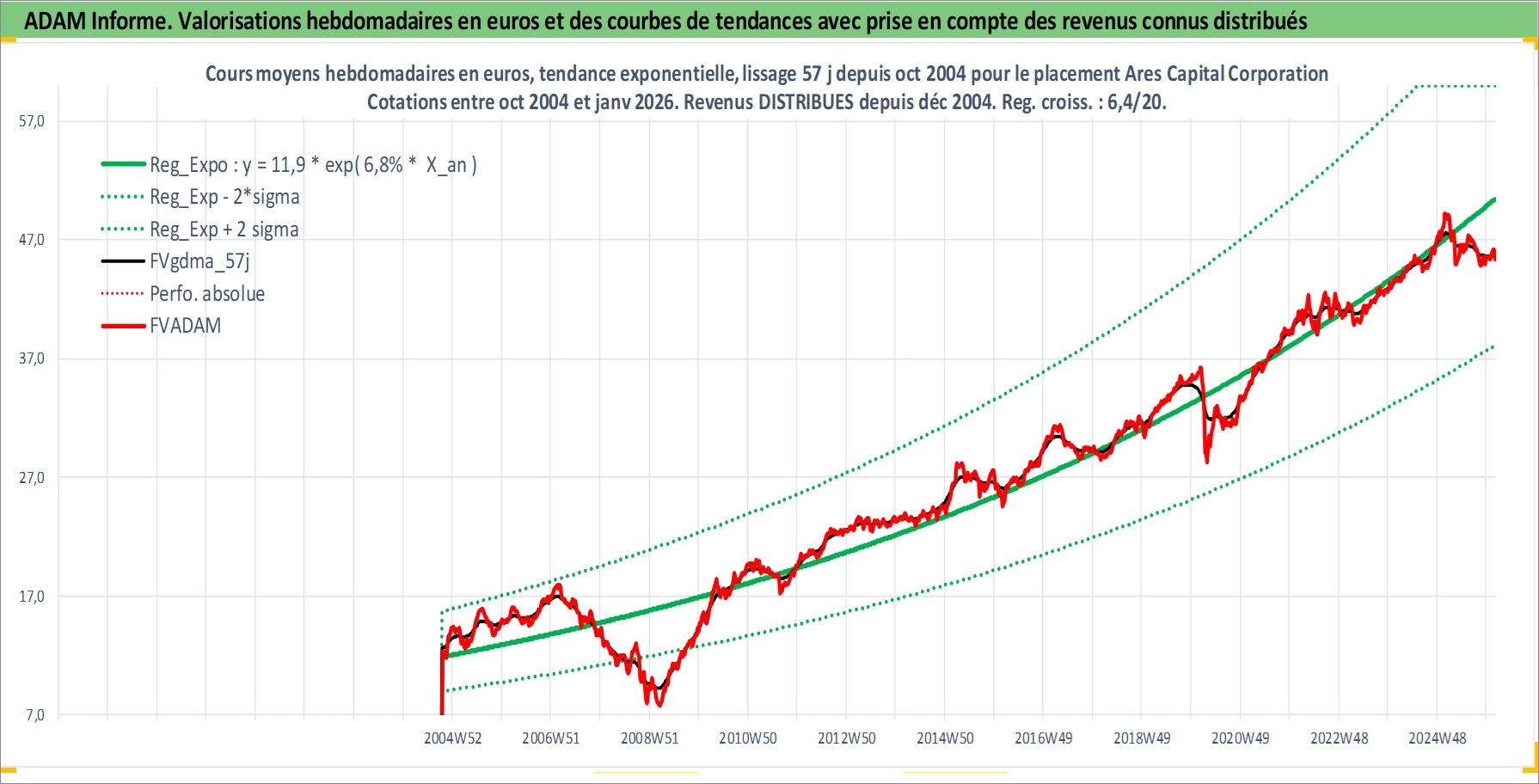 Site dédié aux investisseursPage dédiée sur site financeAnalyse des valorisations hebdomadaires de l'action Ares Capital Corporation. Cet actif est cote en USD. Les valorisations sont en contrevaleur EURO et couvrent les semaines 2004W41 a 2026W05. Les revenus de cet actif financier sont pris en compte depuis la semaine 2004W52. La note ESG de cet actif n'est pas connue.
