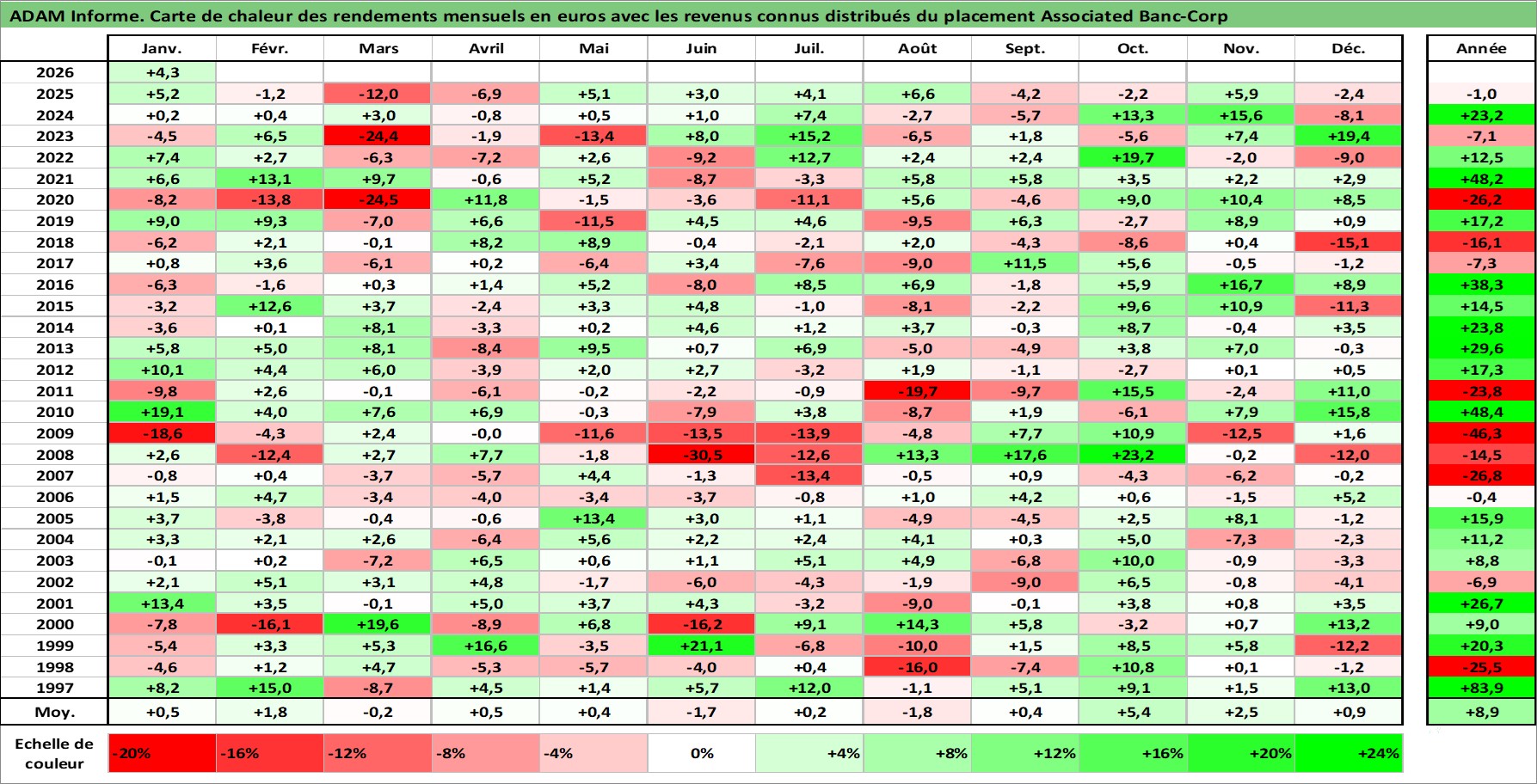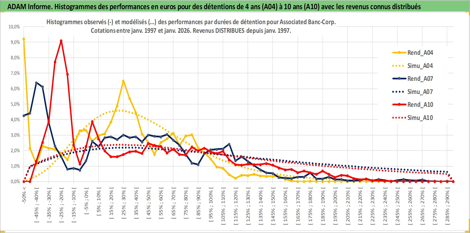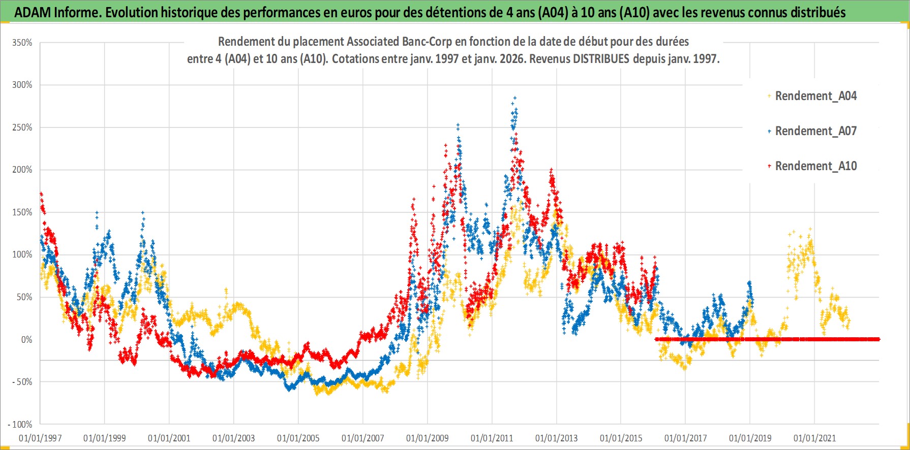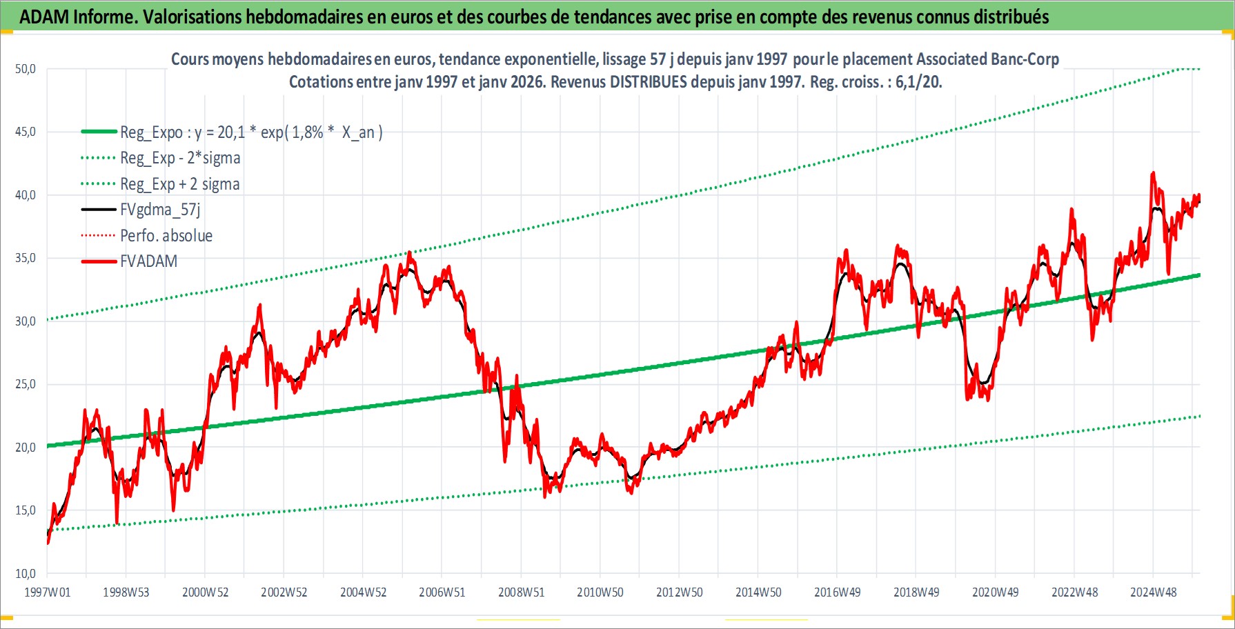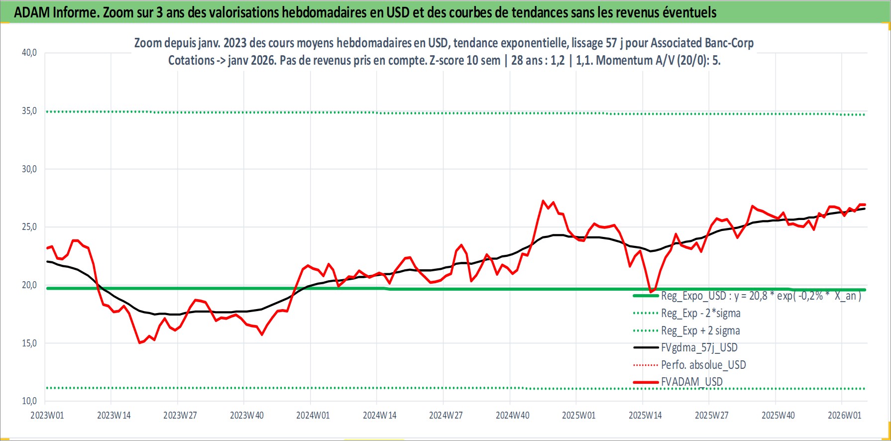 Site dédié aux investisseursPage dédiée sur site financeAnalyse des valorisations hebdomadaires de l'action Associated Banc-Corp. Cet actif est cote en USD. Les valorisations sont en contrevaleur EURO et couvrent les semaines 1997W01 a 2026W05. Les revenus de cet actif financier sont pris en compte depuis la semaine 1997W05. La note ESG de cet actif n'est pas connue.