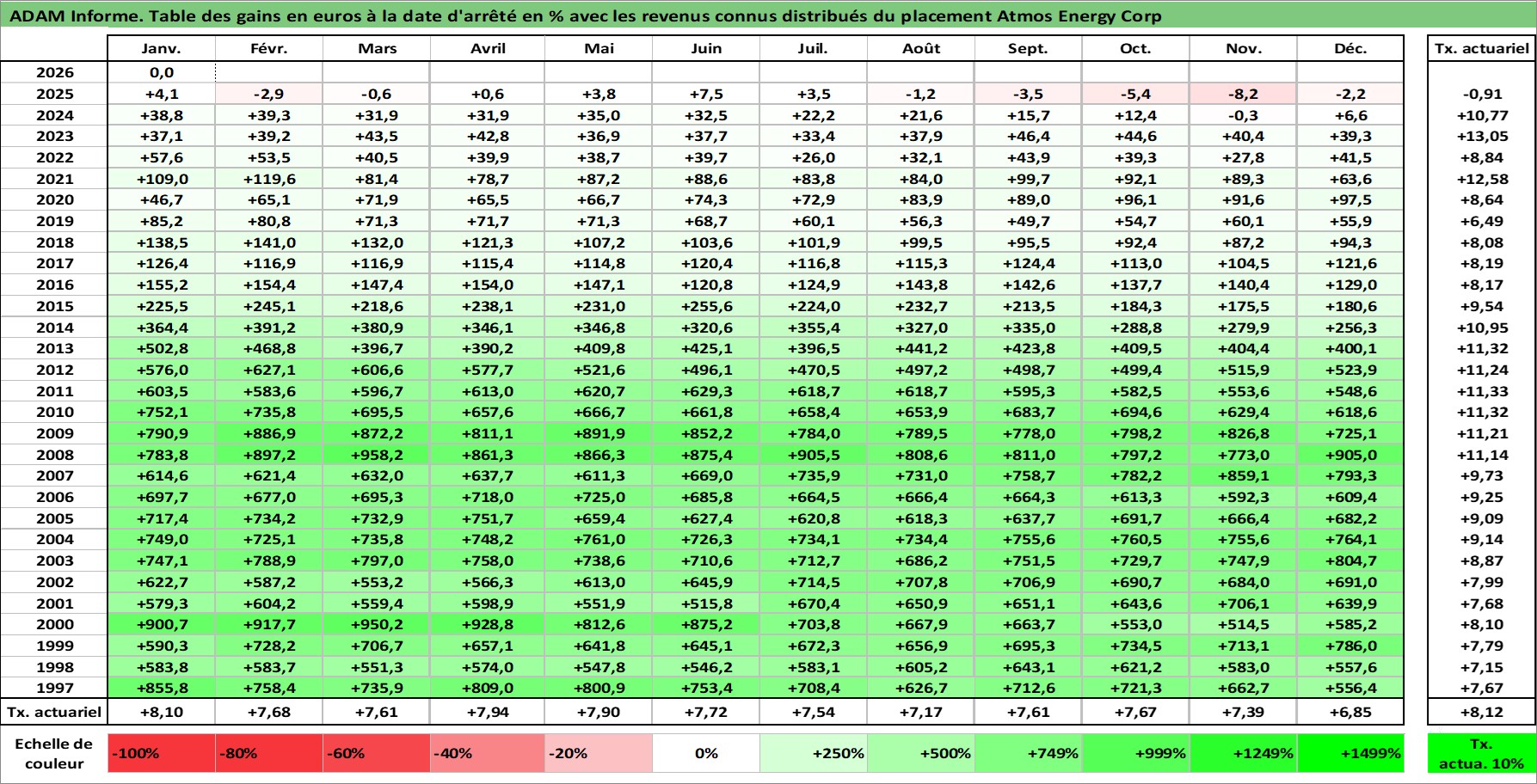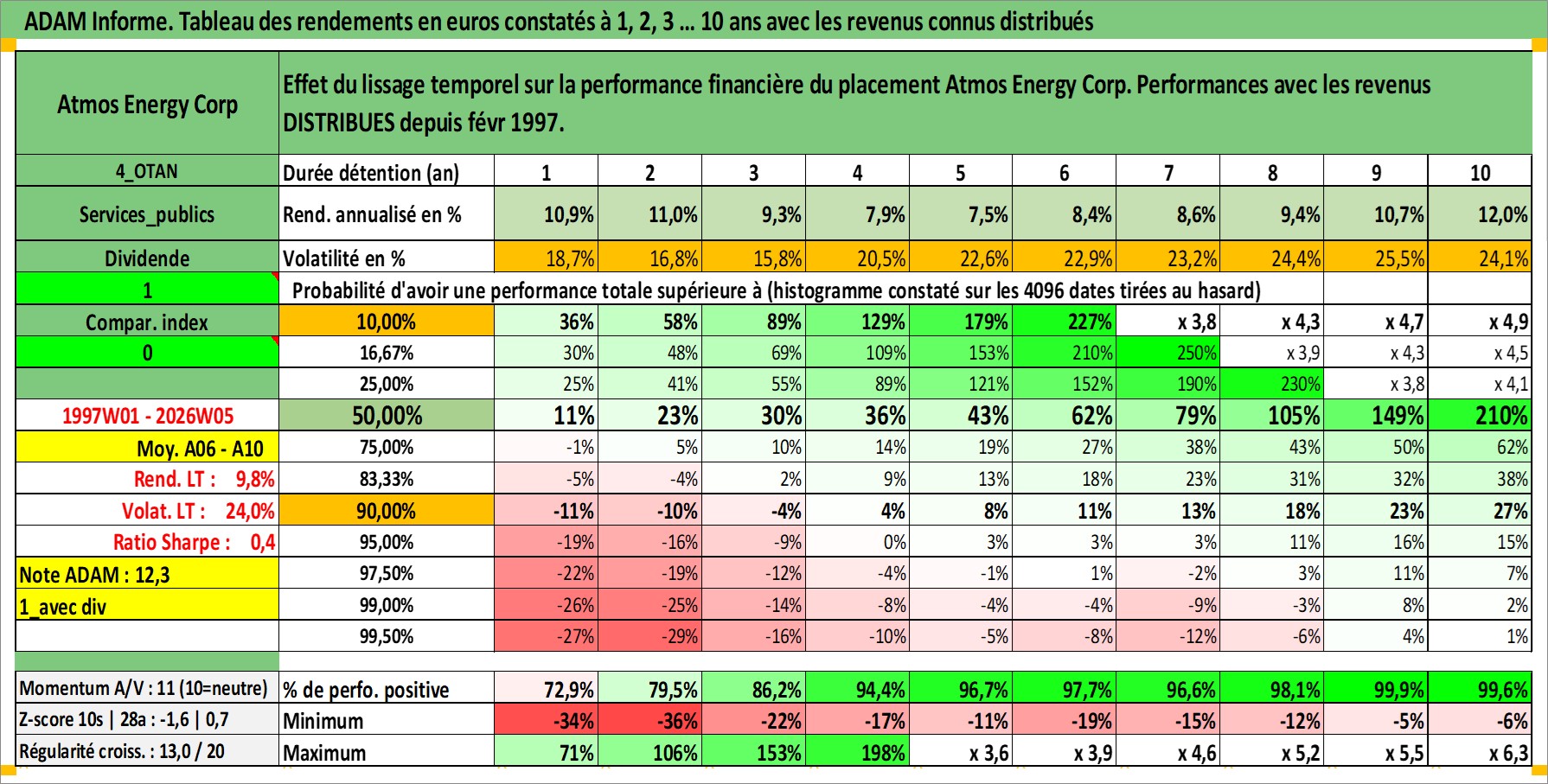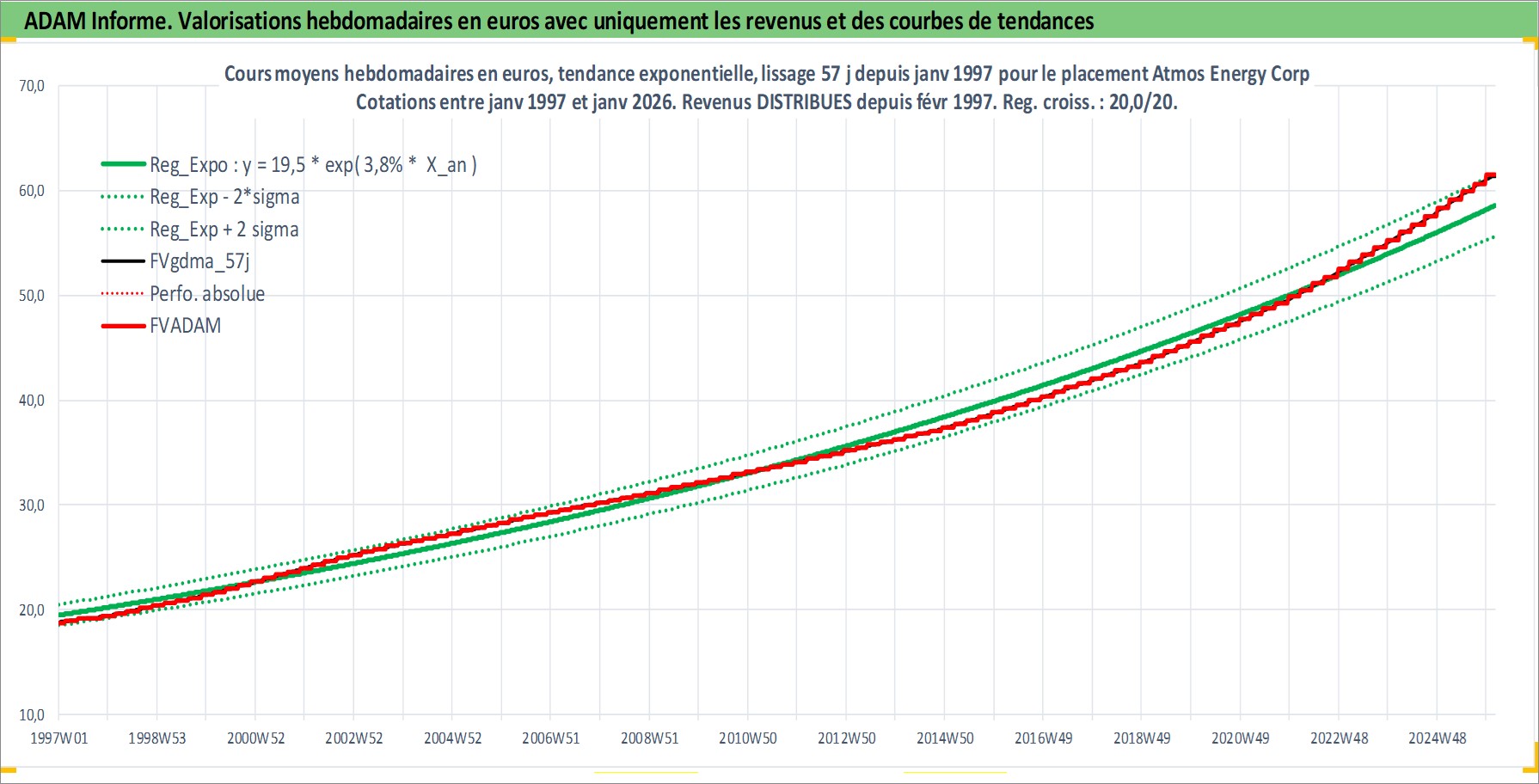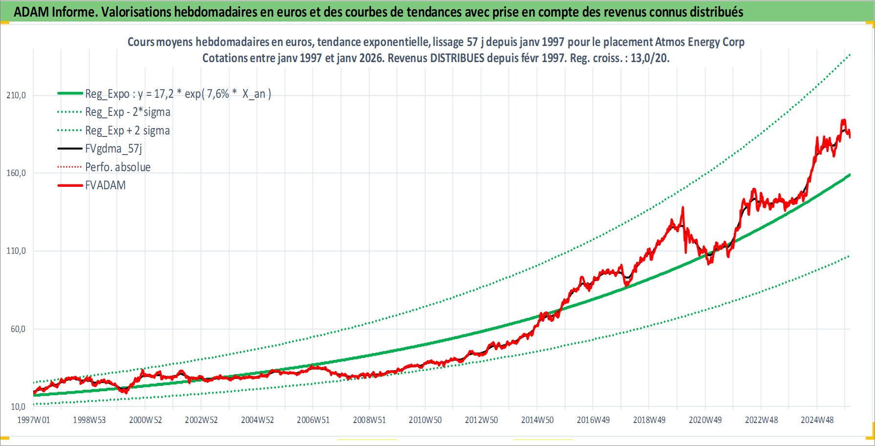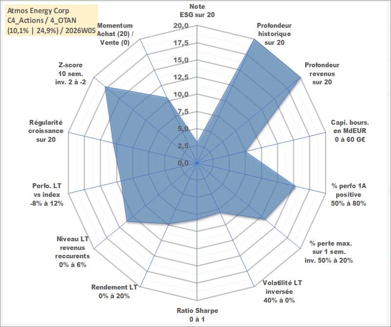 Site dédié aux investisseursPage dédiée sur site financeAnalyse des valorisations hebdomadaires de l'action Atmos Energy Corp. Cet actif est cote en USD. Les valorisations sont en contrevaleur EURO et couvrent les semaines 1997W01 a 2026W05. Les revenus de cet actif financier sont pris en compte depuis la semaine 1997W08. La note globale ESG de cet actif est estimee a 3.0 (apres rebasage entre 0 et 20).