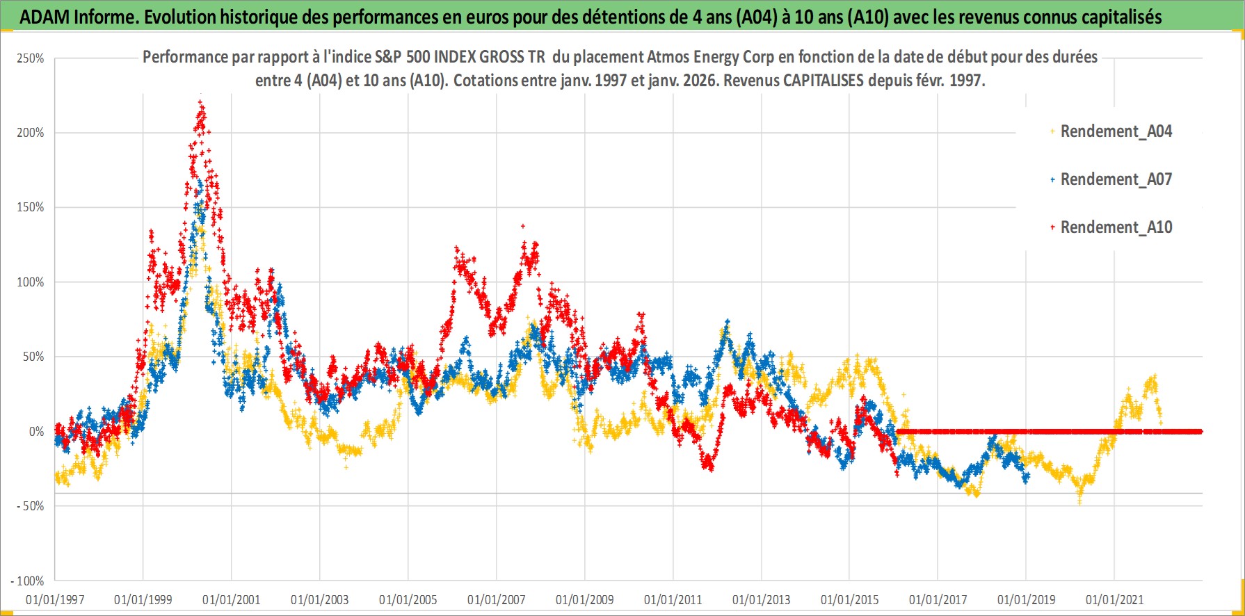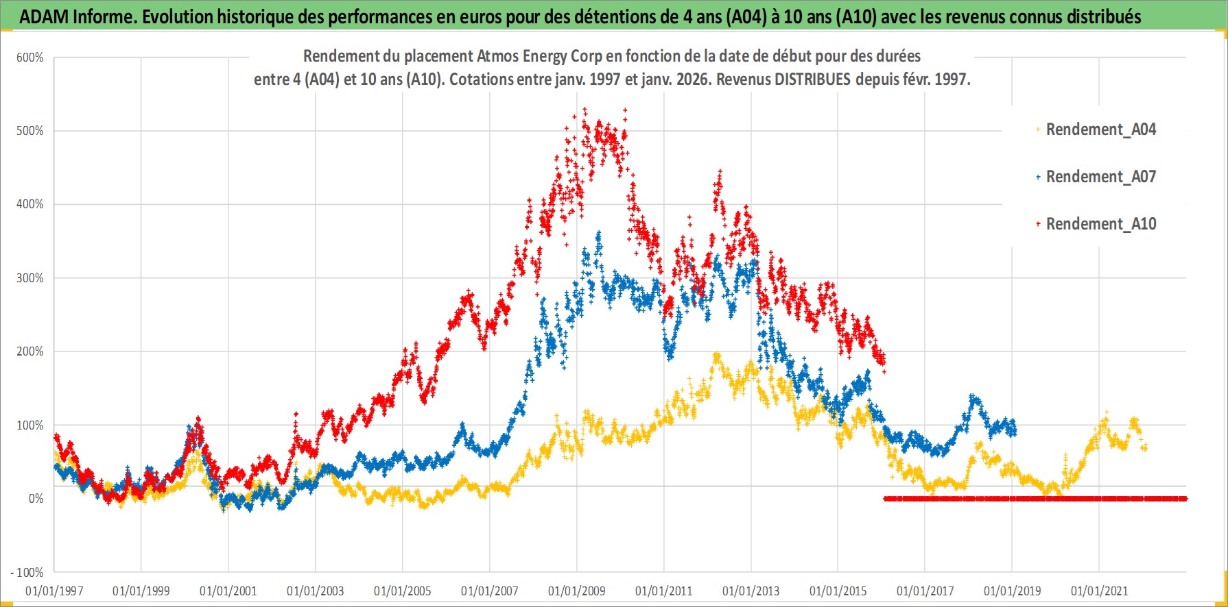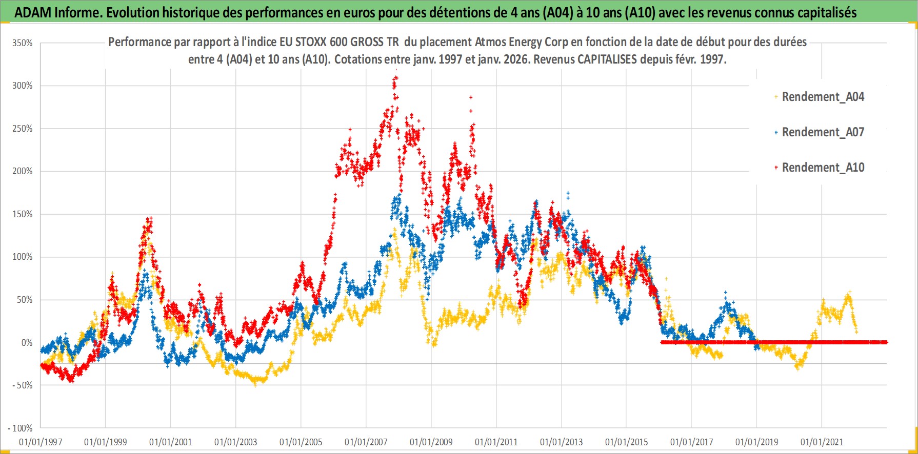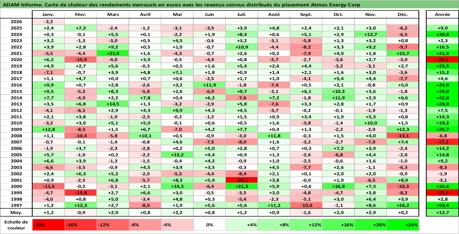 Site dédié aux investisseursPage dédiée sur site financeAnalyse des valorisations hebdomadaires de l'action Atmos Energy Corp. Cet actif est cote en USD. Les valorisations sont en contrevaleur EURO et couvrent les semaines 1997W01 a 2026W05. Les revenus de cet actif financier sont pris en compte depuis la semaine 1997W08. La note globale ESG de cet actif est estimee a 3.0 (apres rebasage entre 0 et 20).