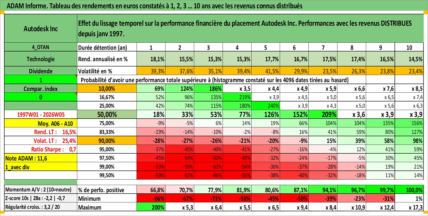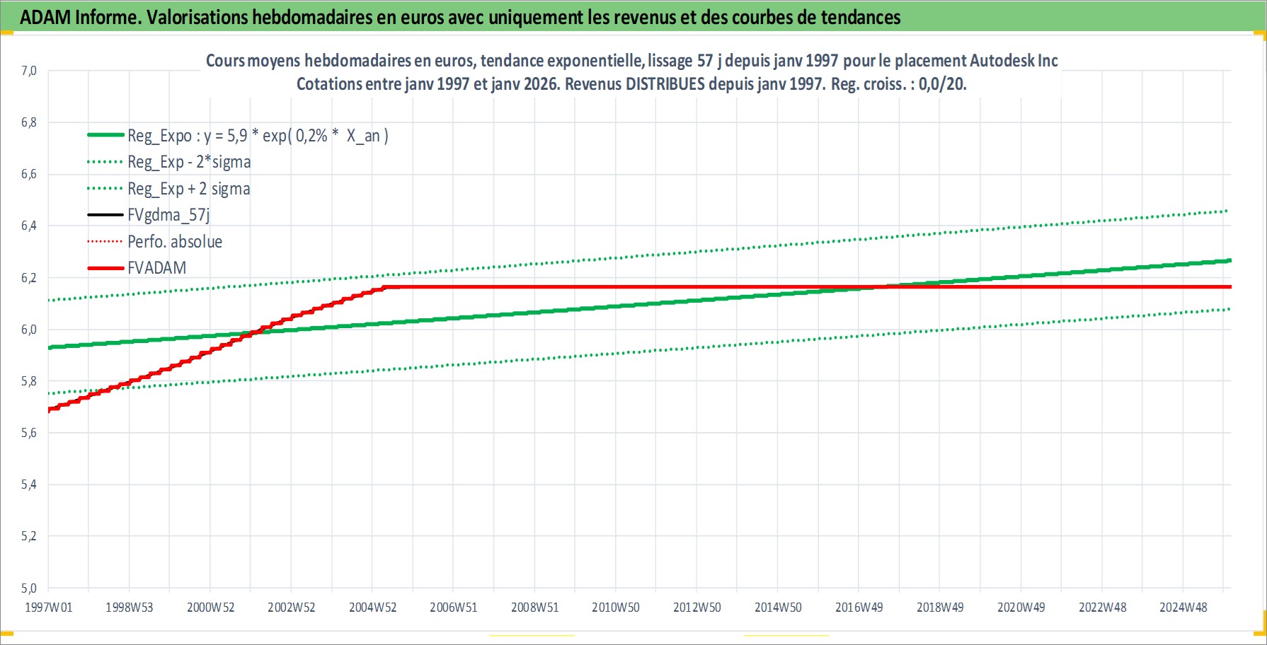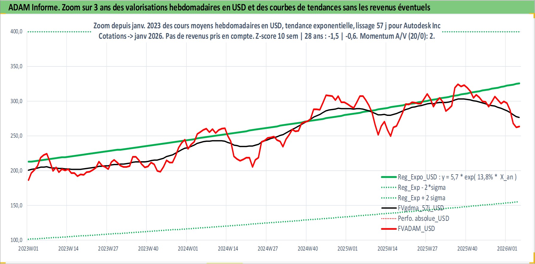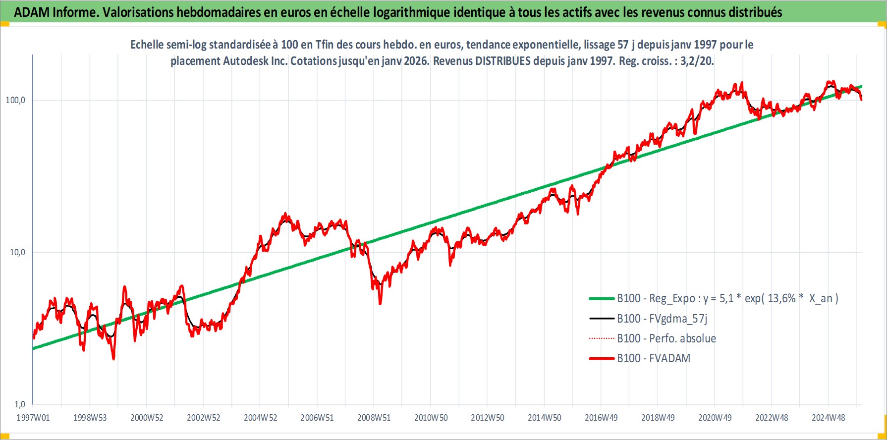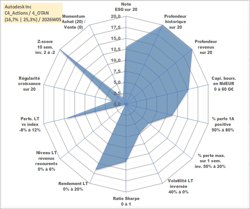 Site dédié aux investisseursPage dédiée sur site financeAnalyse des valorisations hebdomadaires de l'action Autodesk Inc. Cet actif est cote en USD. Les valorisations sont en contrevaleur EURO et couvrent les semaines 1997W01 a 2026W05. Les revenus de cet actif financier sont pris en compte depuis la semaine 1997W02. La note globale ESG de cet actif est estimee a 13.0 (apres rebasage entre 0 et 20).