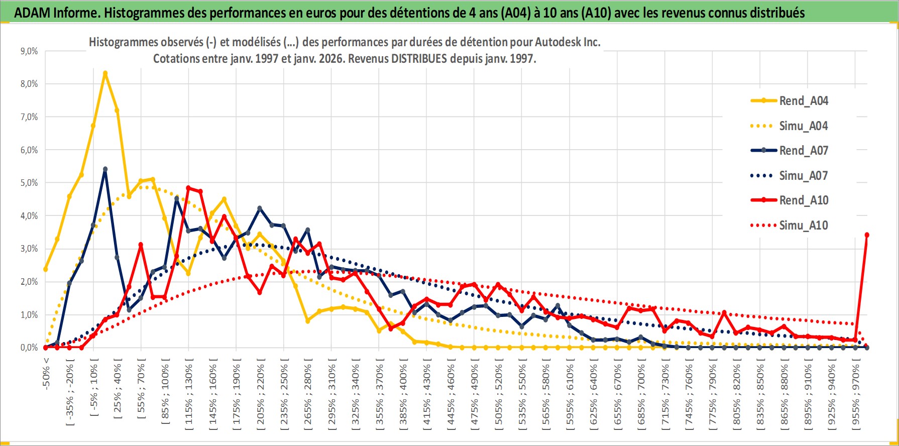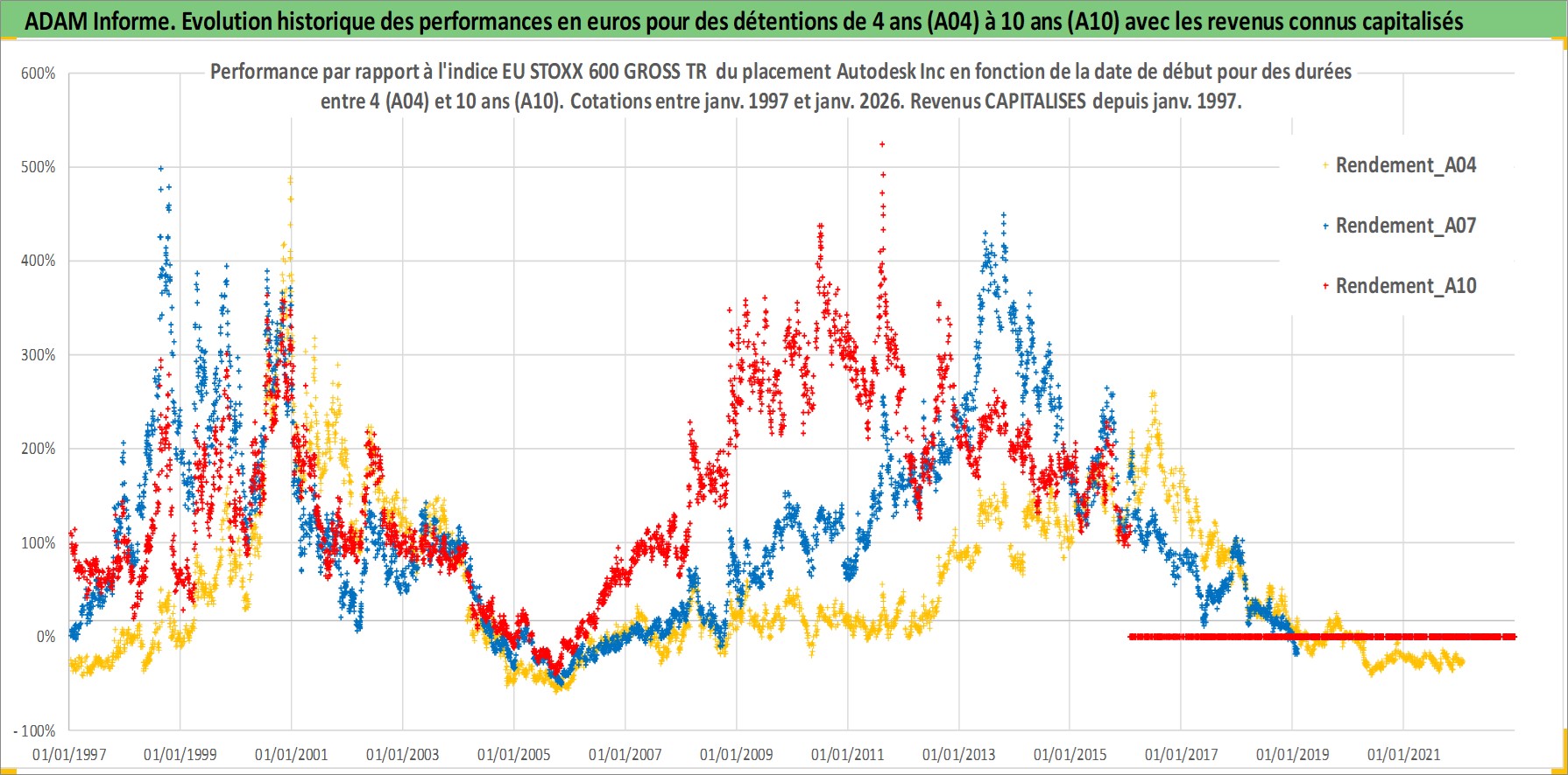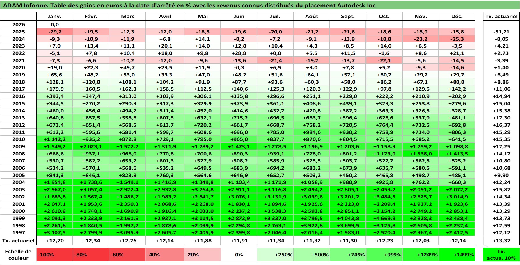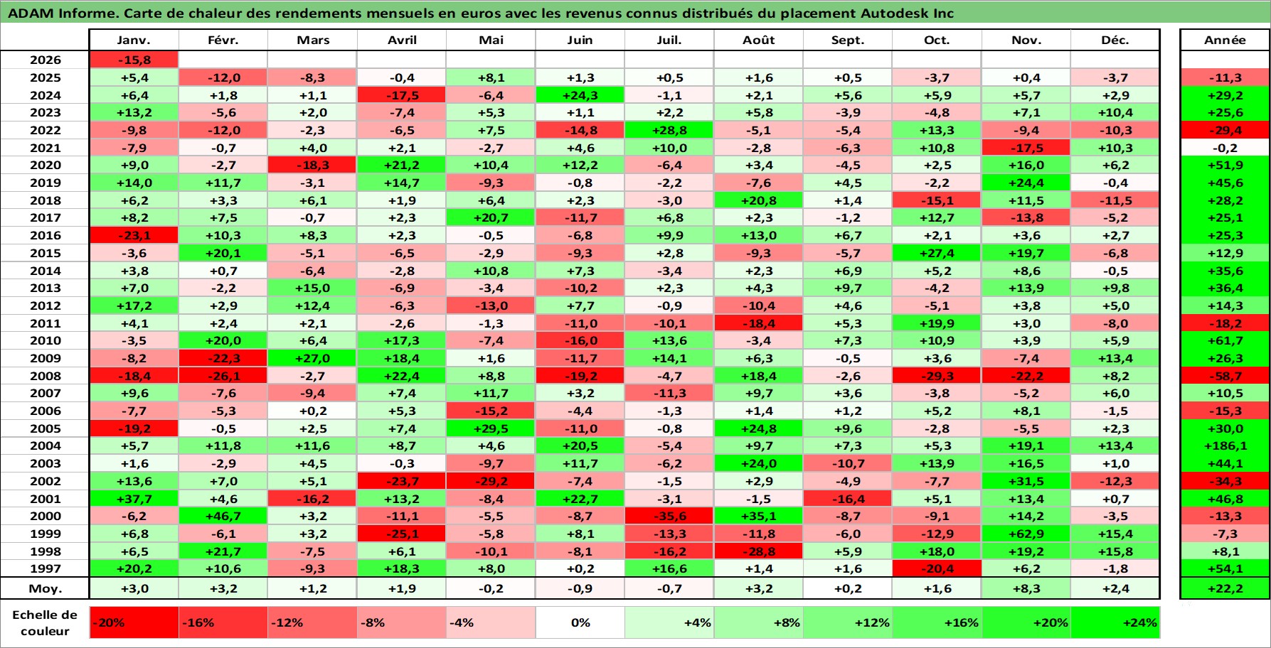 Site dédié aux investisseursPage dédiée sur site financeAnalyse des valorisations hebdomadaires de l'action Autodesk Inc. Cet actif est cote en USD. Les valorisations sont en contrevaleur EURO et couvrent les semaines 1997W01 a 2026W05. Les revenus de cet actif financier sont pris en compte depuis la semaine 1997W02. La note globale ESG de cet actif est estimee a 13.0 (apres rebasage entre 0 et 20).