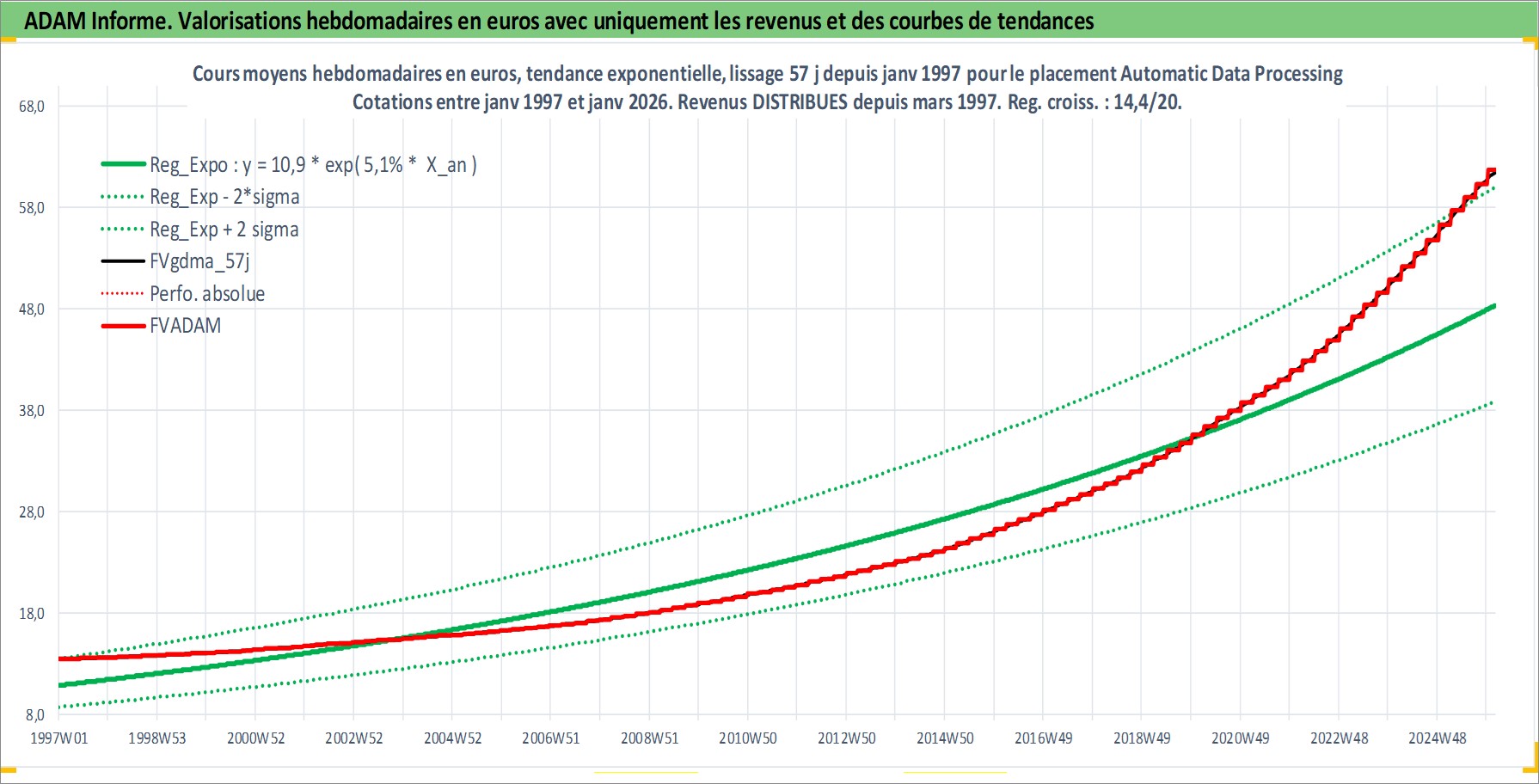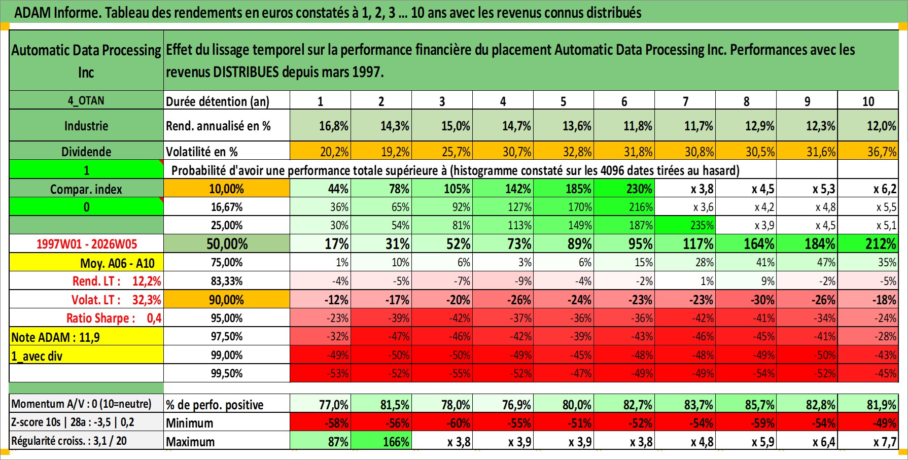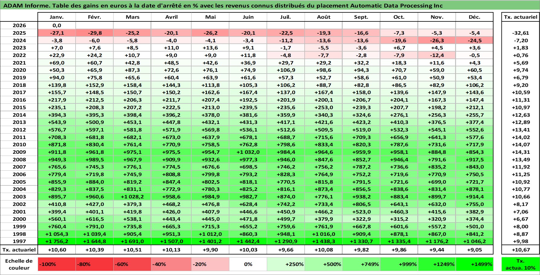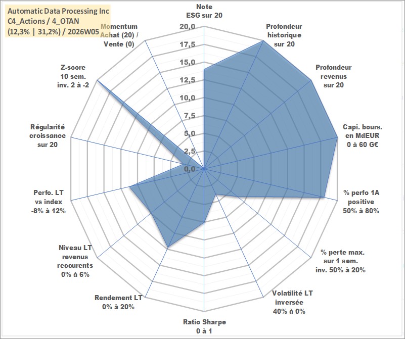 Site dédié aux investisseursPage dédiée sur site financeAnalyse des valorisations hebdomadaires de l'action Automatic Data Processing Inc. Cet actif est cote en USD. Les valorisations sont en contrevaleur EURO et couvrent les semaines 1997W01 a 2026W05. Les revenus de cet actif financier sont pris en compte depuis la semaine 1997W11. La note globale ESG de cet actif est estimee a 14.0 (apres rebasage entre 0 et 20).