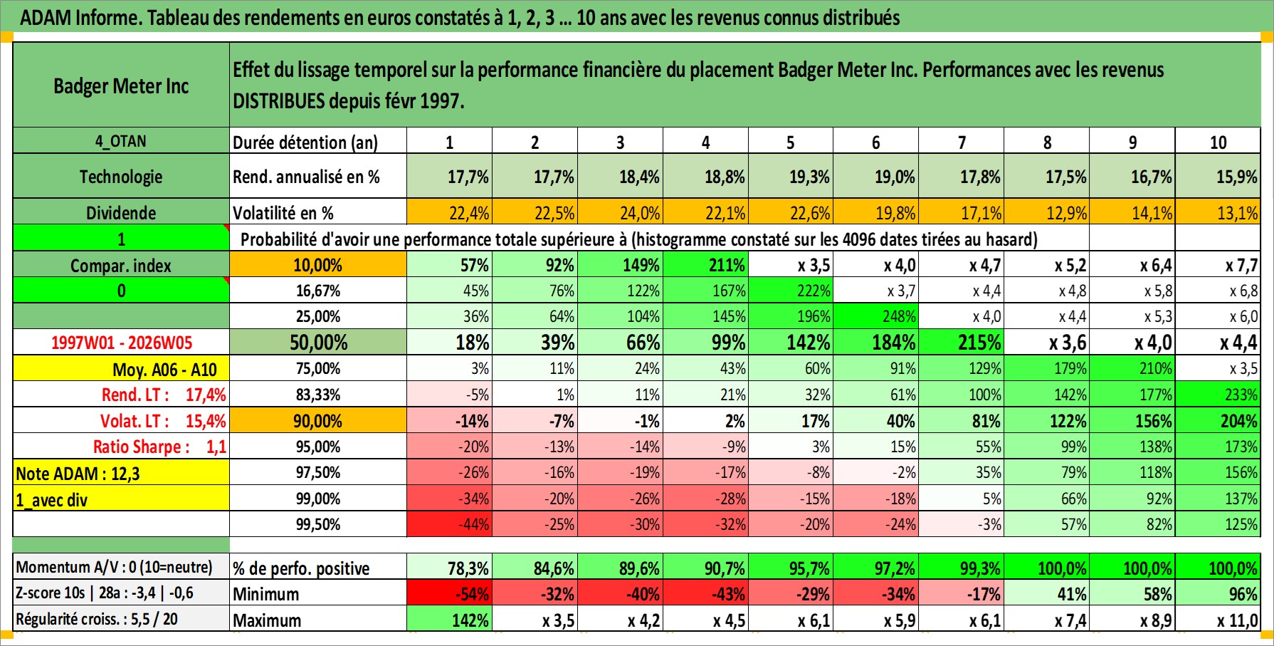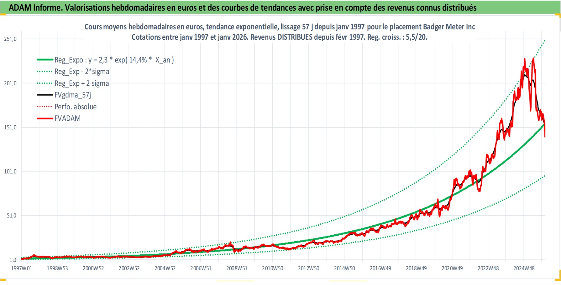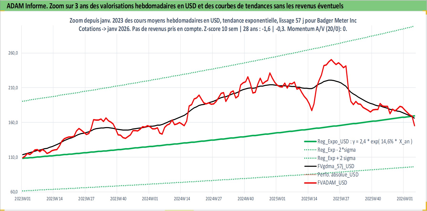 Site dédié aux investisseursPage dédiée sur site financeAnalyse des valorisations hebdomadaires de l'action Badger Meter Inc. Cet actif est cote en USD. Les valorisations sont en contrevaleur EURO et couvrent les semaines 1997W01 a 2026W05. Les revenus de cet actif financier sont pris en compte depuis la semaine 1997W09. La note ESG de cet actif n'est pas connue.