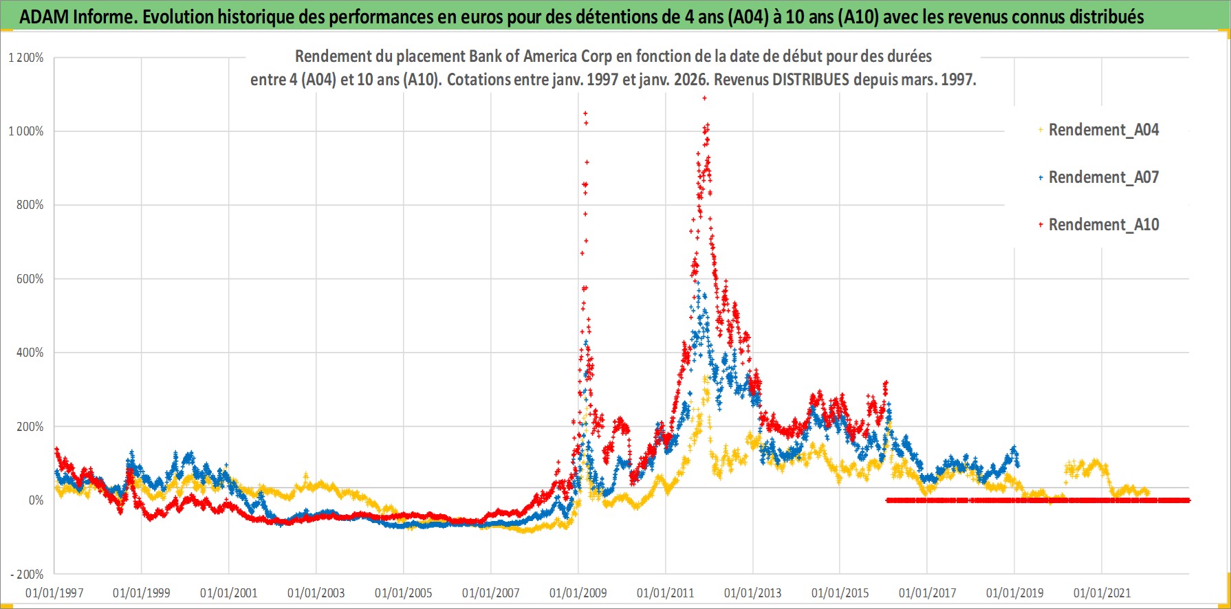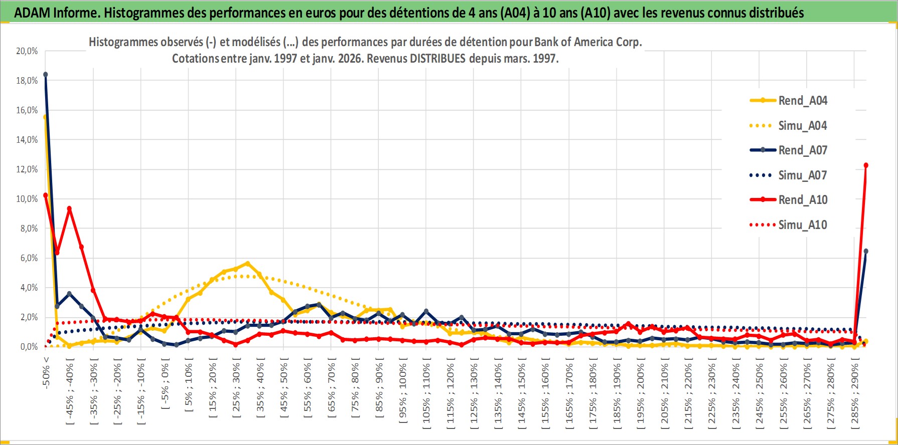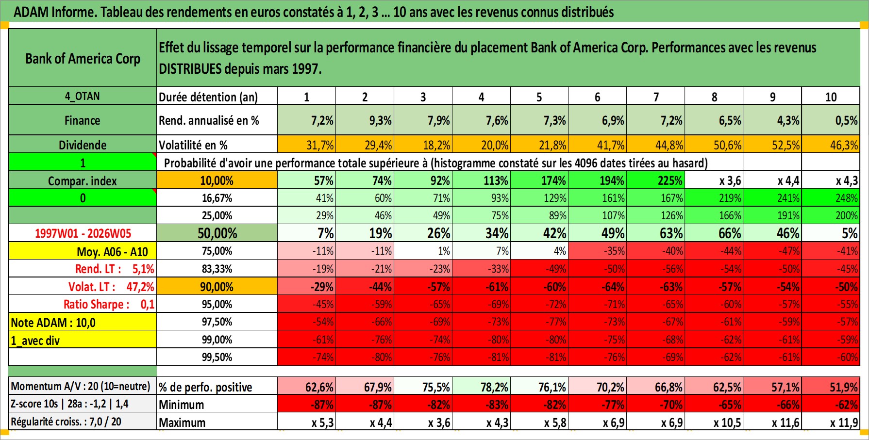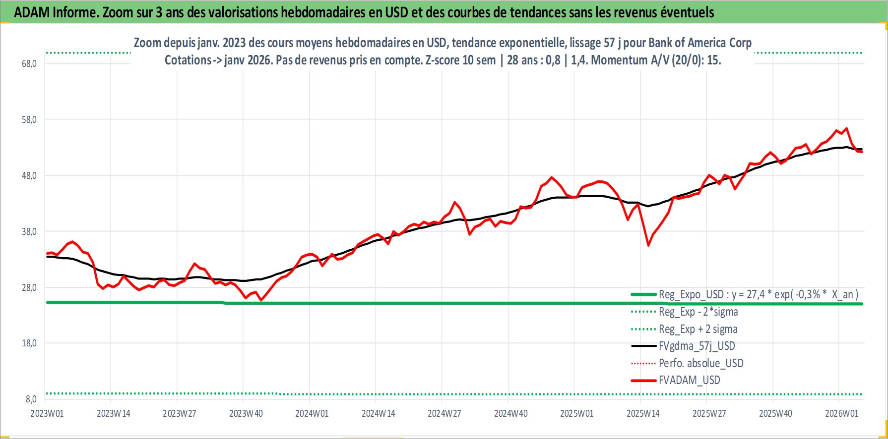 Site dédié aux investisseursPage dédiée sur site financeAnalyse des valorisations hebdomadaires de l'action Bank of America Corp. Cet actif est cote en USD. Les valorisations sont en contrevaleur EURO et couvrent les semaines 1997W01 a 2026W05. Les revenus de cet actif financier sont pris en compte depuis la semaine 1997W10. La note globale ESG de cet actif est estimee a 7.0 (apres rebasage entre 0 et 20).