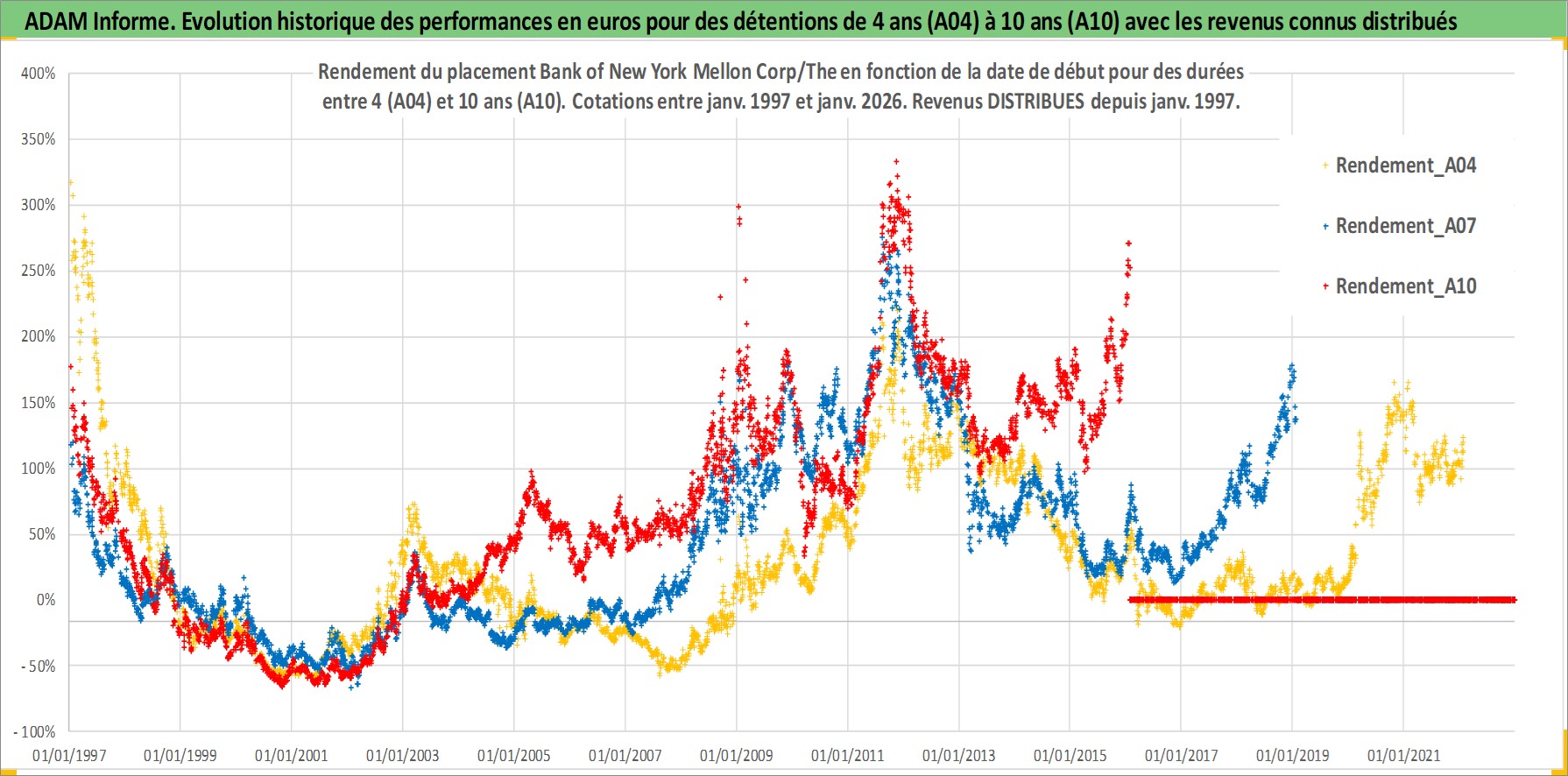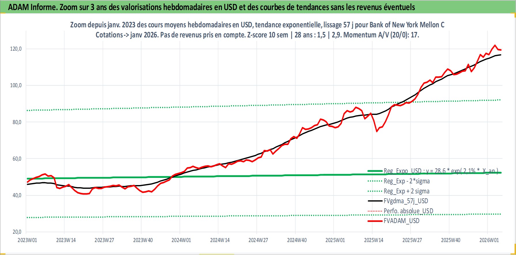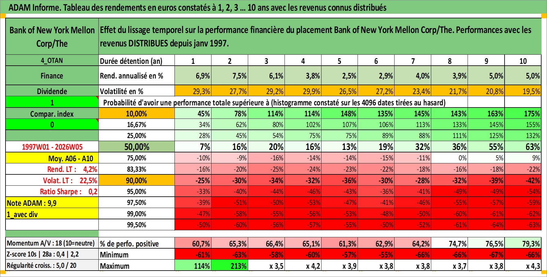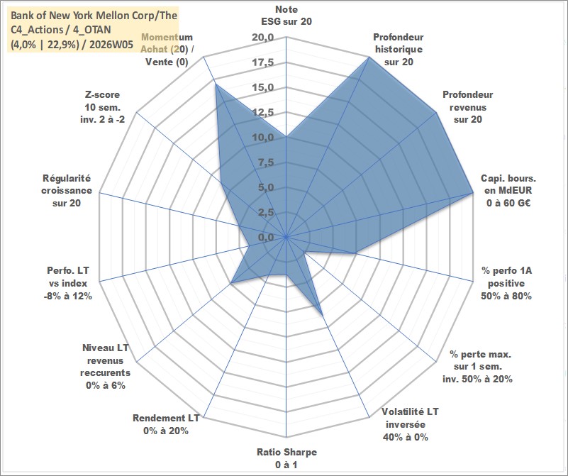 Site dédié aux investisseursPage dédiée sur site financeAnalyse des valorisations hebdomadaires de l'action Bank of New York Mellon Corp/The. Cet actif est cote en USD. Les valorisations sont en contrevaleur EURO et couvrent les semaines 1997W01 a 2026W05. Les revenus de cet actif financier sont pris en compte depuis la semaine 1997W04. La note globale ESG de cet actif est estimee a 10.0 (apres rebasage entre 0 et 20).