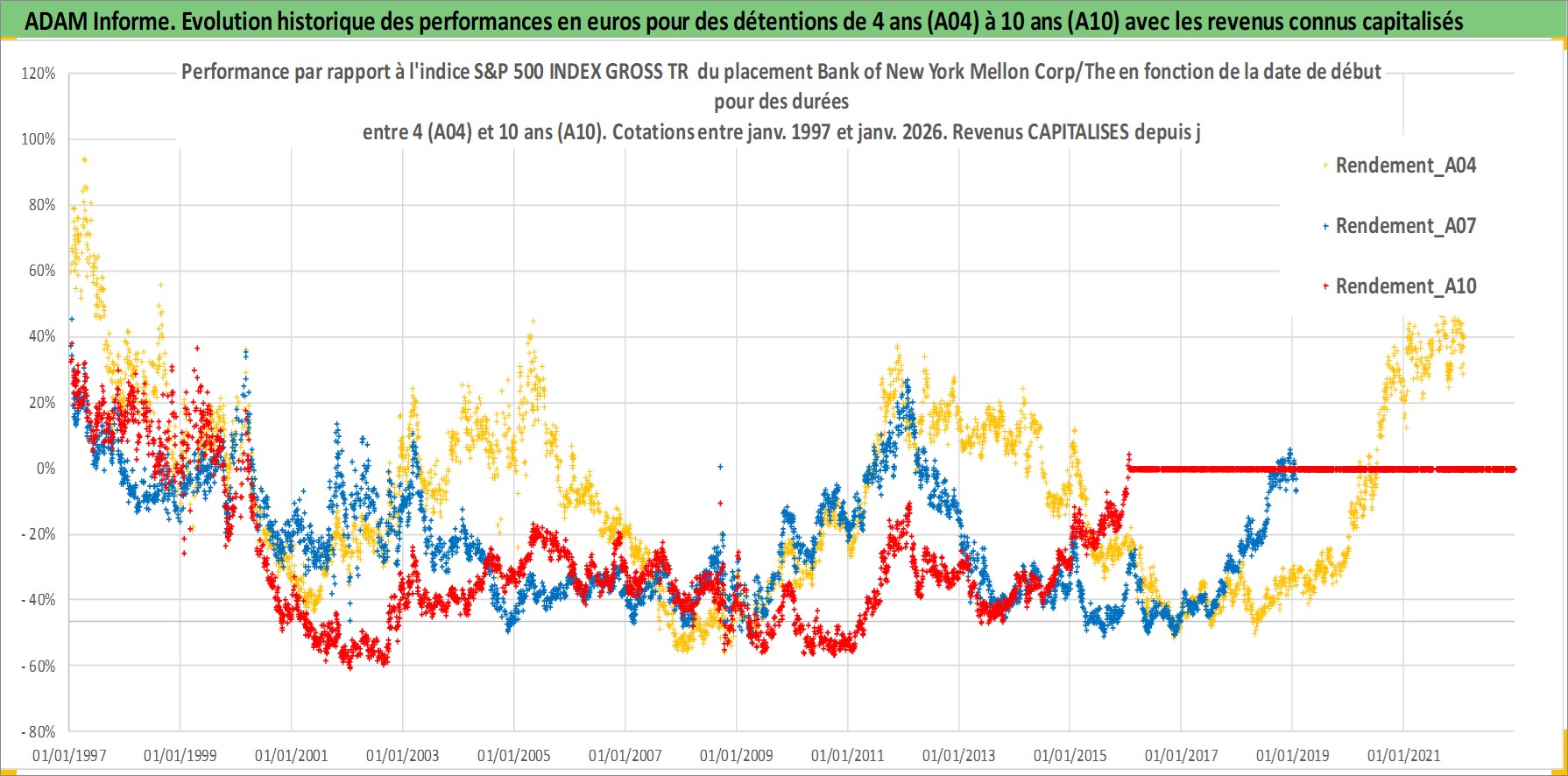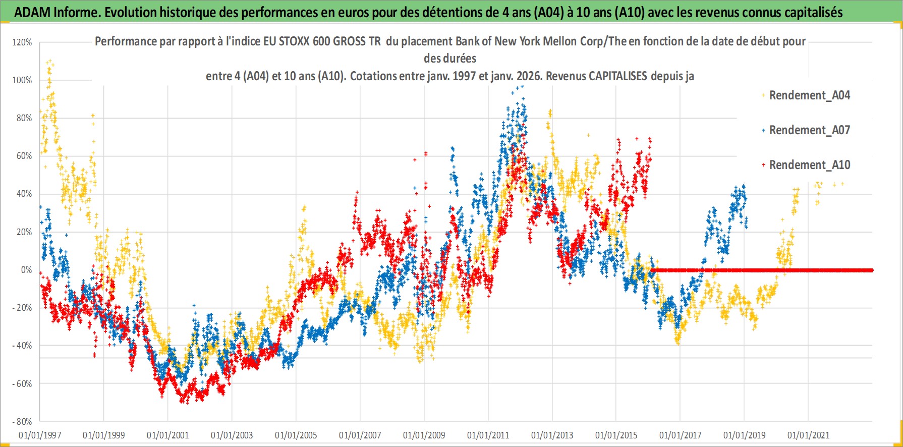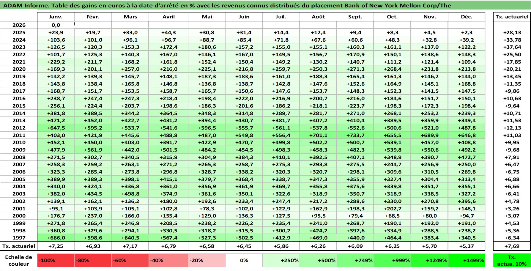 Site dédié aux investisseursPage dédiée sur site financeAnalyse des valorisations hebdomadaires de l'action Bank of New York Mellon Corp/The. Cet actif est cote en USD. Les valorisations sont en contrevaleur EURO et couvrent les semaines 1997W01 a 2026W05. Les revenus de cet actif financier sont pris en compte depuis la semaine 1997W04. La note globale ESG de cet actif est estimee a 10.0 (apres rebasage entre 0 et 20).