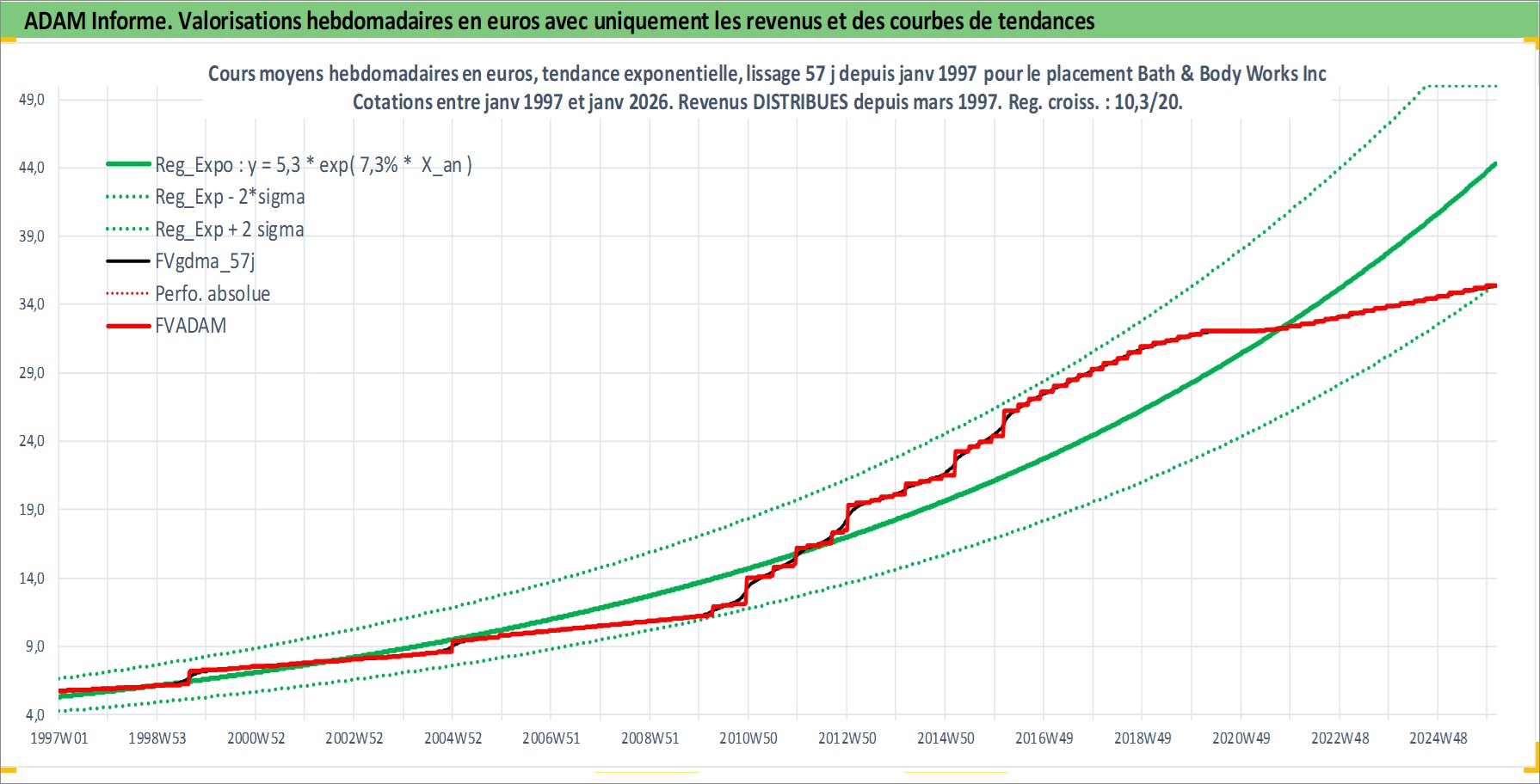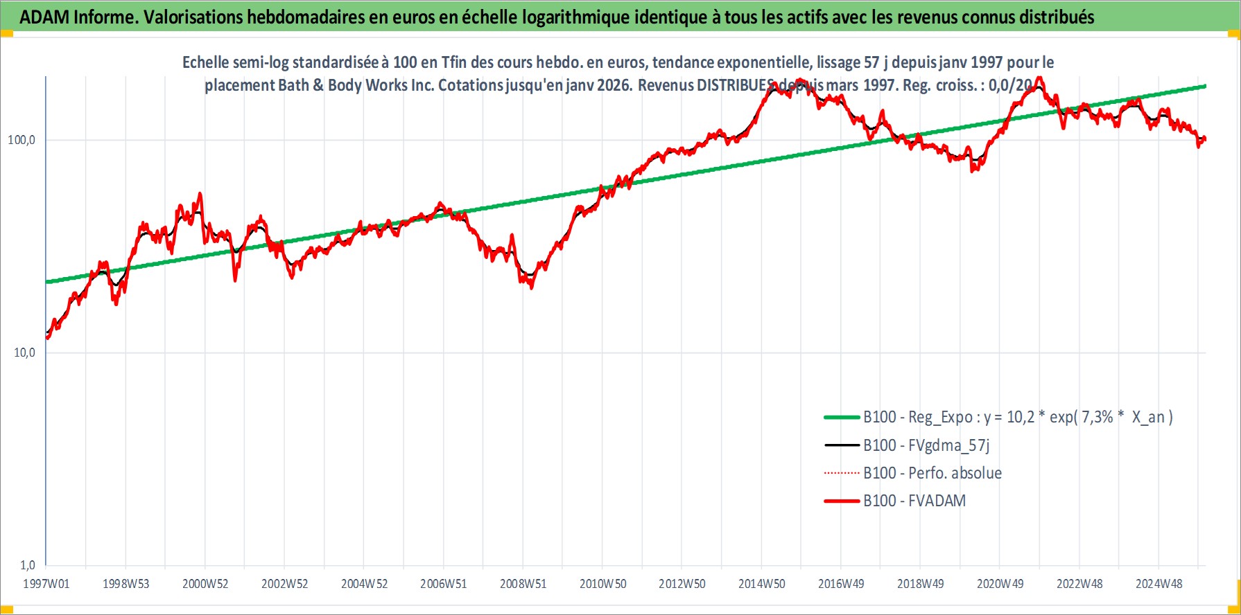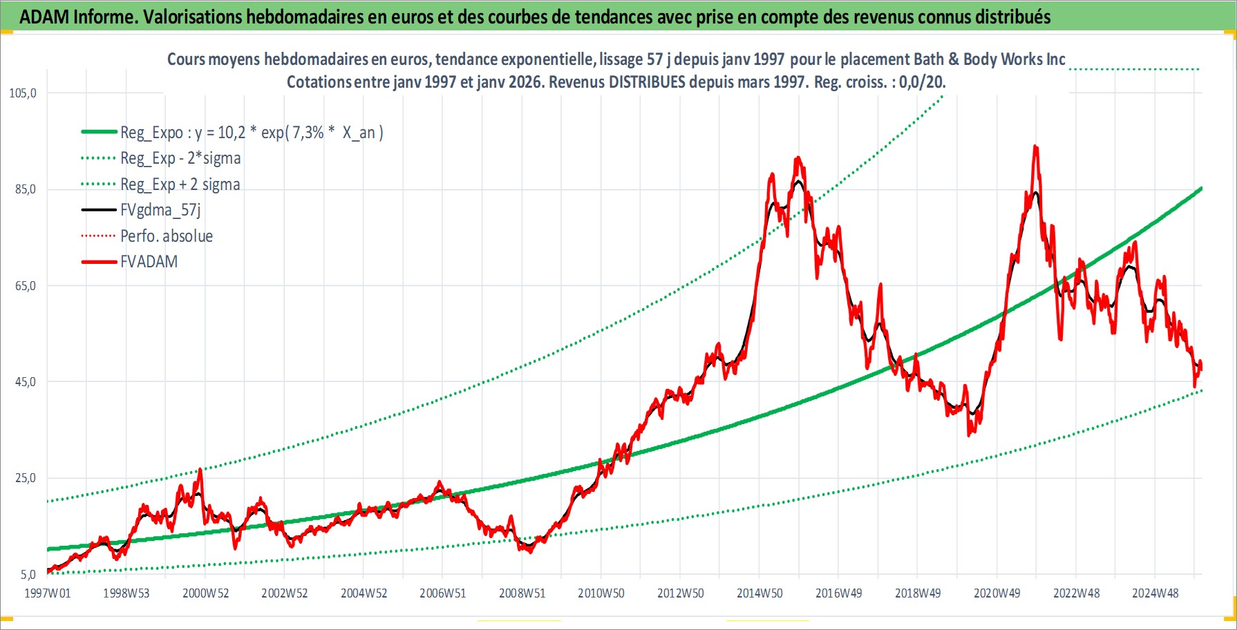 Site dédié aux investisseursPage dédiée sur site financeAnalyse des valorisations hebdomadaires de l'action Bath & Body Works Inc. Cet actif est cote en USD. Les valorisations sont en contrevaleur EURO et couvrent les semaines 1997W01 a 2026W05. Les revenus de cet actif financier sont pris en compte depuis la semaine 1997W10. La note globale ESG de cet actif est estimee a 13.0 (apres rebasage entre 0 et 20).