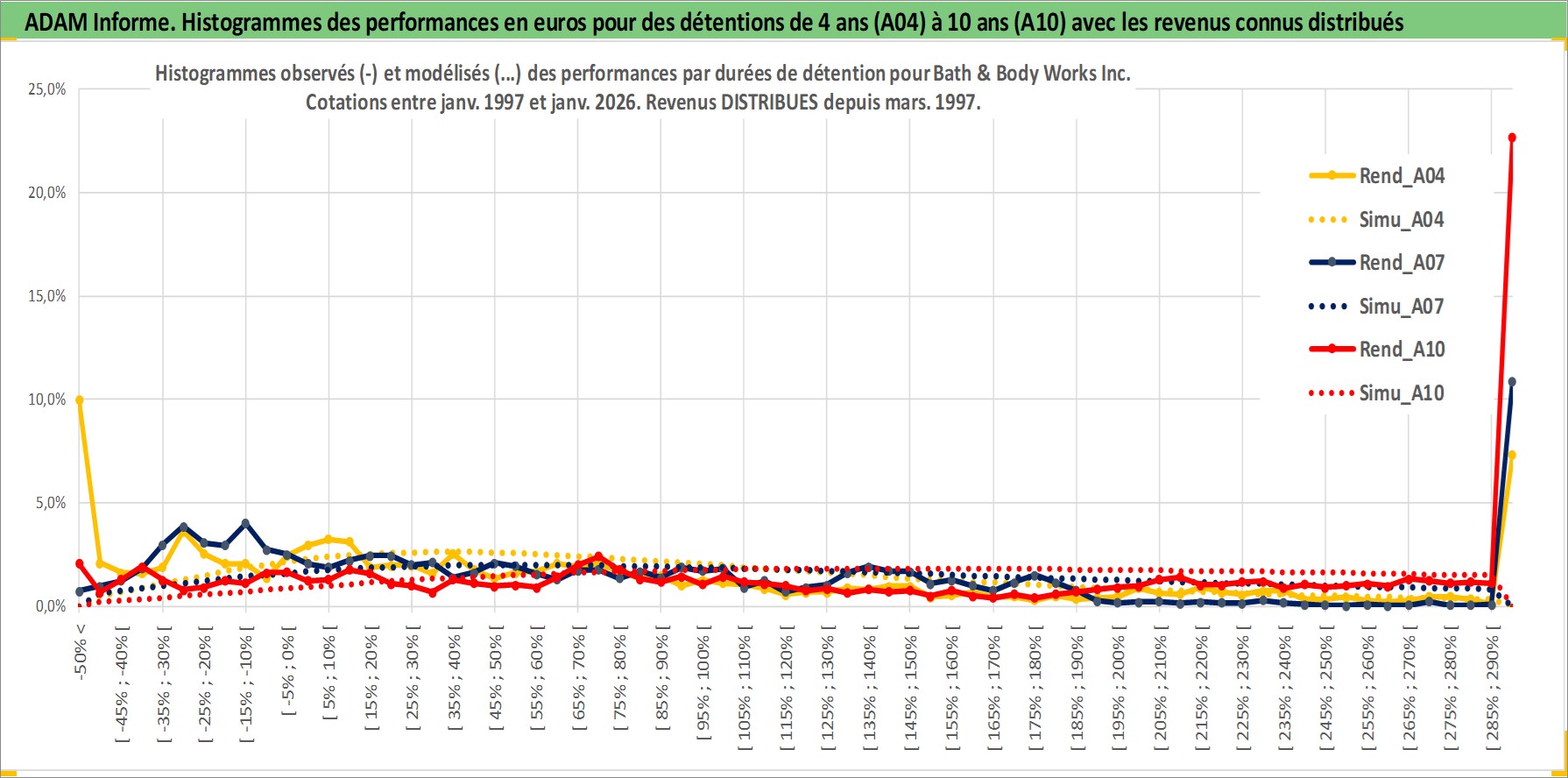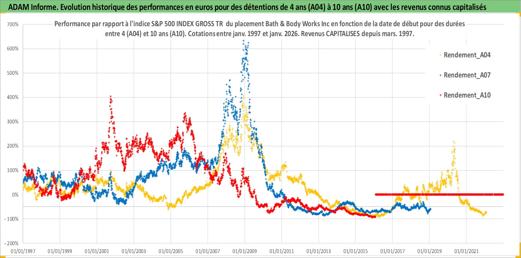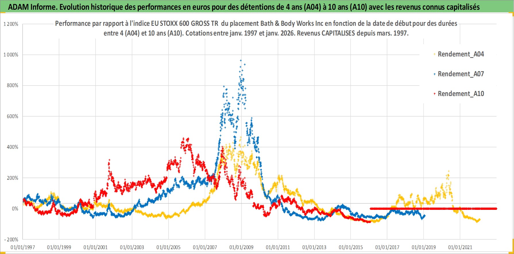 Site dédié aux investisseursPage dédiée sur site financeAnalyse des valorisations hebdomadaires de l'action Bath & Body Works Inc. Cet actif est cote en USD. Les valorisations sont en contrevaleur EURO et couvrent les semaines 1997W01 a 2026W05. Les revenus de cet actif financier sont pris en compte depuis la semaine 1997W10. La note globale ESG de cet actif est estimee a 13.0 (apres rebasage entre 0 et 20).