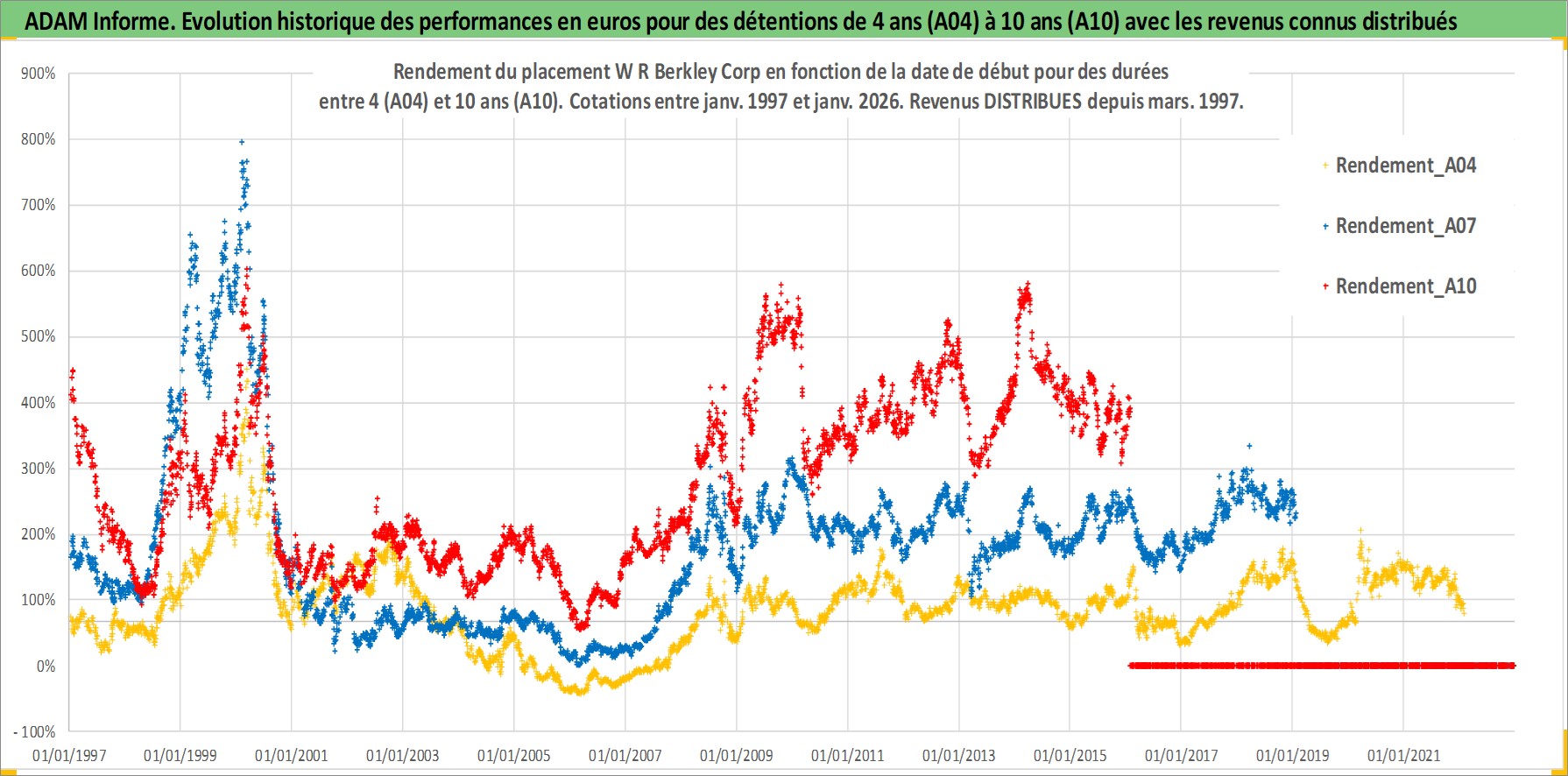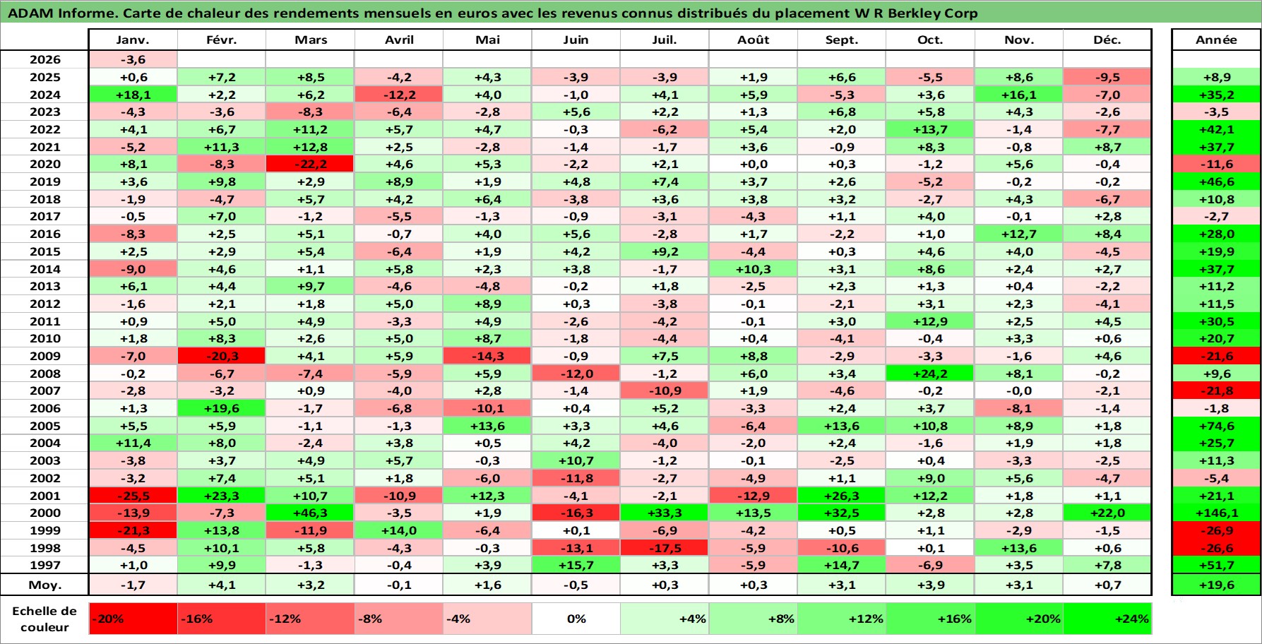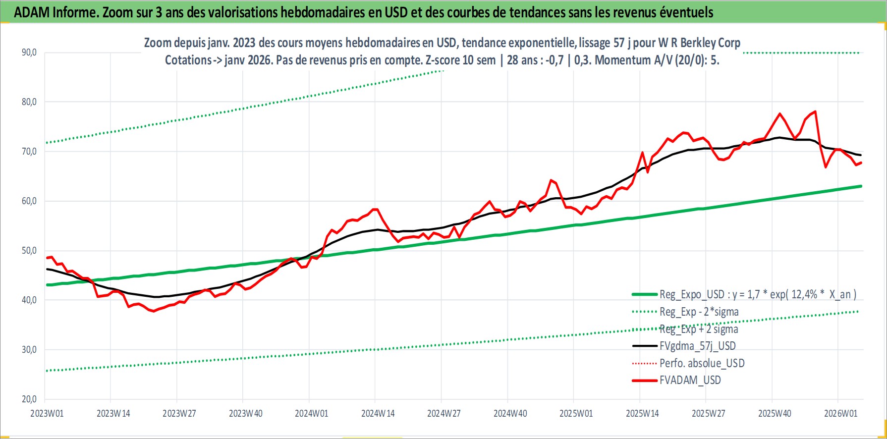 Site dédié aux investisseursPage dédiée sur site financeAnalyse des valorisations hebdomadaires de l'action W R Berkley Corp. Cet actif est cote en USD. Les valorisations sont en contrevaleur EURO et couvrent les semaines 1997W01 a 2026W05. Les revenus de cet actif financier sont pris en compte depuis la semaine 1997W12. La note globale ESG de cet actif est estimee a 9.0 (apres rebasage entre 0 et 20).
