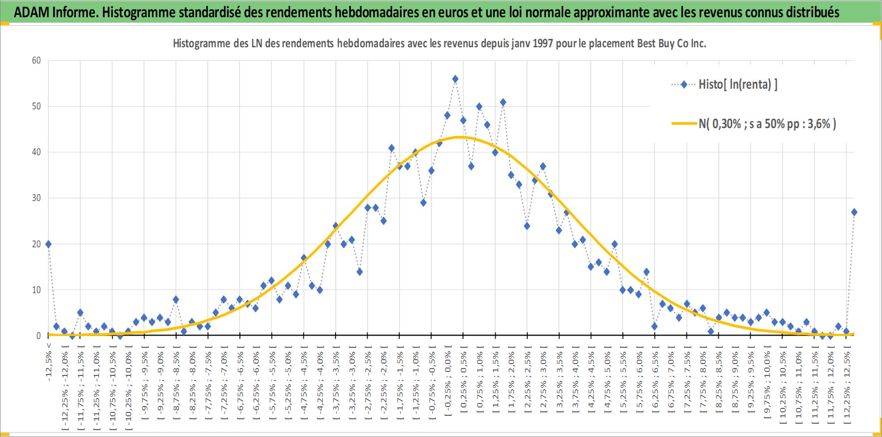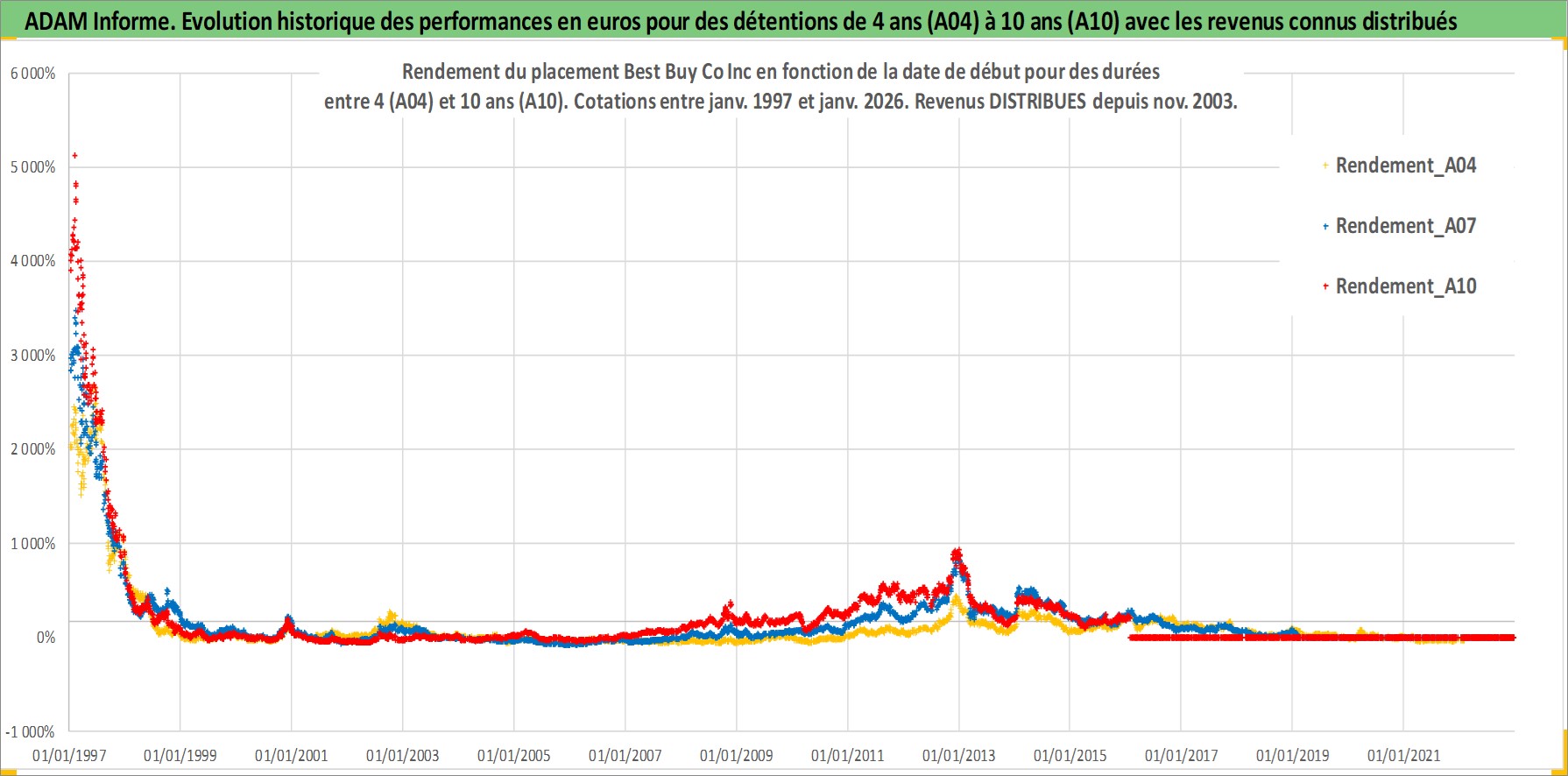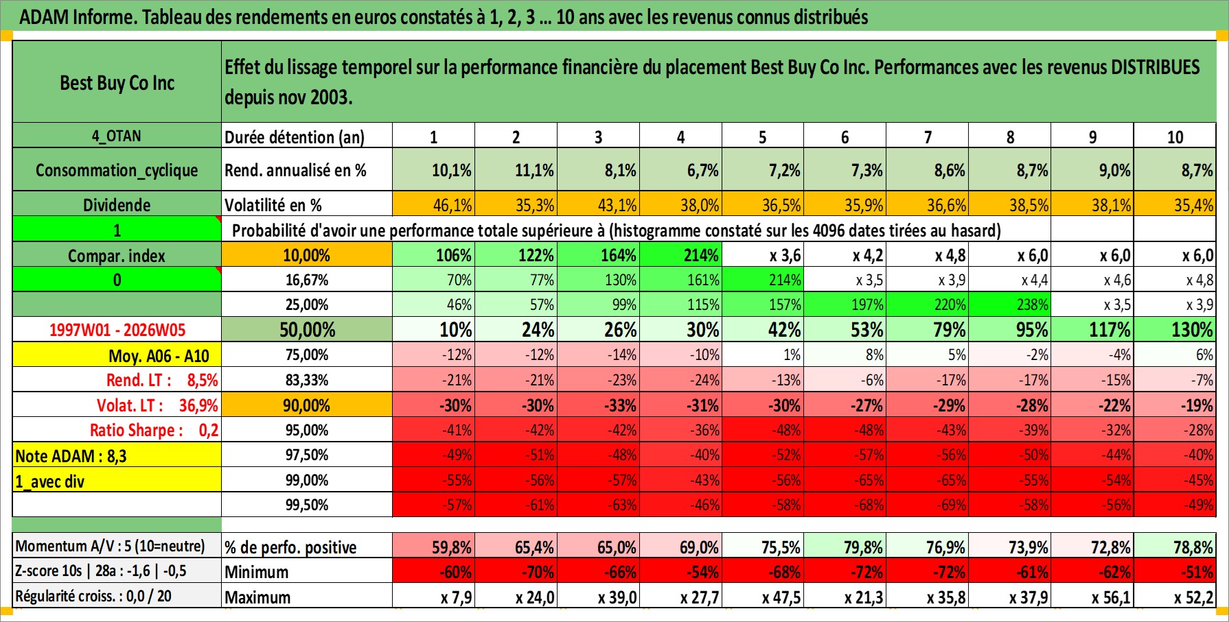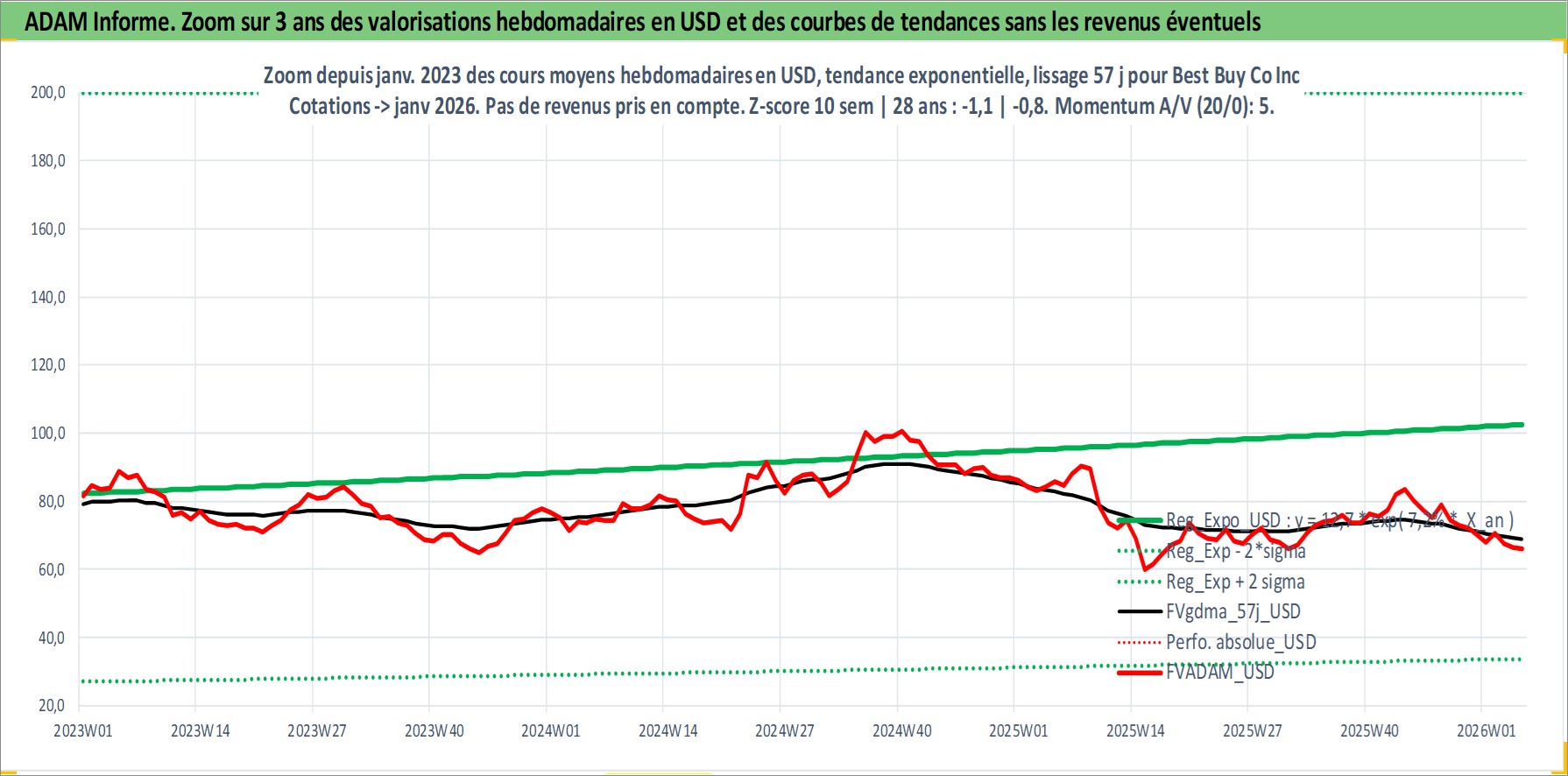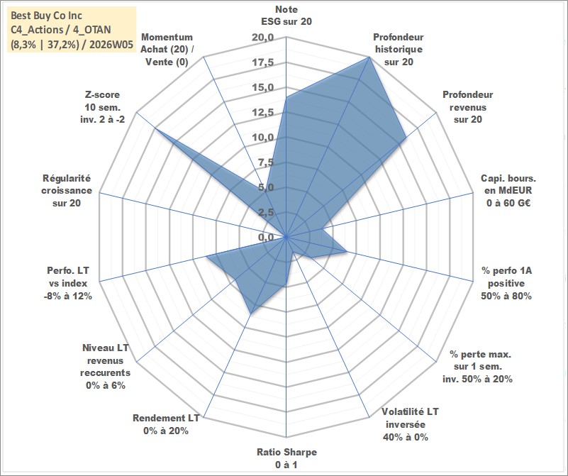 Site dédié aux investisseursPage dédiée sur site financeAnalyse des valorisations hebdomadaires de l'action Best Buy Co Inc. Cet actif est cote en USD. Les valorisations sont en contrevaleur EURO et couvrent les semaines 1997W01 a 2026W05. Les revenus de cet actif financier sont pris en compte depuis la semaine 2003W46. La note globale ESG de cet actif est estimee a 14.0 (apres rebasage entre 0 et 20).