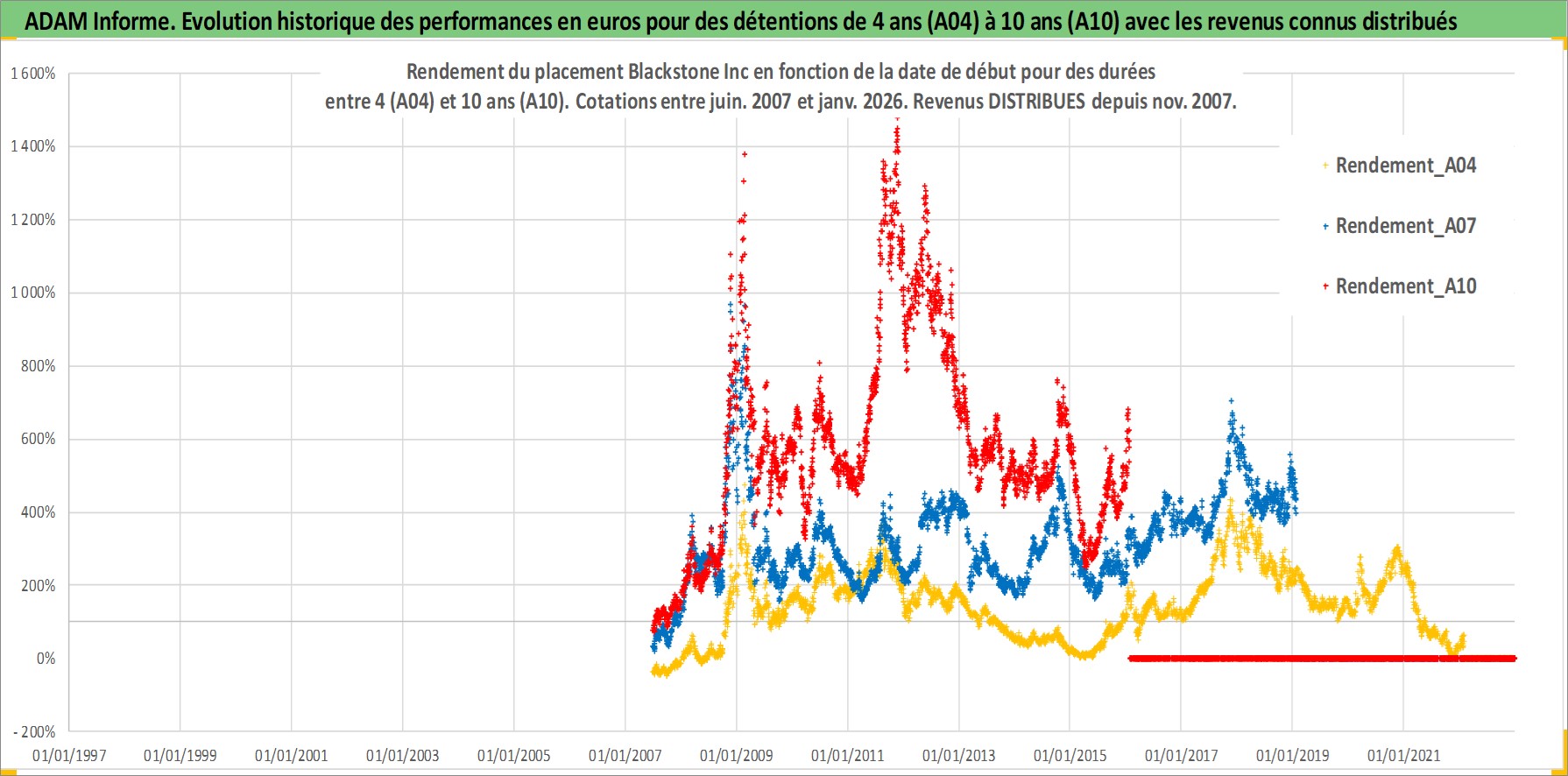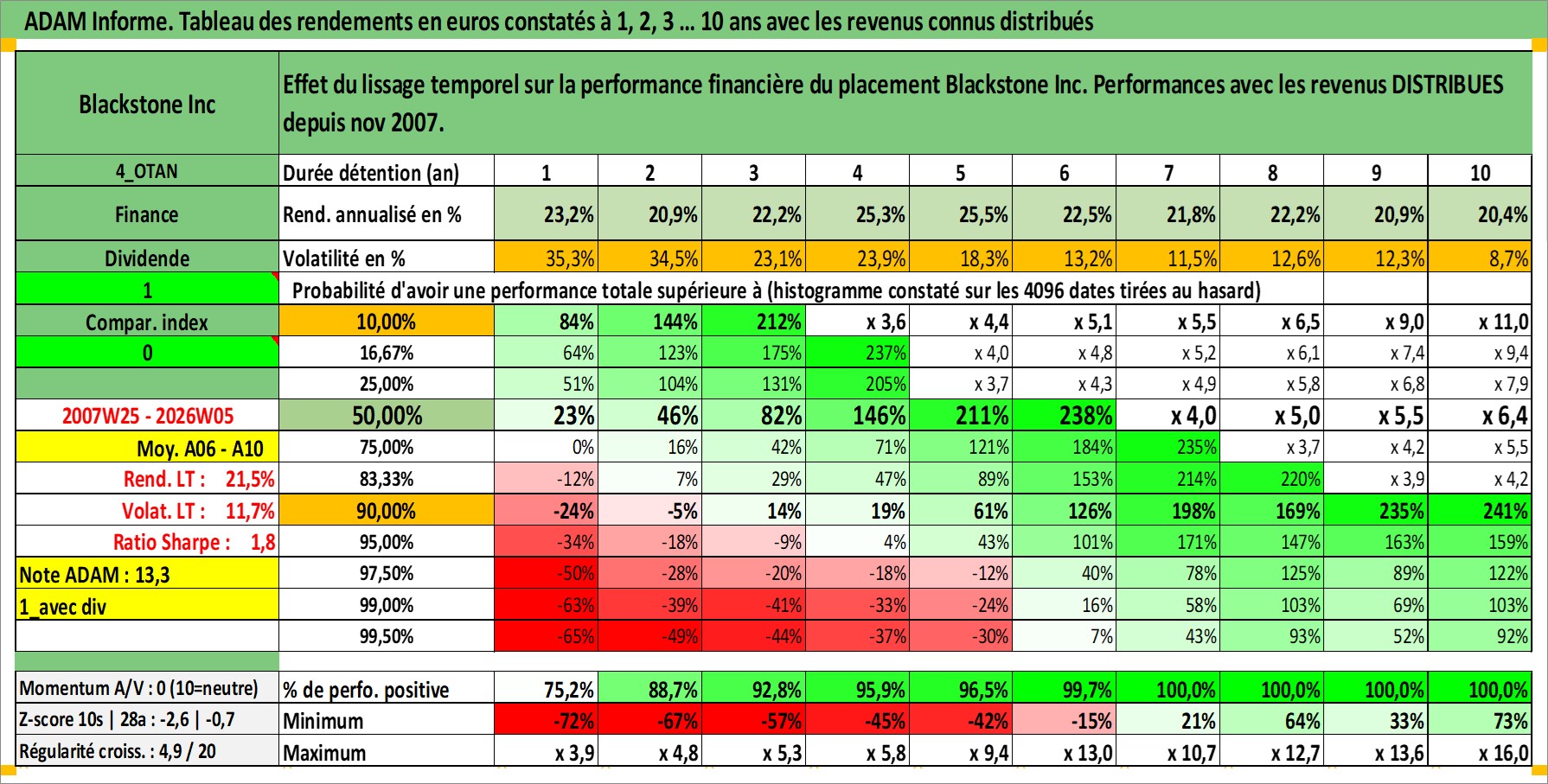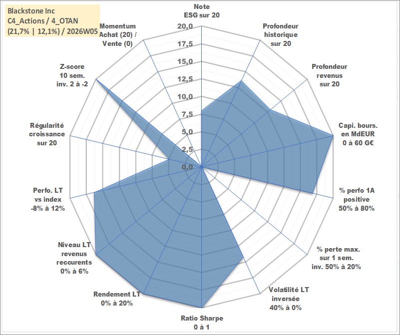 Site dédié aux investisseursPage dédiée sur site financeAnalyse des valorisations hebdomadaires de l'action Blackstone Inc. Cet actif est cote en USD. Les valorisations sont en contrevaleur EURO et couvrent les semaines 2007W25 a 2026W05. Les revenus de cet actif financier sont pris en compte depuis la semaine 2007W48. La note globale ESG de cet actif est estimee a 8.0 (apres rebasage entre 0 et 20).