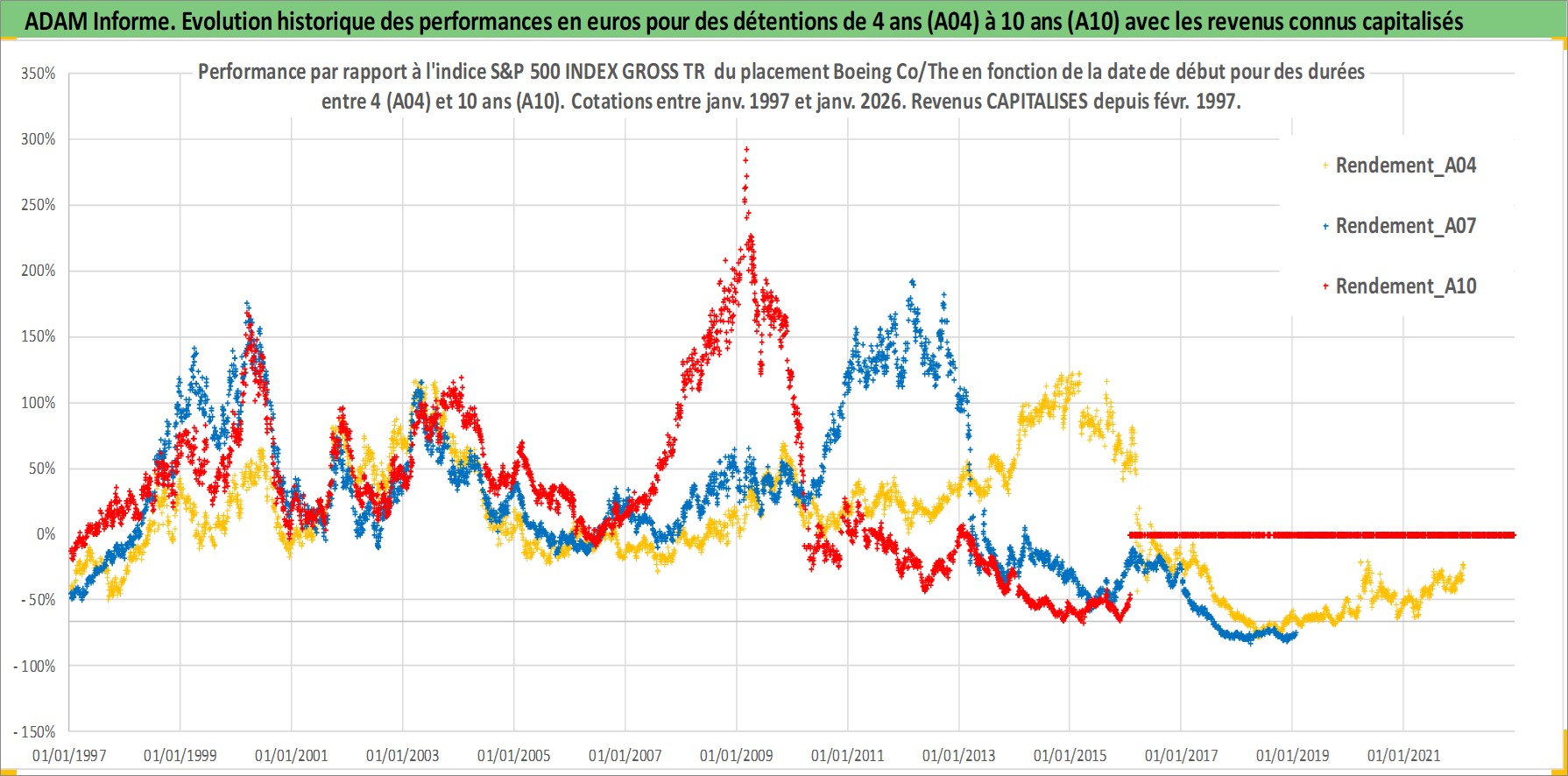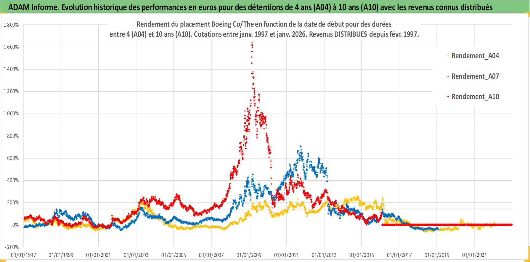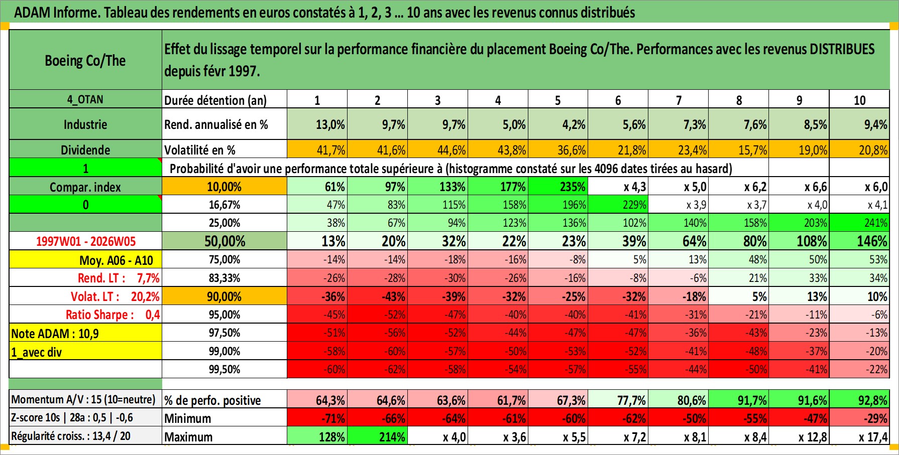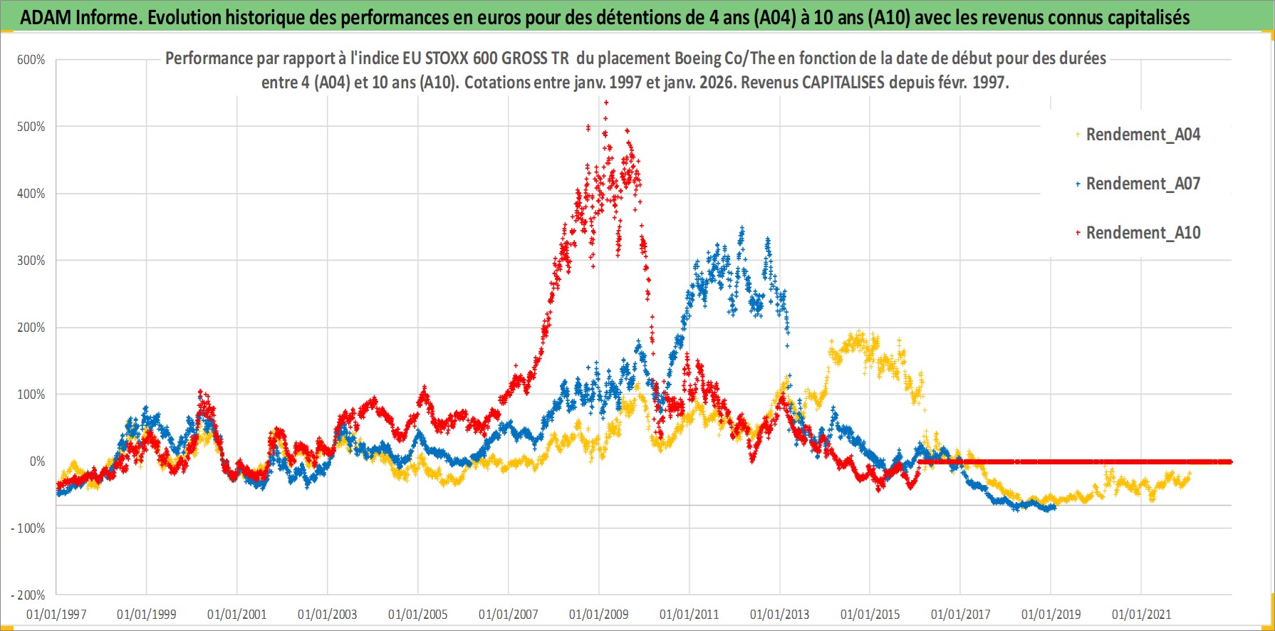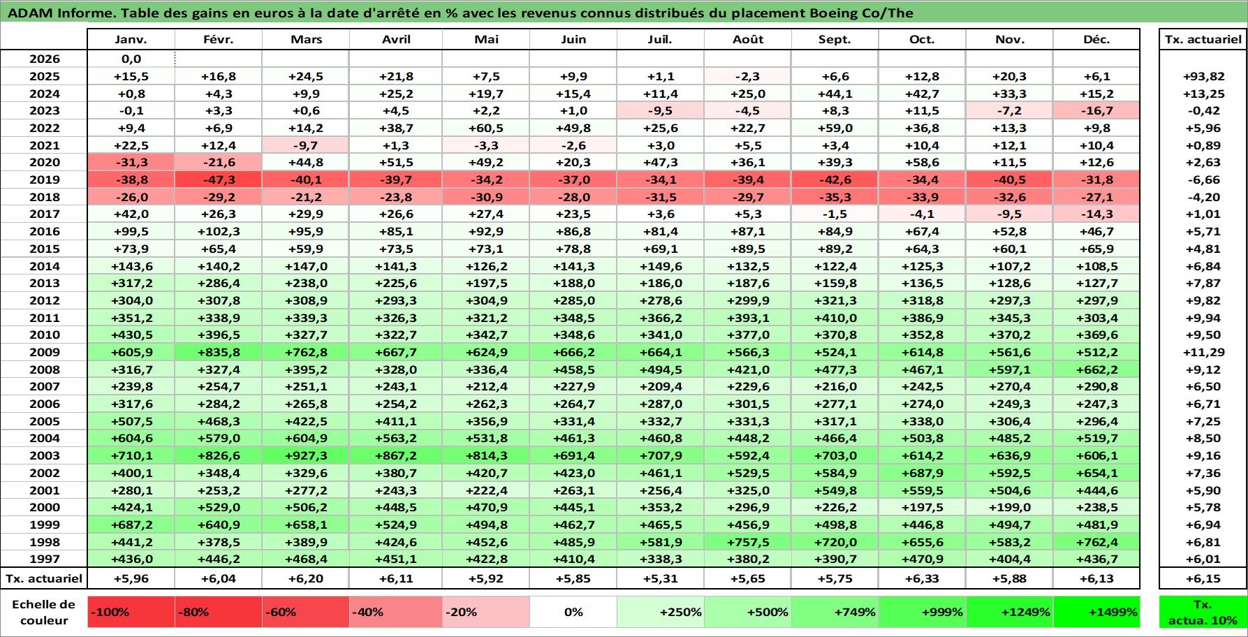 Site dédié aux investisseursPage dédiée sur site financeAnalyse des valorisations hebdomadaires de l'action Boeing Co/The. Cet actif est cote en USD. Les valorisations sont en contrevaleur EURO et couvrent les semaines 1997W01 a 2026W05. Les revenus de cet actif financier sont pris en compte depuis la semaine 1997W07. La note globale ESG de cet actif est estimee a 3.0 (apres rebasage entre 0 et 20).
