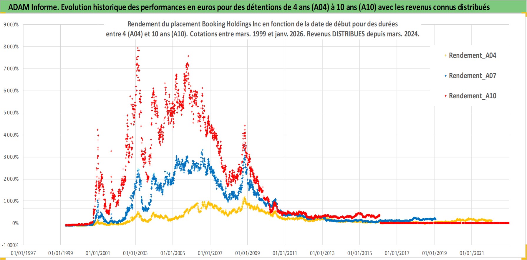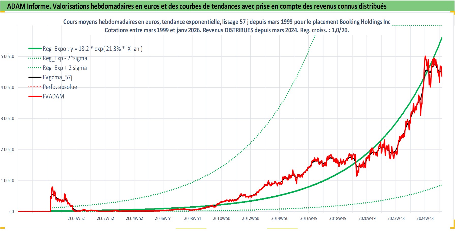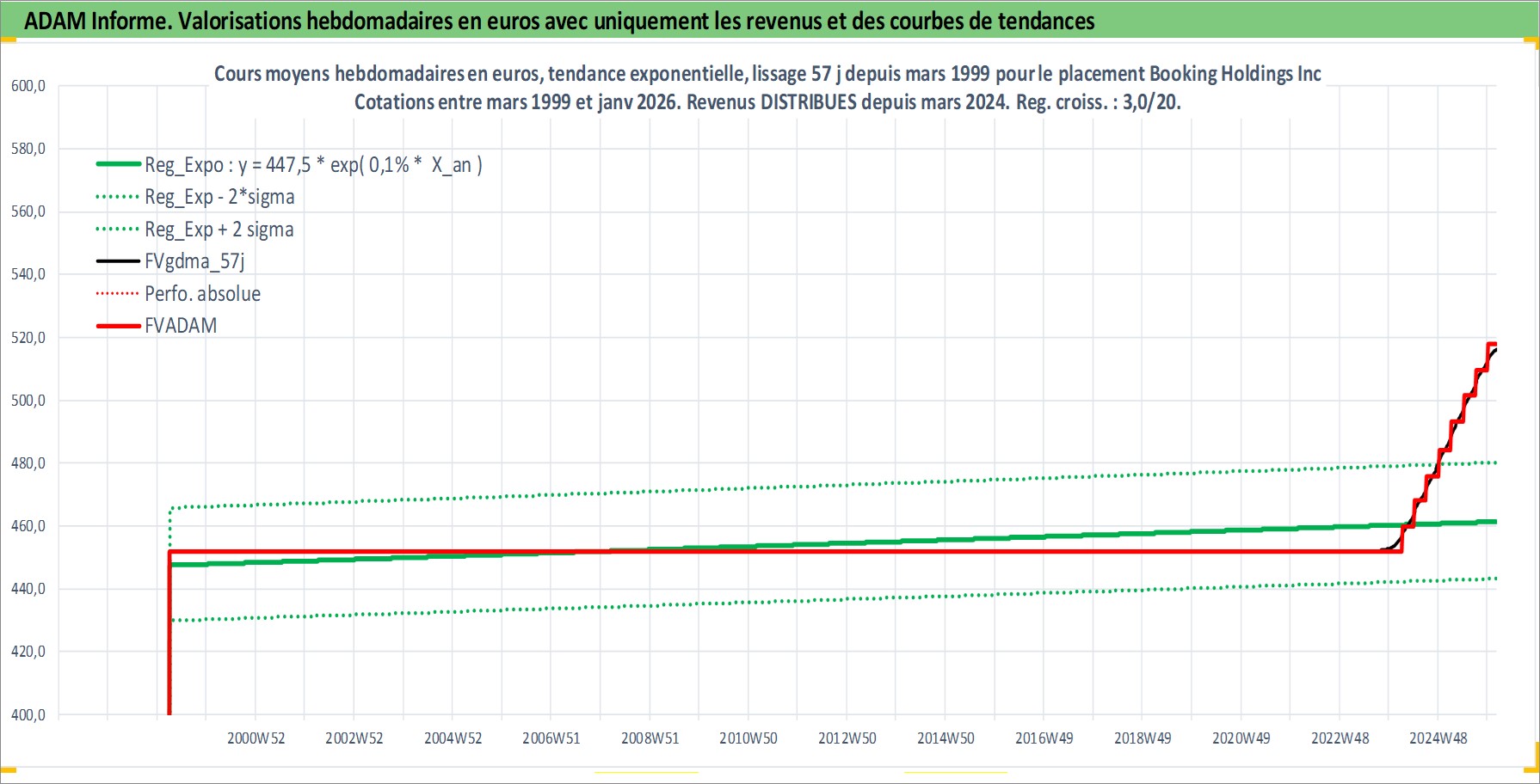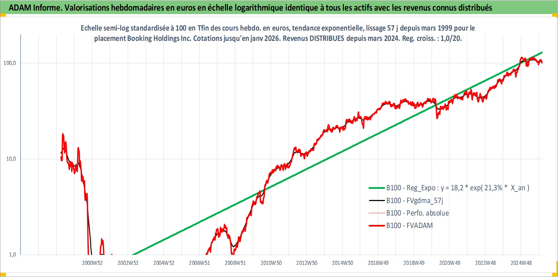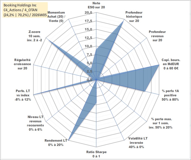 Site dédié aux investisseursPage dédiée sur site financeAnalyse des valorisations hebdomadaires de l'action Booking Holdings Inc. Cet actif est cote en USD. Les valorisations sont en contrevaleur EURO et couvrent les semaines 1999W13 a 2026W05. Les revenus de cet actif financier sont pris en compte depuis la semaine 2024W10. La note globale ESG de cet actif est estimee a 9.0 (apres rebasage entre 0 et 20).
