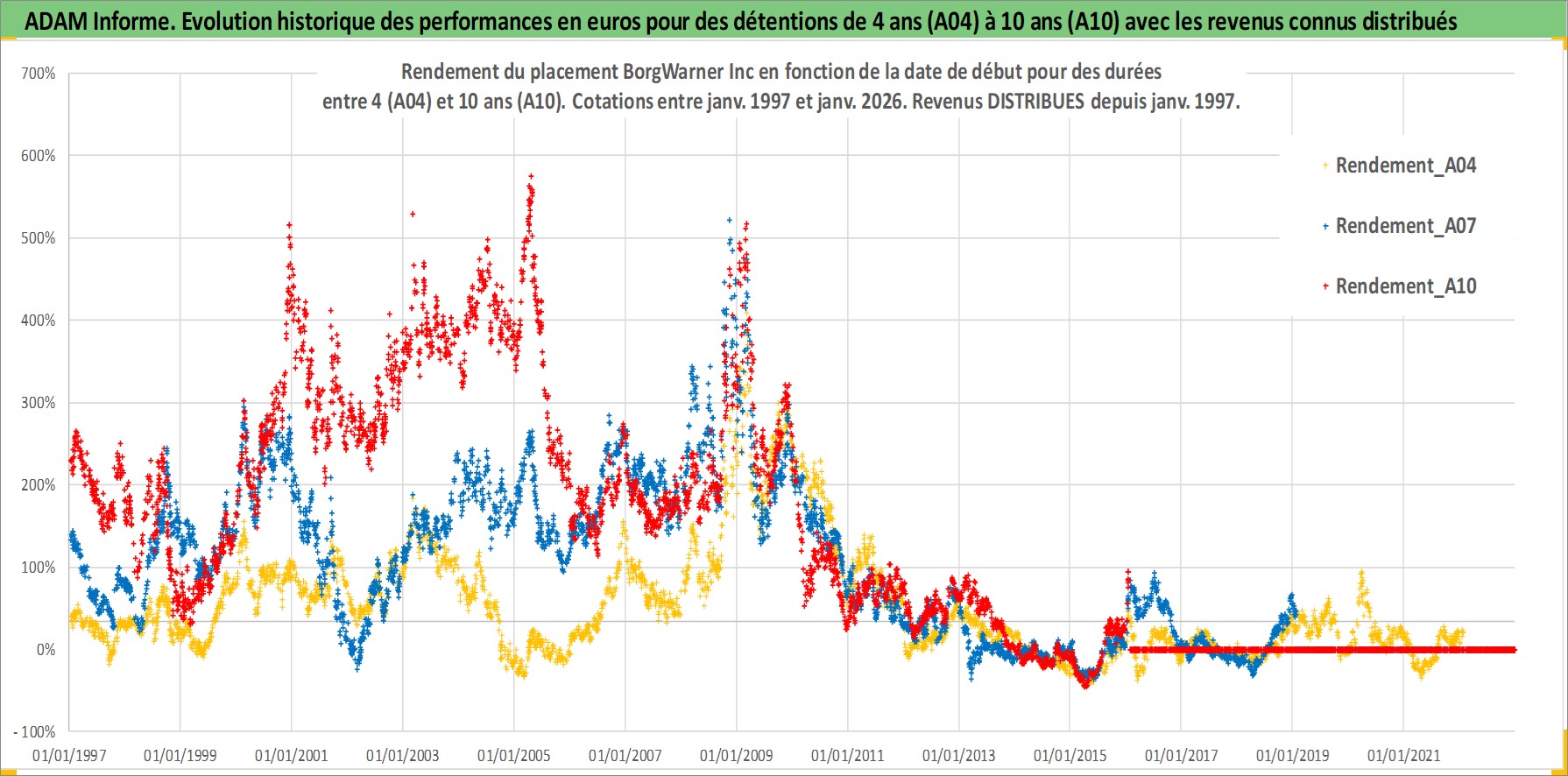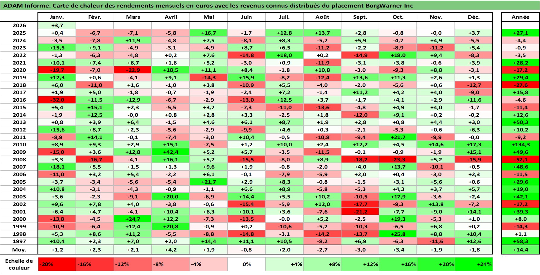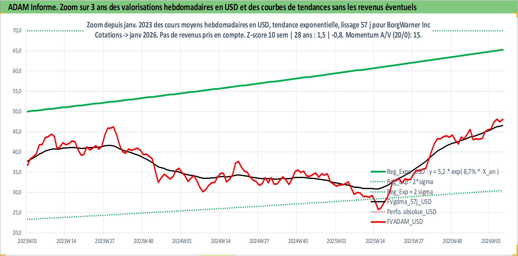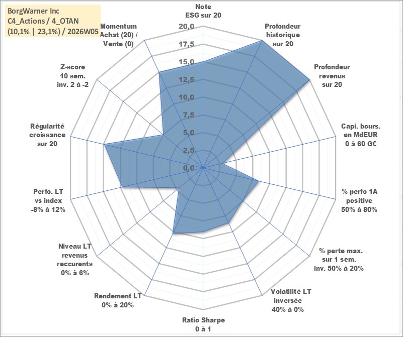 Site dédié aux investisseursPage dédiée sur site financeAnalyse des valorisations hebdomadaires de l'action BorgWarner Inc. Cet actif est cote en USD. Les valorisations sont en contrevaleur EURO et couvrent les semaines 1997W01 a 2026W05. Les revenus de cet actif financier sont pris en compte depuis la semaine 1997W05. La note globale ESG de cet actif est estimee a 15.0 (apres rebasage entre 0 et 20).