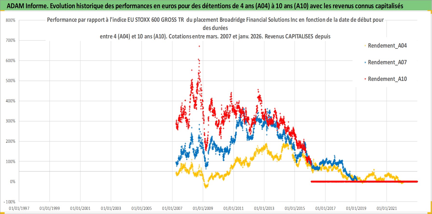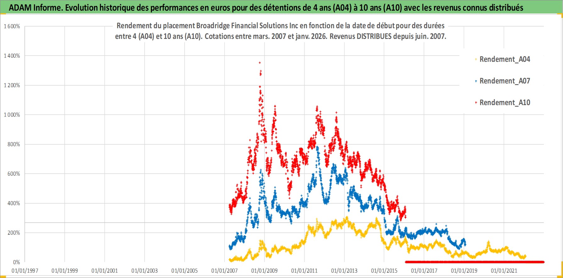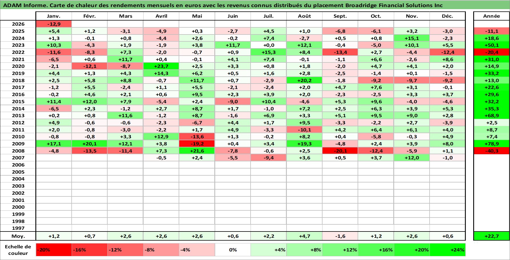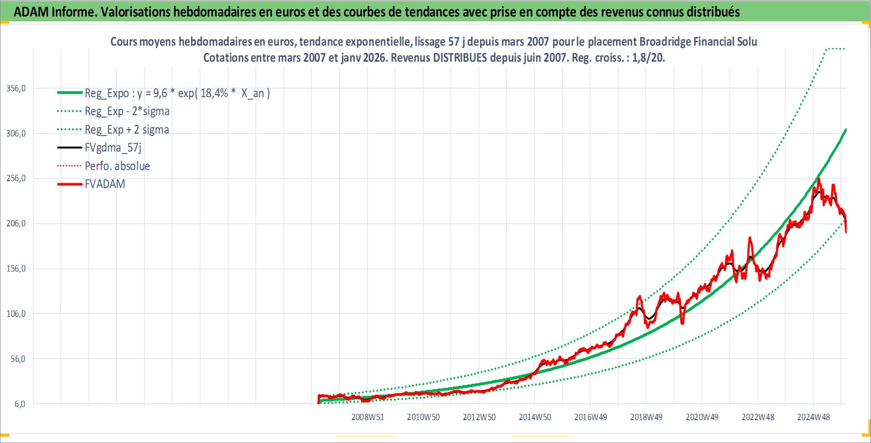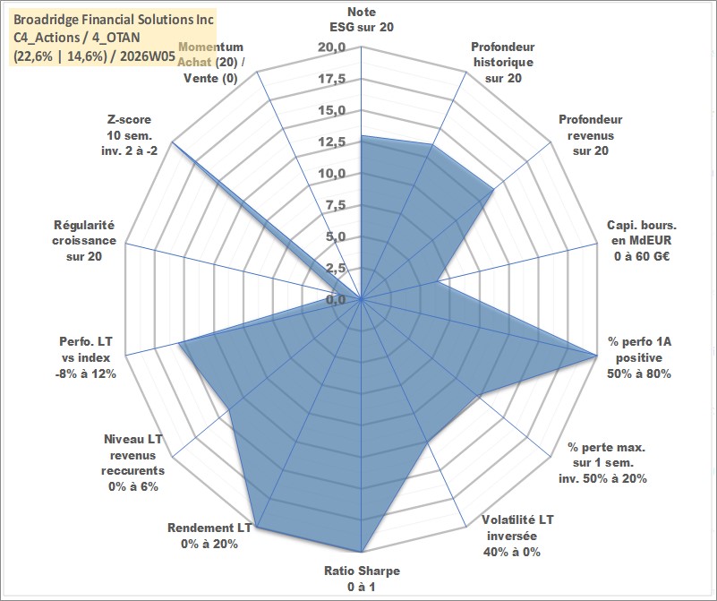 Site dédié aux investisseursPage dédiée sur site financeAnalyse des valorisations hebdomadaires de l'action Broadridge Financial Solutions Inc. Cet actif est cote en USD. Les valorisations sont en contrevaleur EURO et couvrent les semaines 2007W12 a 2026W05. Les revenus de cet actif financier sont pris en compte depuis la semaine 2007W24. La note globale ESG de cet actif est estimee a 13.0 (apres rebasage entre 0 et 20).