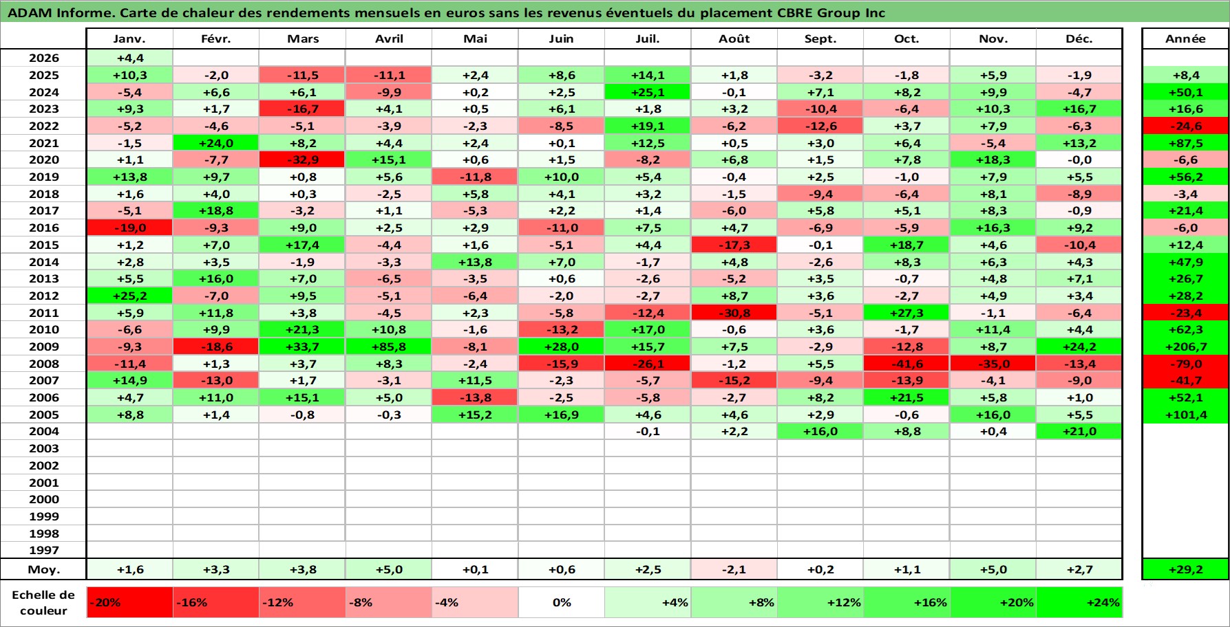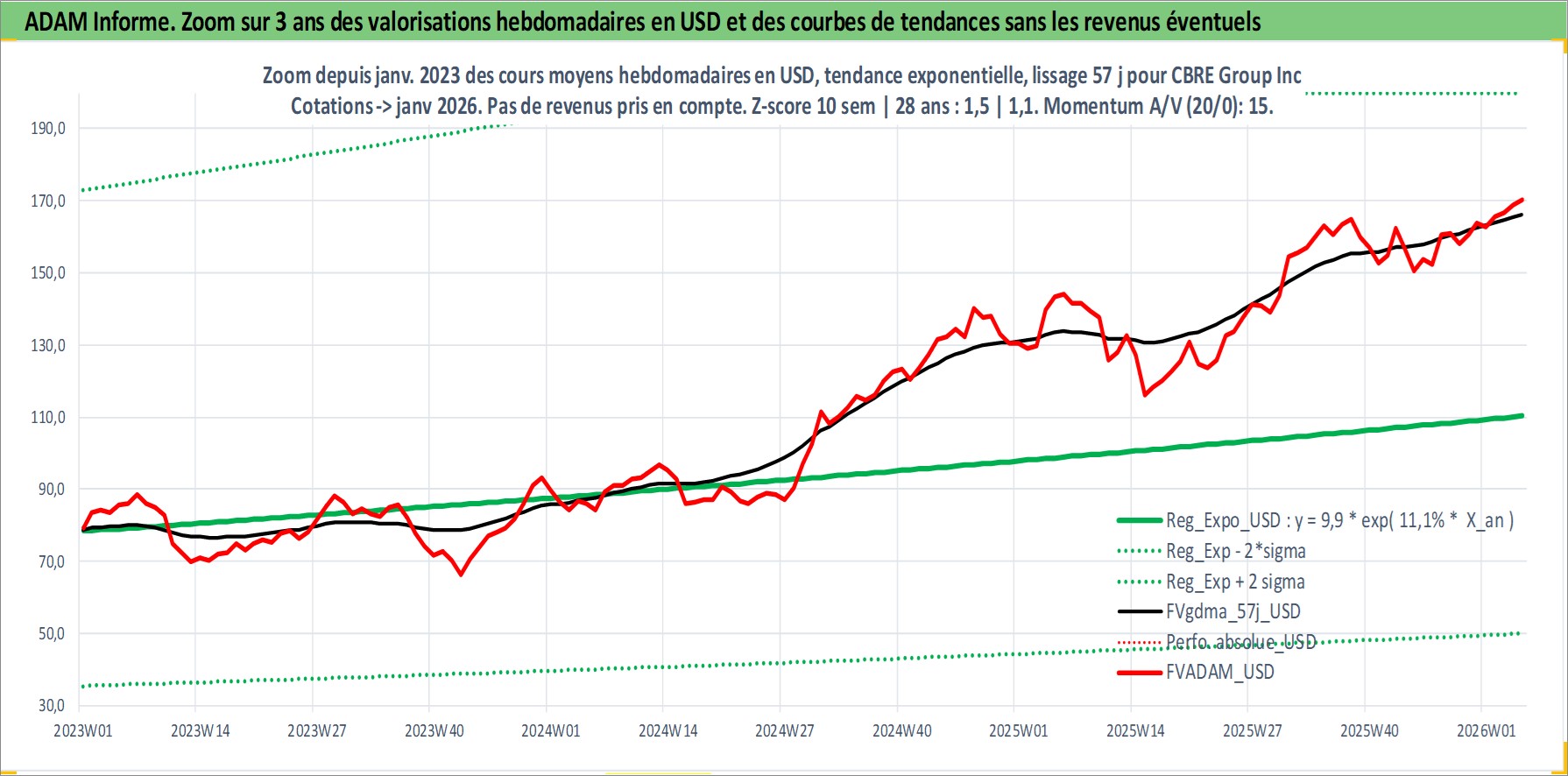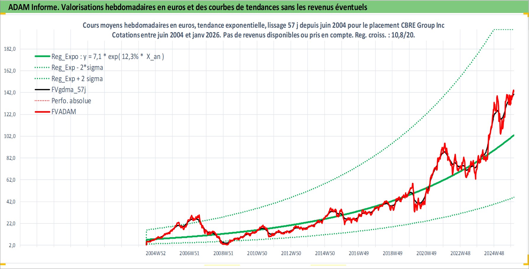 Site dédié aux investisseursPage dédiée sur site financeAnalyse des valorisations hebdomadaires de l'action CBRE Group Inc. Cet actif est cote en USD. Les valorisations sont en contrevaleur EURO et couvrent les semaines 2004W24 a 2026W05. Les revenus de cet actif financier ne sont pas connus car non existants ou non disponibles sur le site Yahoo Finance. La note globale ESG de cet actif est estimee a 19.0 (apres rebasage entre 0 et 20).