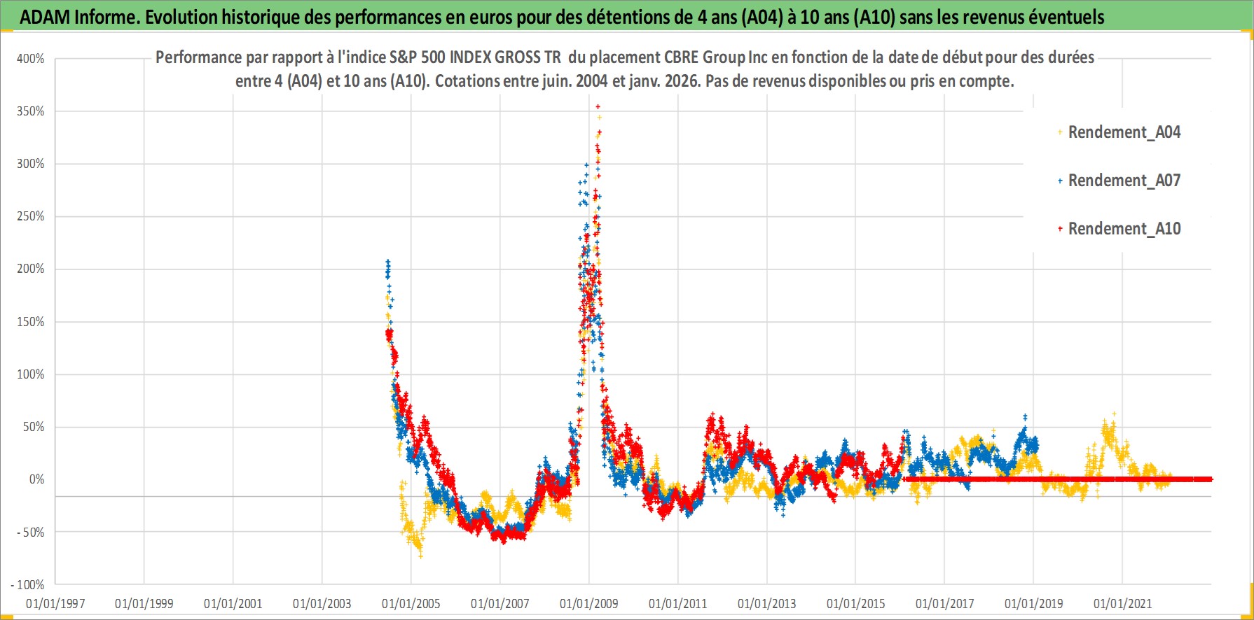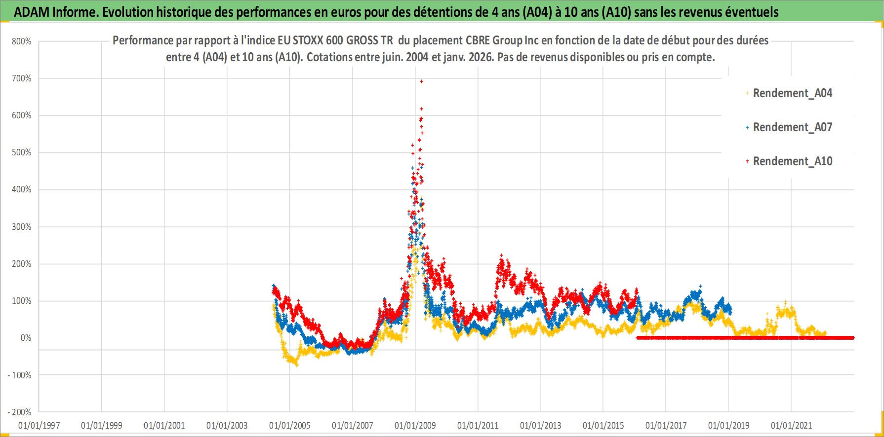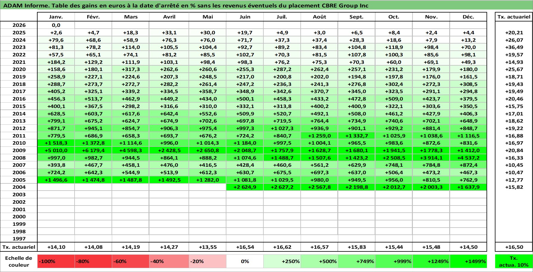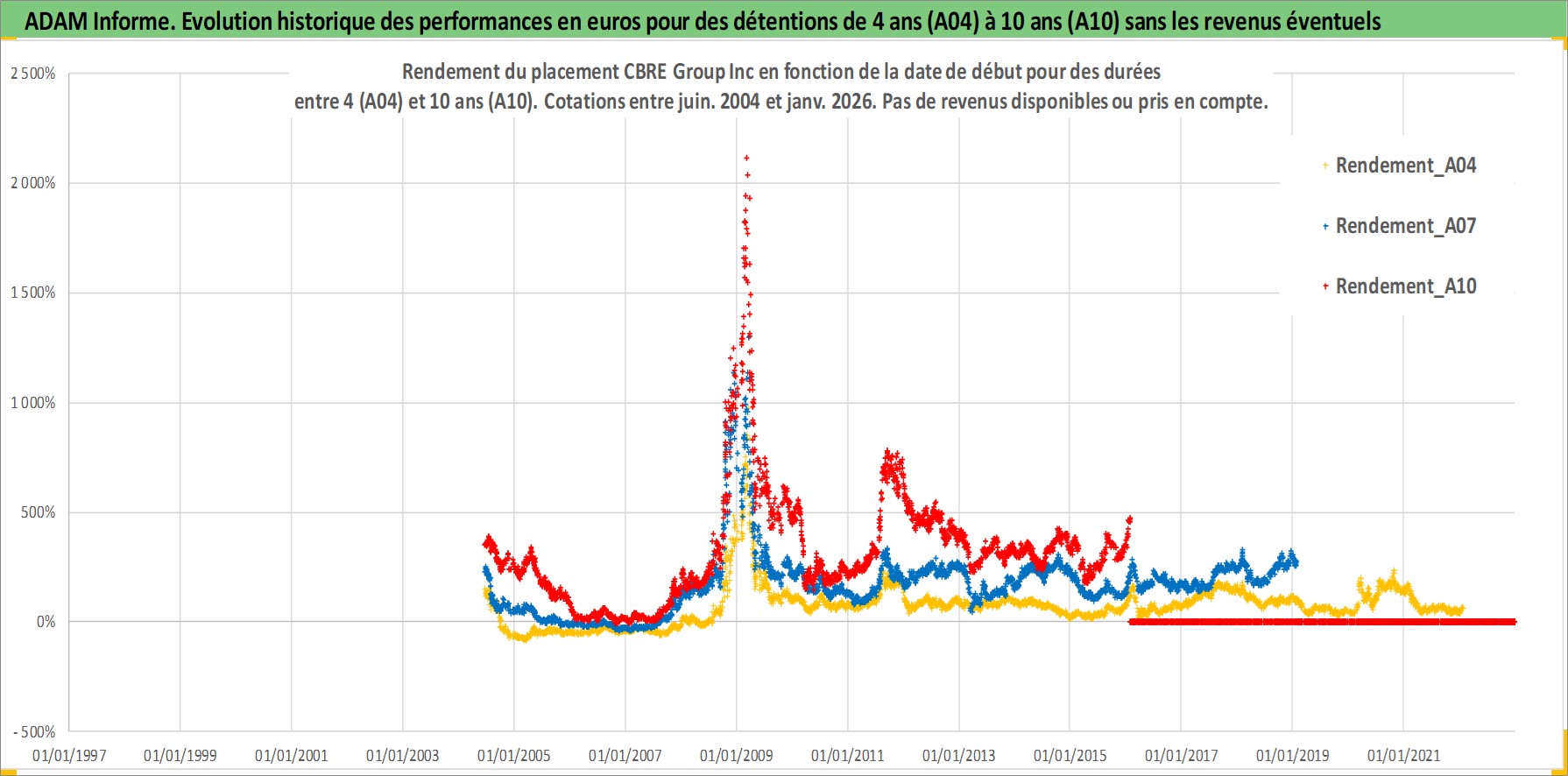 Site dédié aux investisseursPage dédiée sur site financeAnalyse des valorisations hebdomadaires de l'action CBRE Group Inc. Cet actif est cote en USD. Les valorisations sont en contrevaleur EURO et couvrent les semaines 2004W24 a 2026W05. Les revenus de cet actif financier ne sont pas connus car non existants ou non disponibles sur le site Yahoo Finance. La note globale ESG de cet actif est estimee a 19.0 (apres rebasage entre 0 et 20).