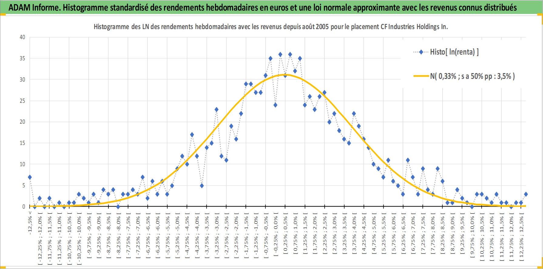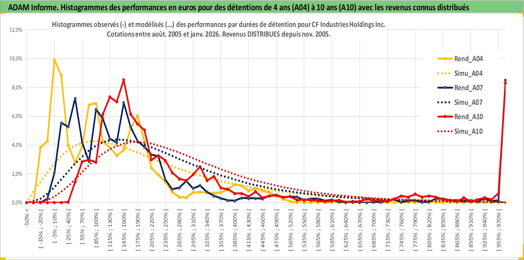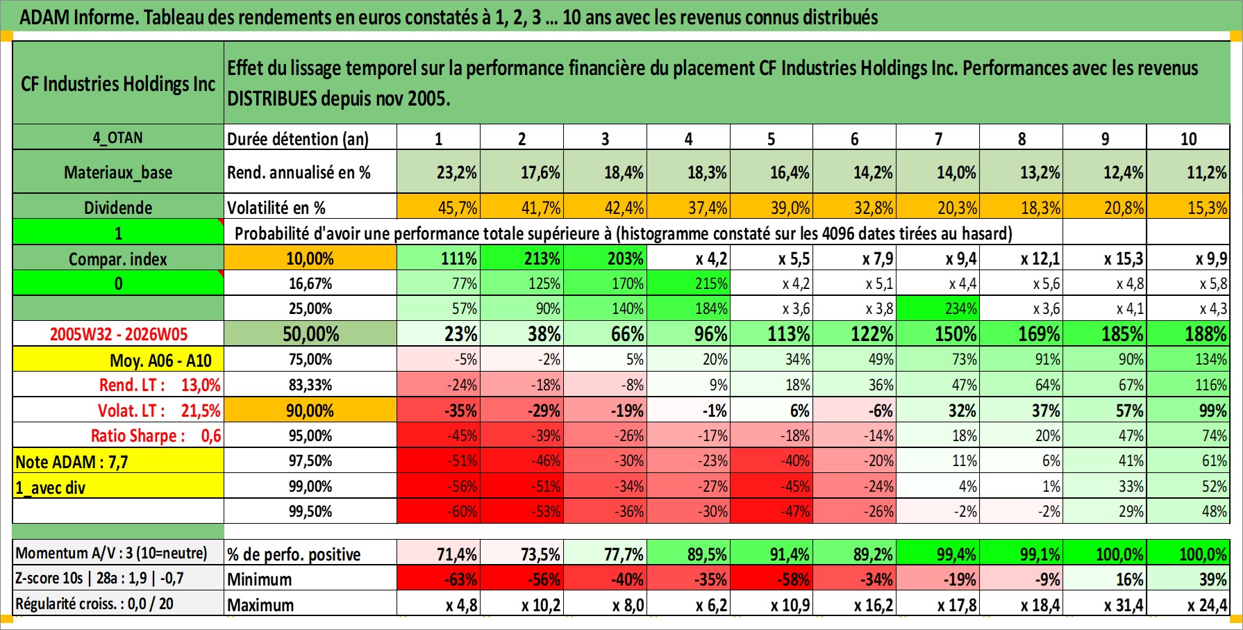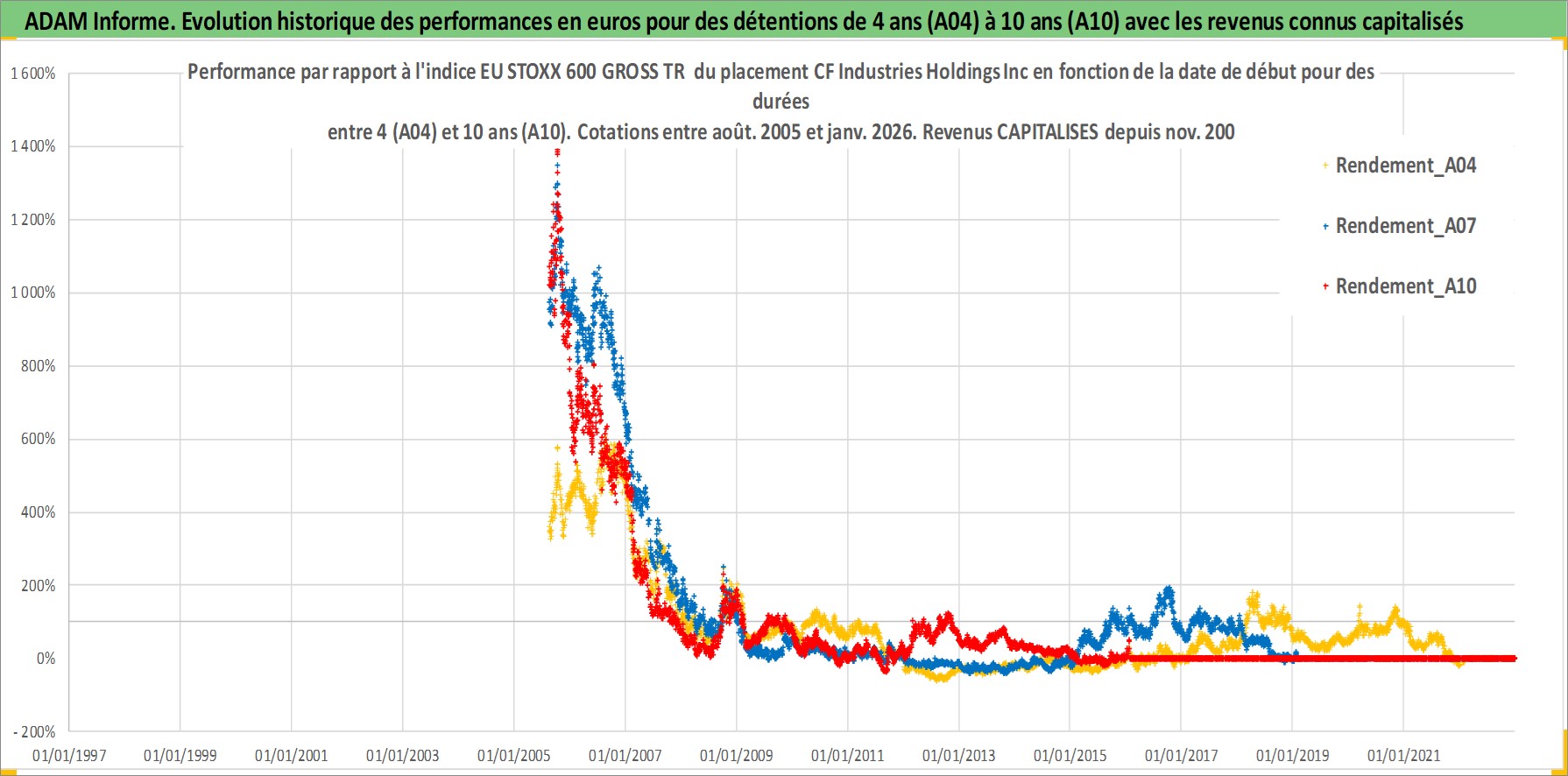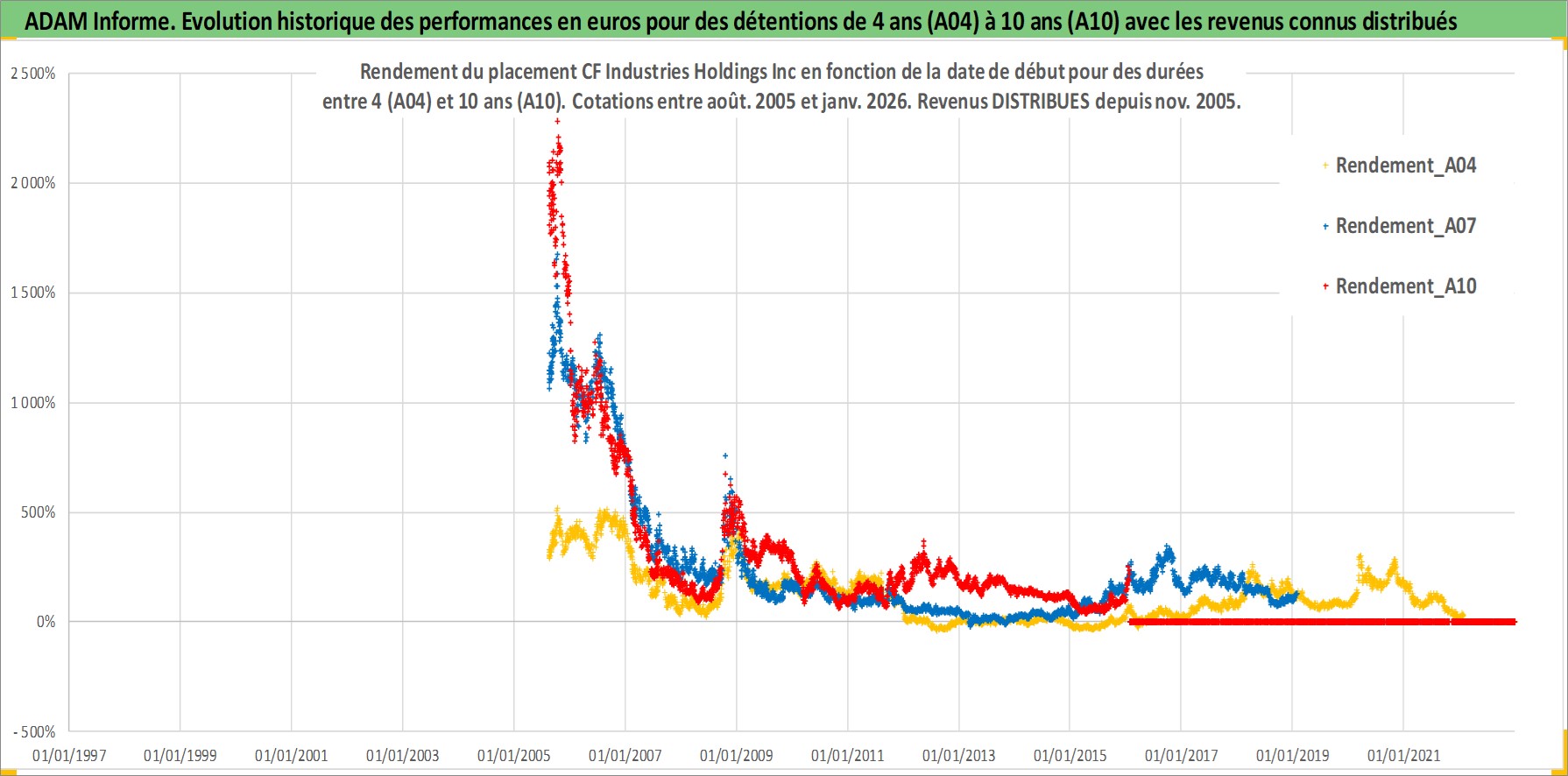 Site dédié aux investisseursPage dédiée sur site financeAnalyse des valorisations hebdomadaires de l'action CF Industries Holdings Inc. Cet actif est cote en USD. Les valorisations sont en contrevaleur EURO et couvrent les semaines 2005W32 a 2026W05. Les revenus de cet actif financier sont pris en compte depuis la semaine 2005W45. La note globale ESG de cet actif est estimee a 5.0 (apres rebasage entre 0 et 20).