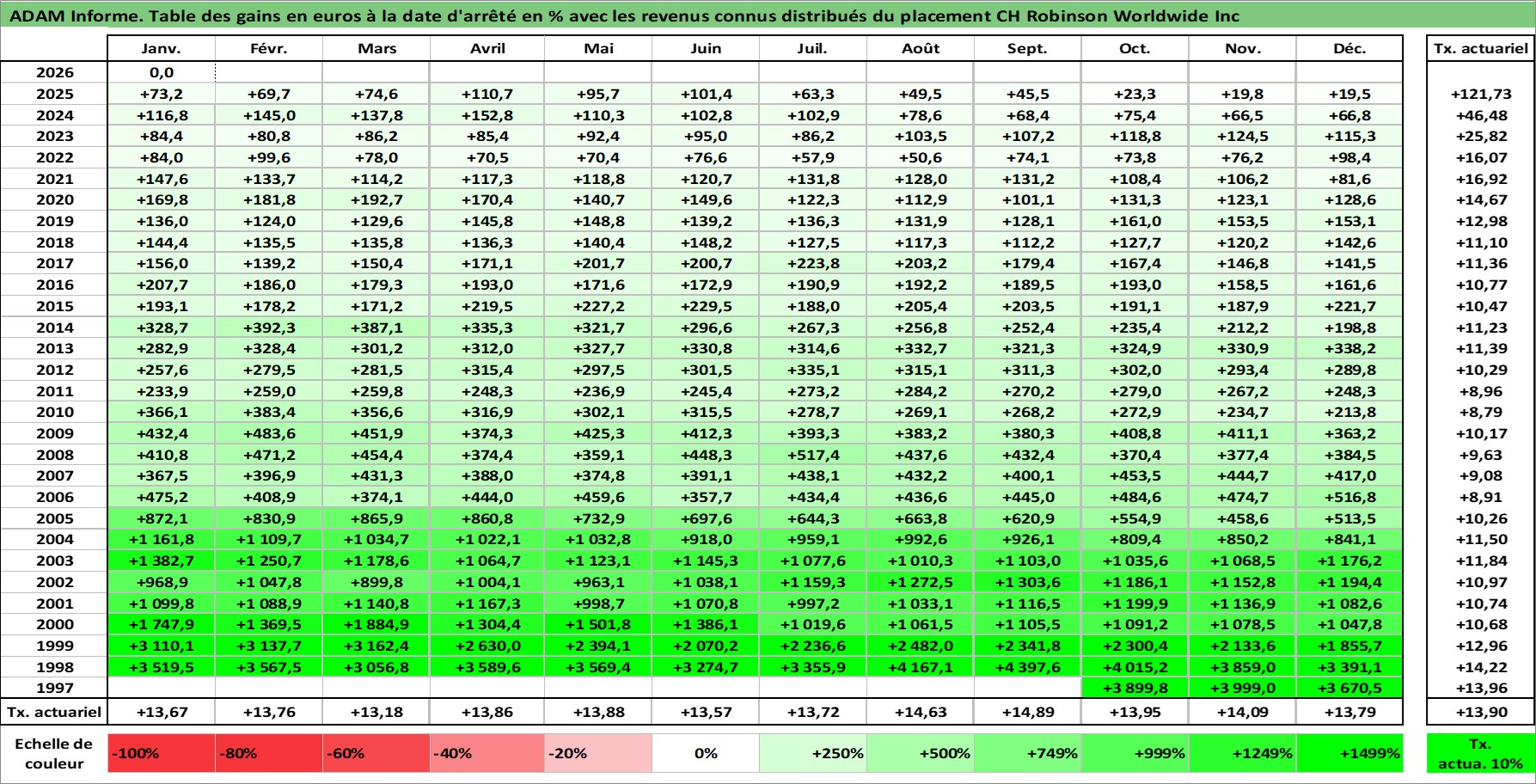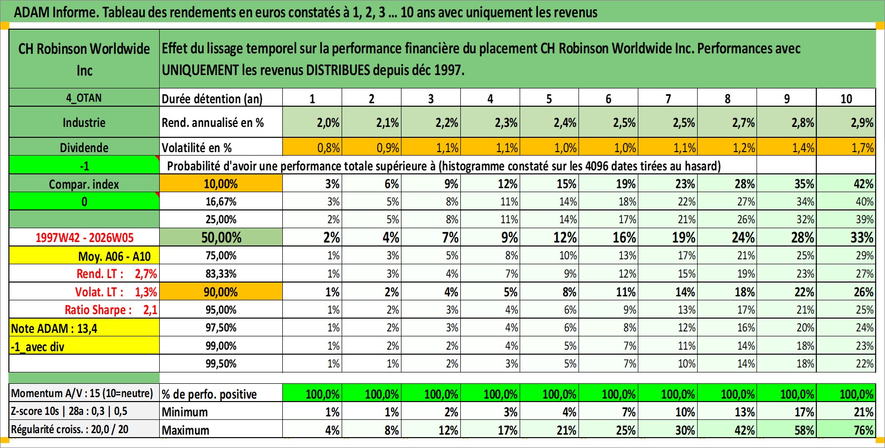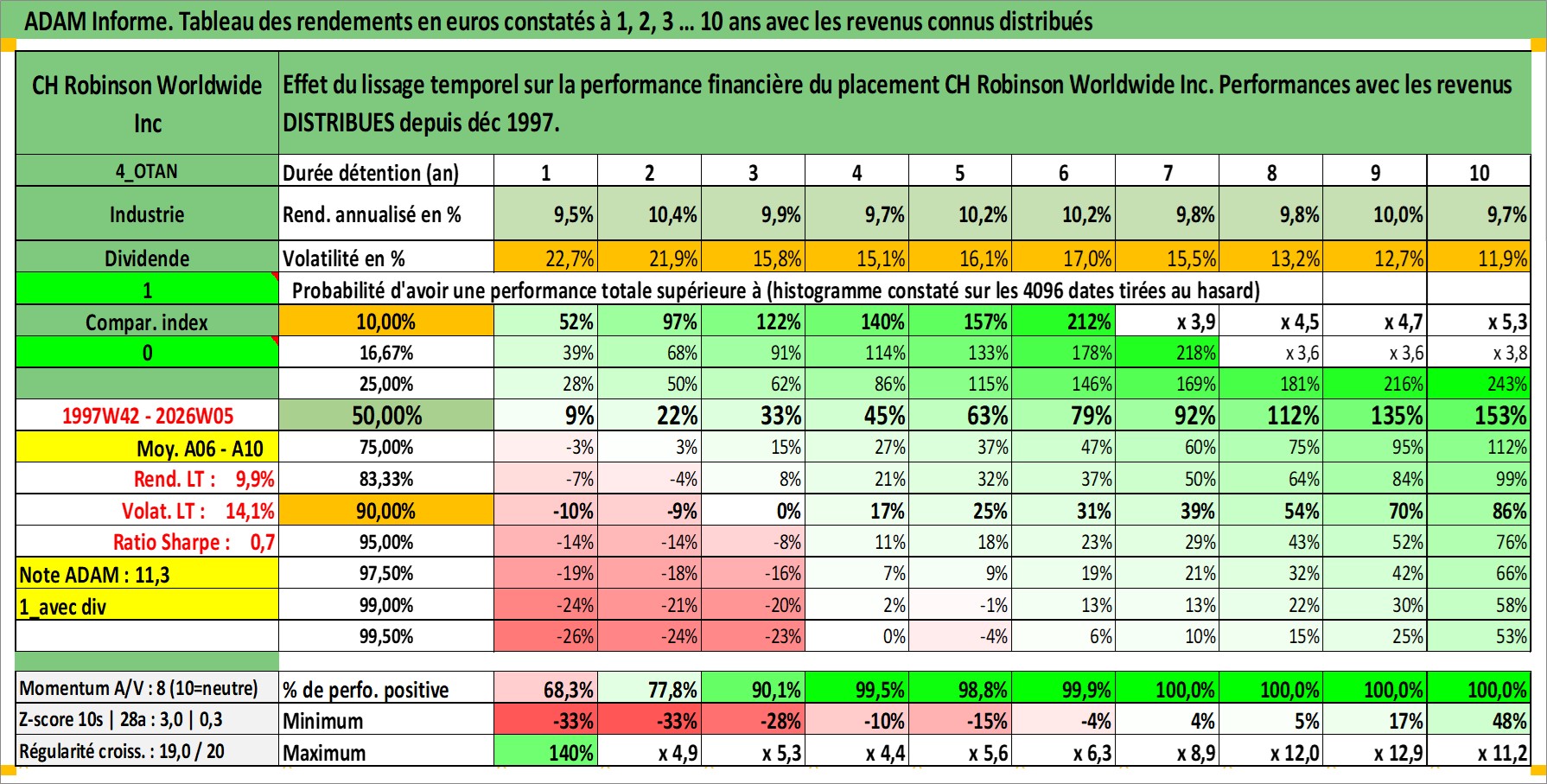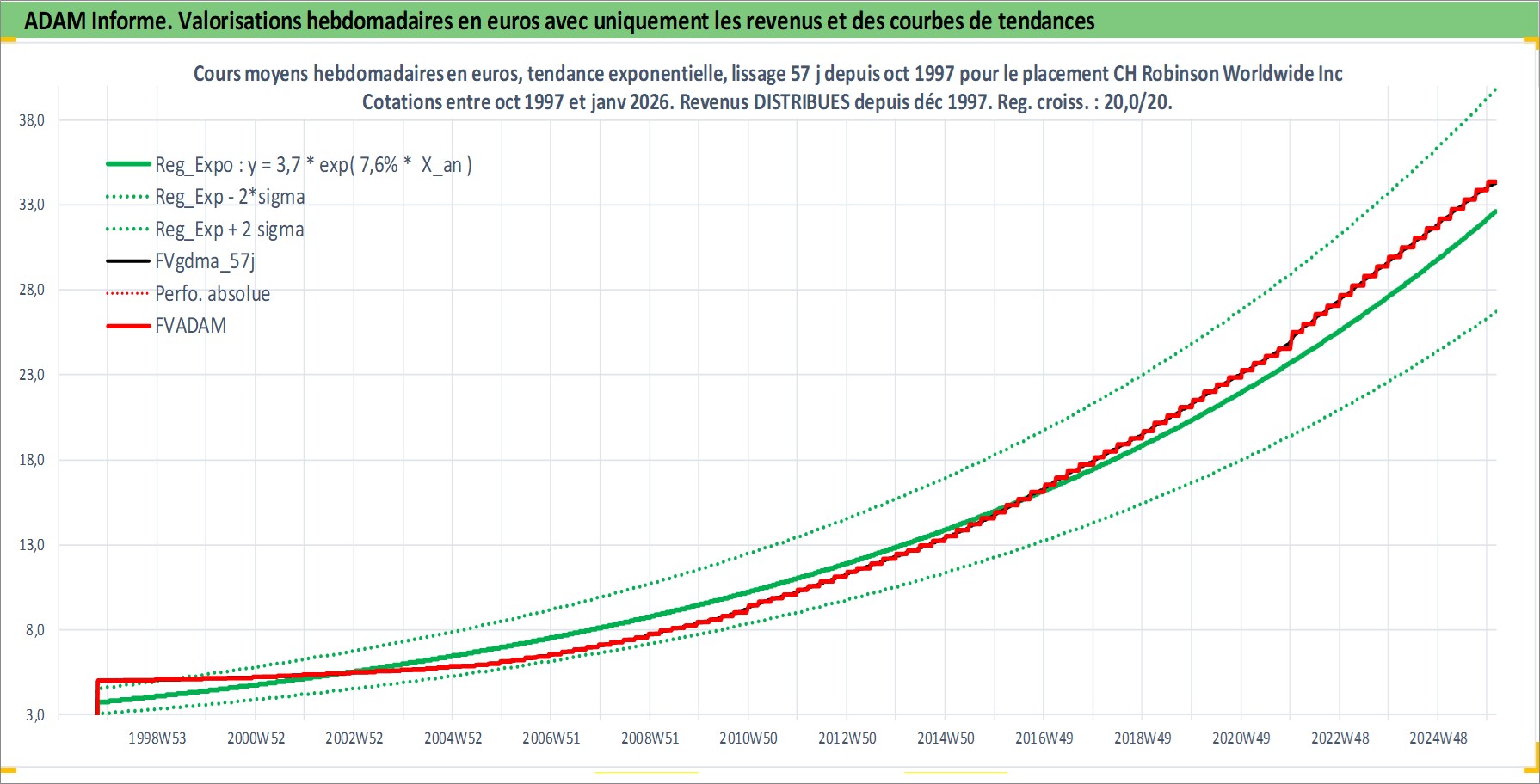 Site dédié aux investisseursPage dédiée sur site financeAnalyse des valorisations hebdomadaires de l'action CH Robinson Worldwide Inc. Cet actif est cote en USD. Les valorisations sont en contrevaleur EURO et couvrent les semaines 1997W42 a 2026W05. Les revenus de cet actif financier sont pris en compte depuis la semaine 1997W50. La note globale ESG de cet actif est estimee a 10.0 (apres rebasage entre 0 et 20).