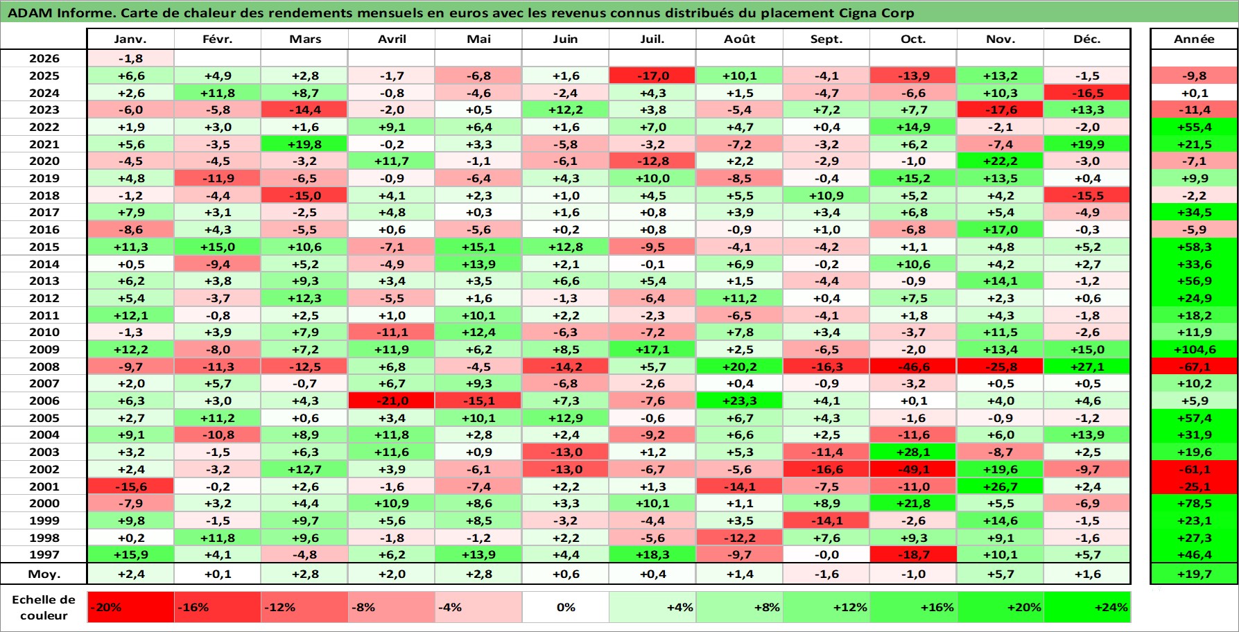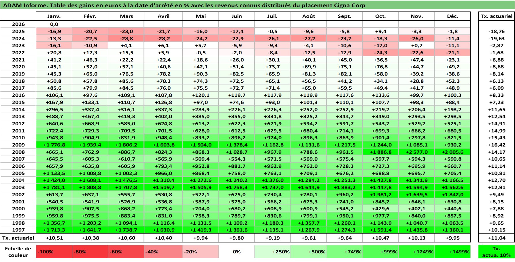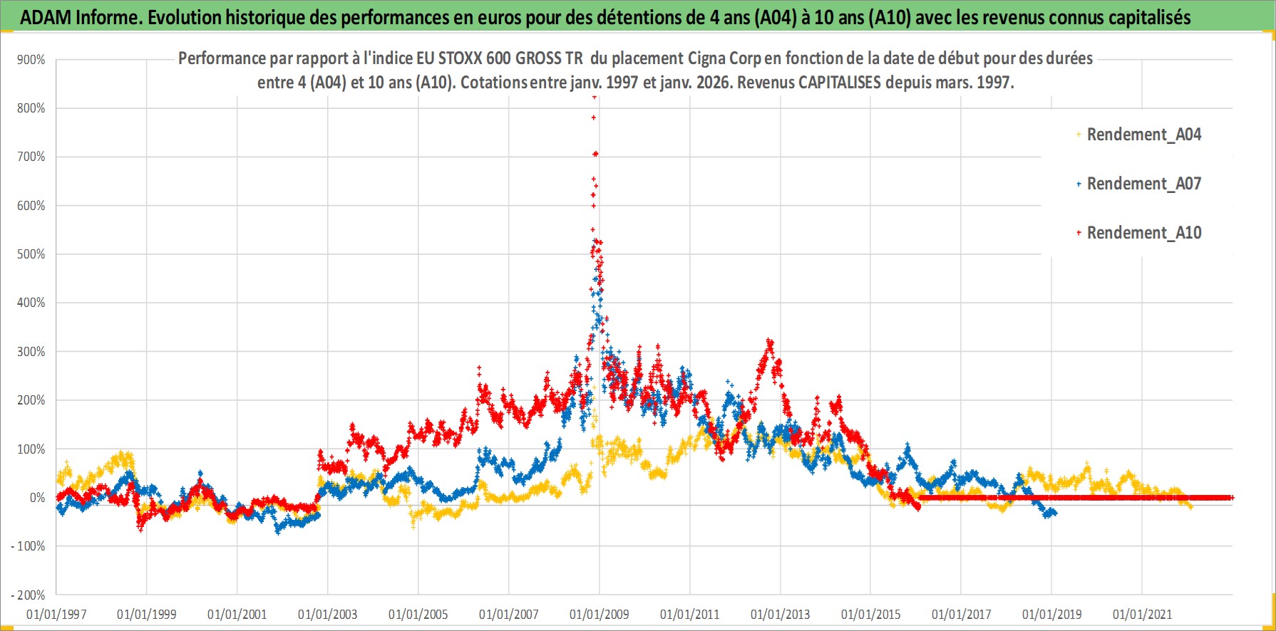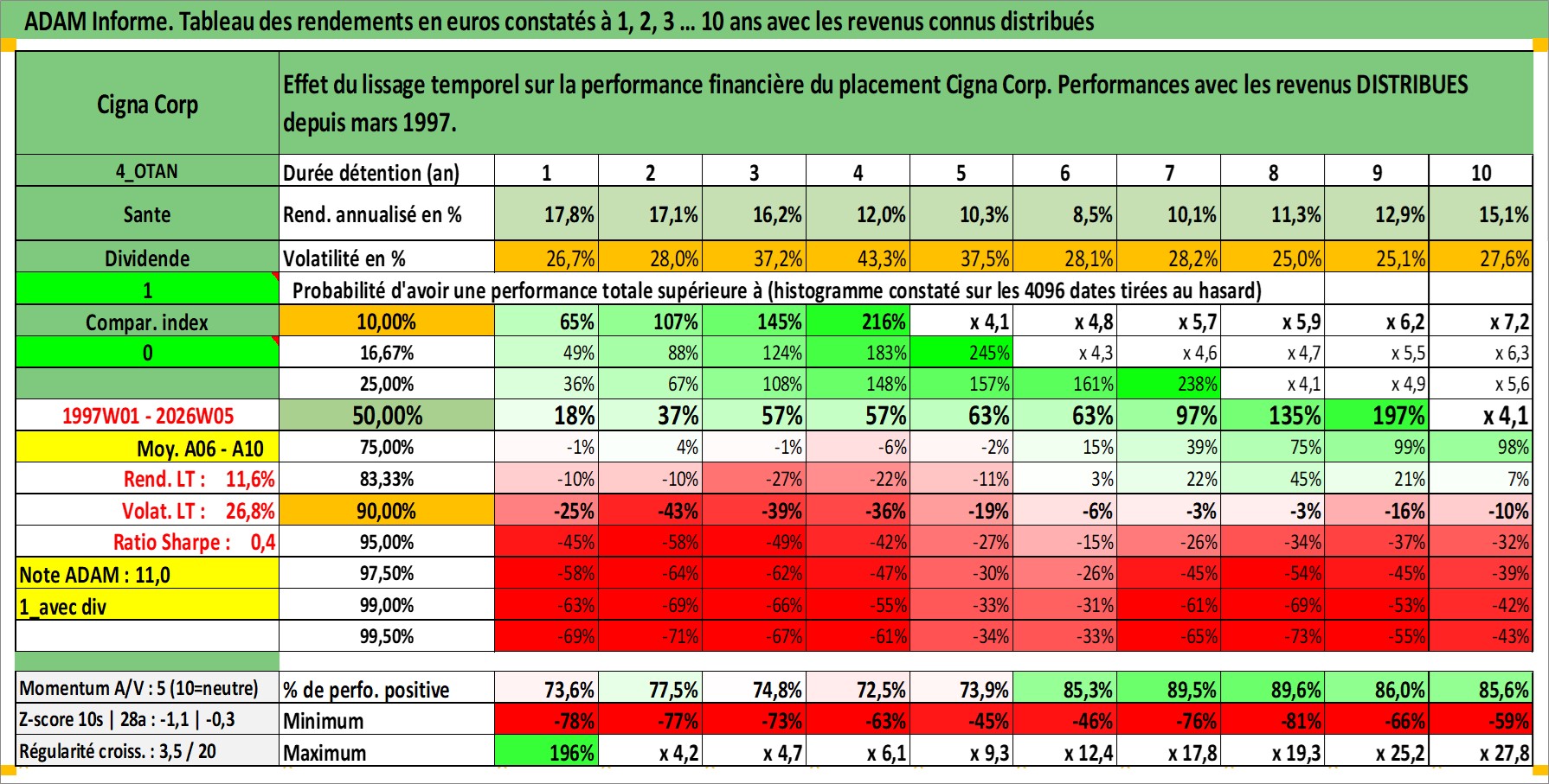 Site dédié aux investisseursPage dédiée sur site financeAnalyse des valorisations hebdomadaires de l'action Cigna Corp. Cet actif est cote en USD. Les valorisations sont en contrevaleur EURO et couvrent les semaines 1997W01 a 2026W05. Les revenus de cet actif financier sont pris en compte depuis la semaine 1997W11. La note globale ESG de cet actif est estimee a 15.0 (apres rebasage entre 0 et 20).