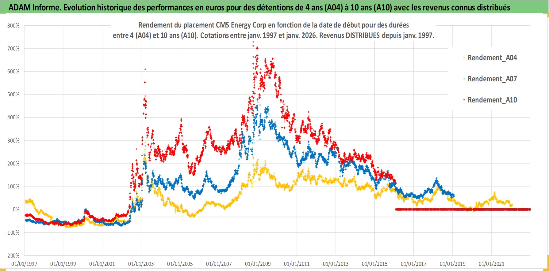 Site dédié aux investisseursPage dédiée sur site financeAnalyse des valorisations hebdomadaires de l'action CMS Energy Corp. Cet actif est cote en USD. Les valorisations sont en contrevaleur EURO et couvrent les semaines 1997W01 a 2026W05. Les revenus de cet actif financier sont pris en compte depuis la semaine 1997W05. La note globale ESG de cet actif est estimee a 10.0 (apres rebasage entre 0 et 20).