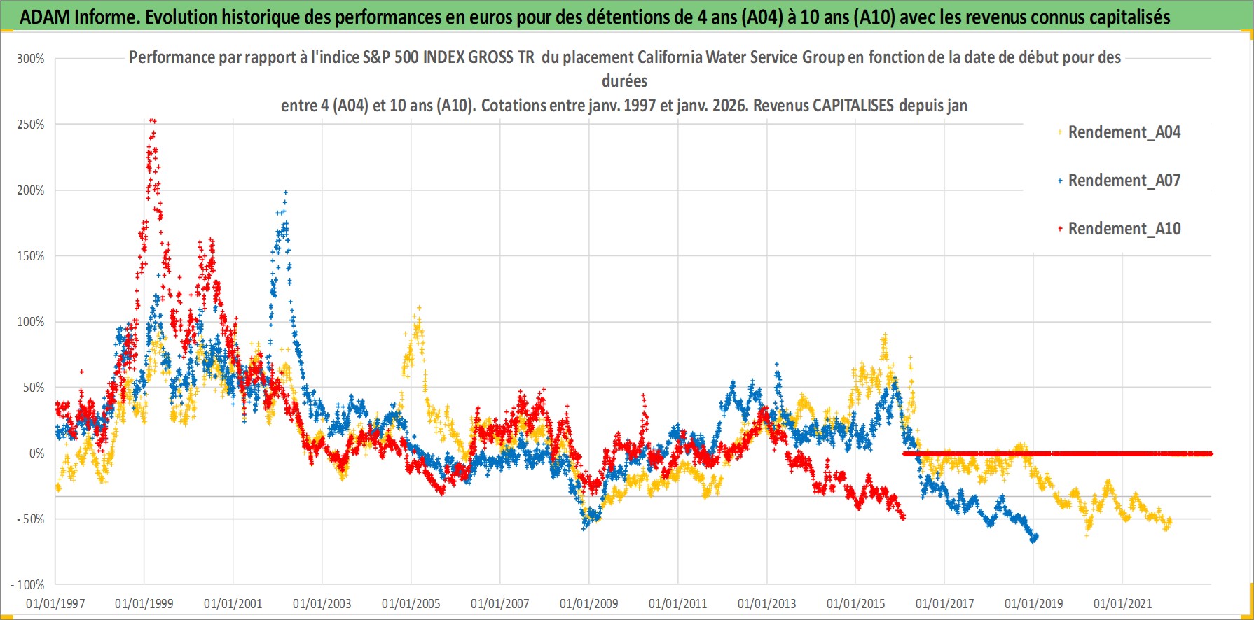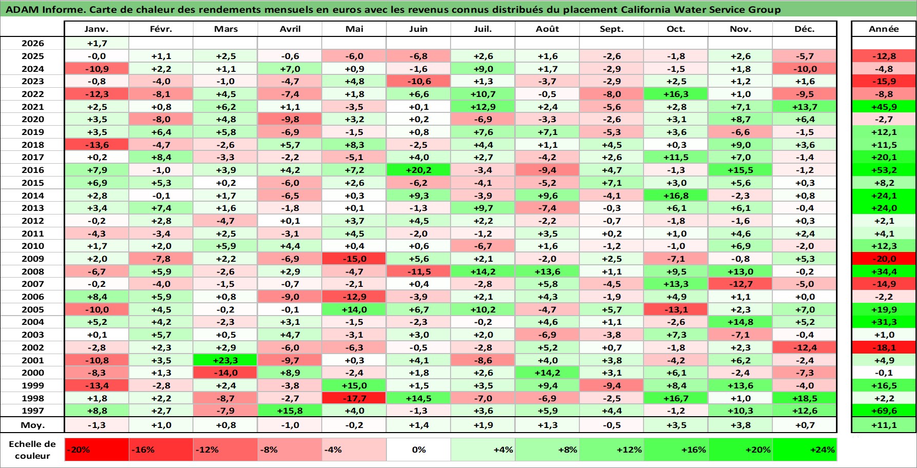 Site dédié aux investisseursPage dédiée sur site financeAnalyse des valorisations hebdomadaires de l'action California Water Service Group. Cet actif est cote en USD. Les valorisations sont en contrevaleur EURO et couvrent les semaines 1997W01 a 2026W05. Les revenus de cet actif financier sont pris en compte depuis la semaine 1997W05. La note ESG de cet actif n'est pas connue.