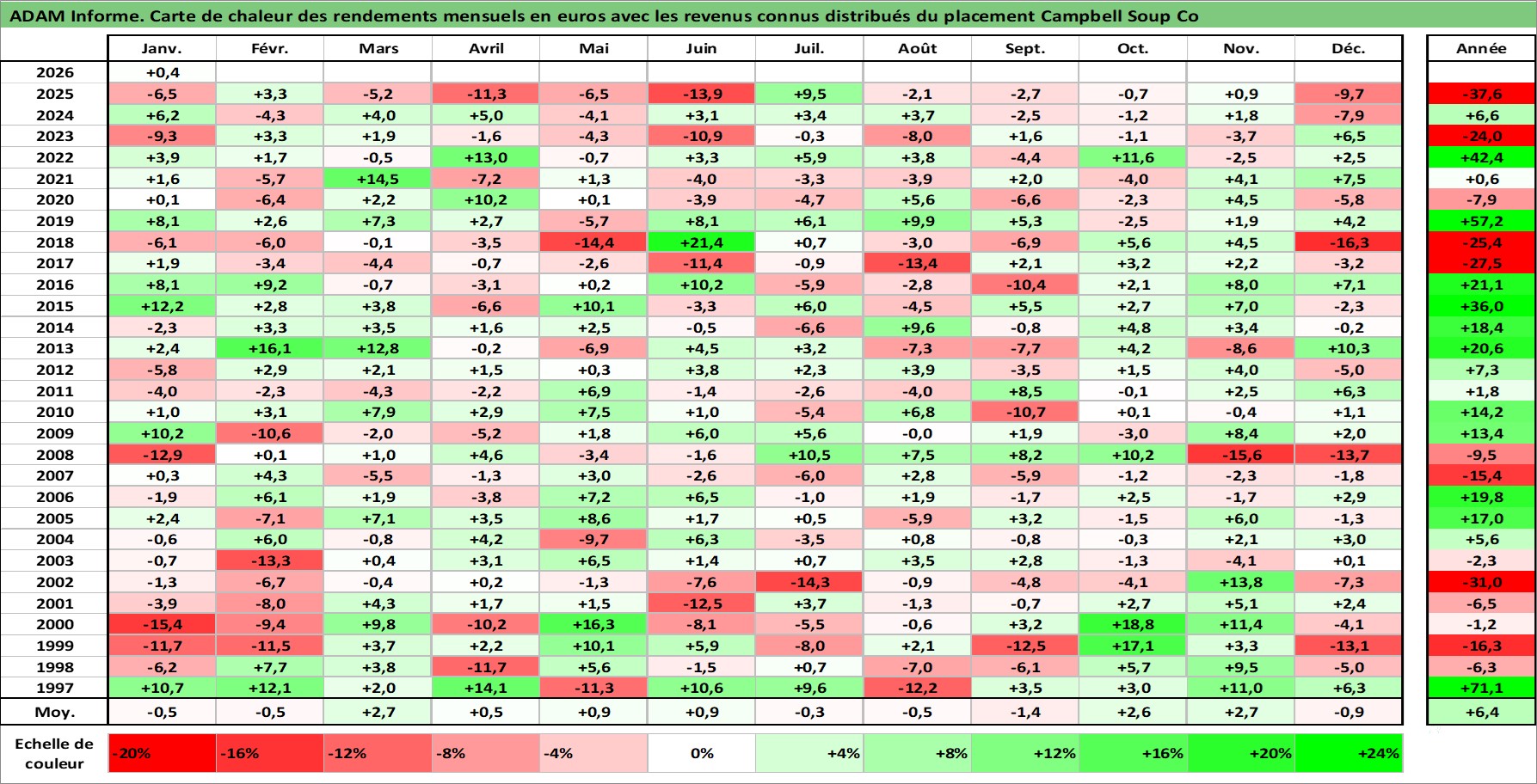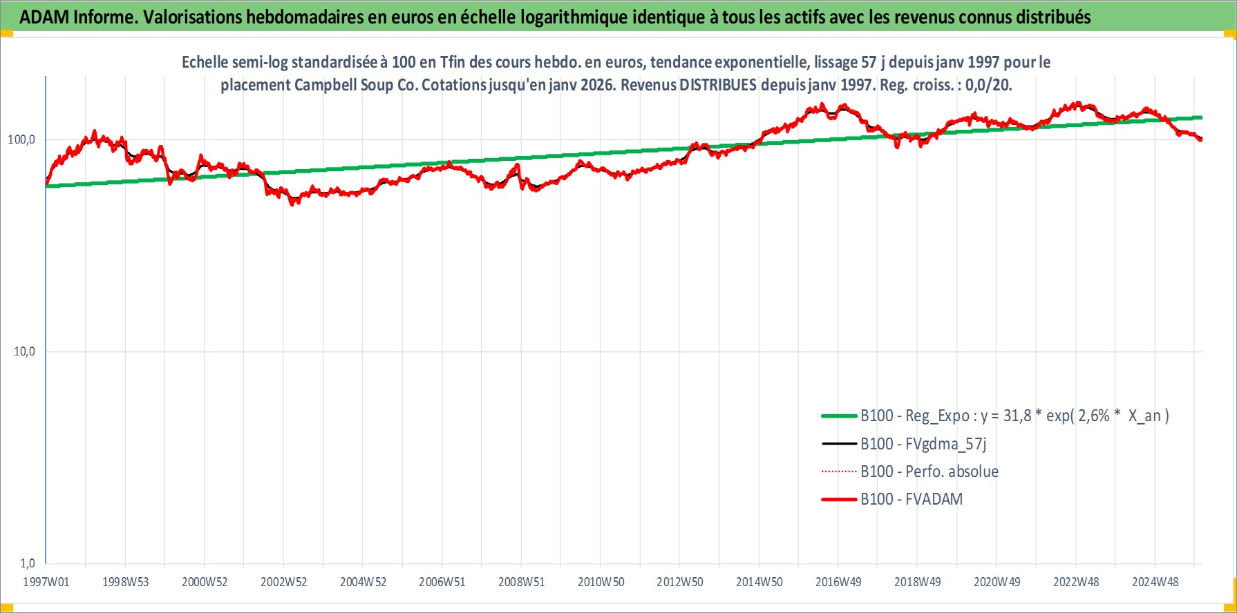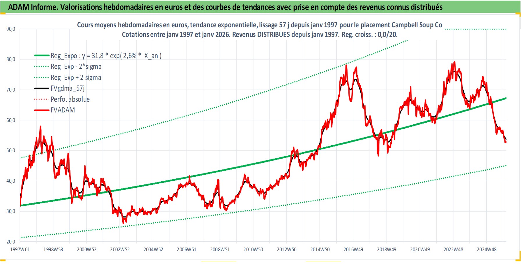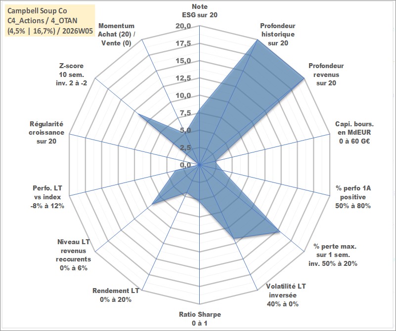 Site dédié aux investisseursPage dédiée sur site financeAnalyse des valorisations hebdomadaires de l'action Campbell Soup Co. Cet actif est cote en USD. Les valorisations sont en contrevaleur EURO et couvrent les semaines 1997W01 a 2026W05. Les revenus de cet actif financier sont pris en compte depuis la semaine 1997W02. La note globale ESG de cet actif est estimee a 8.0 (apres rebasage entre 0 et 20).