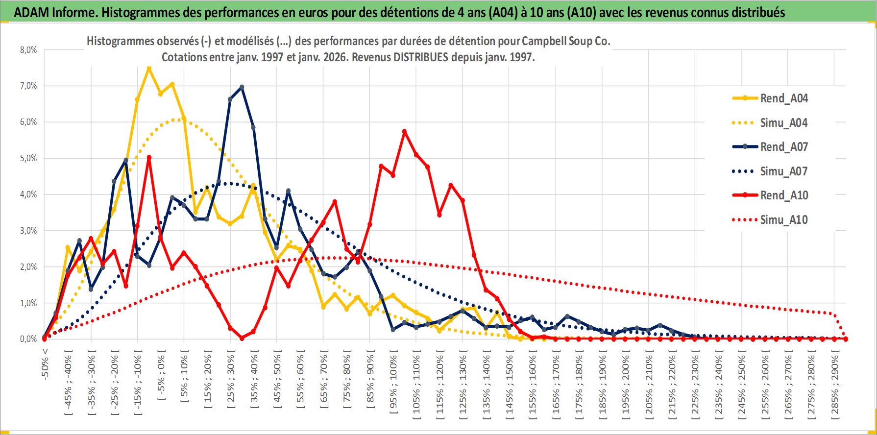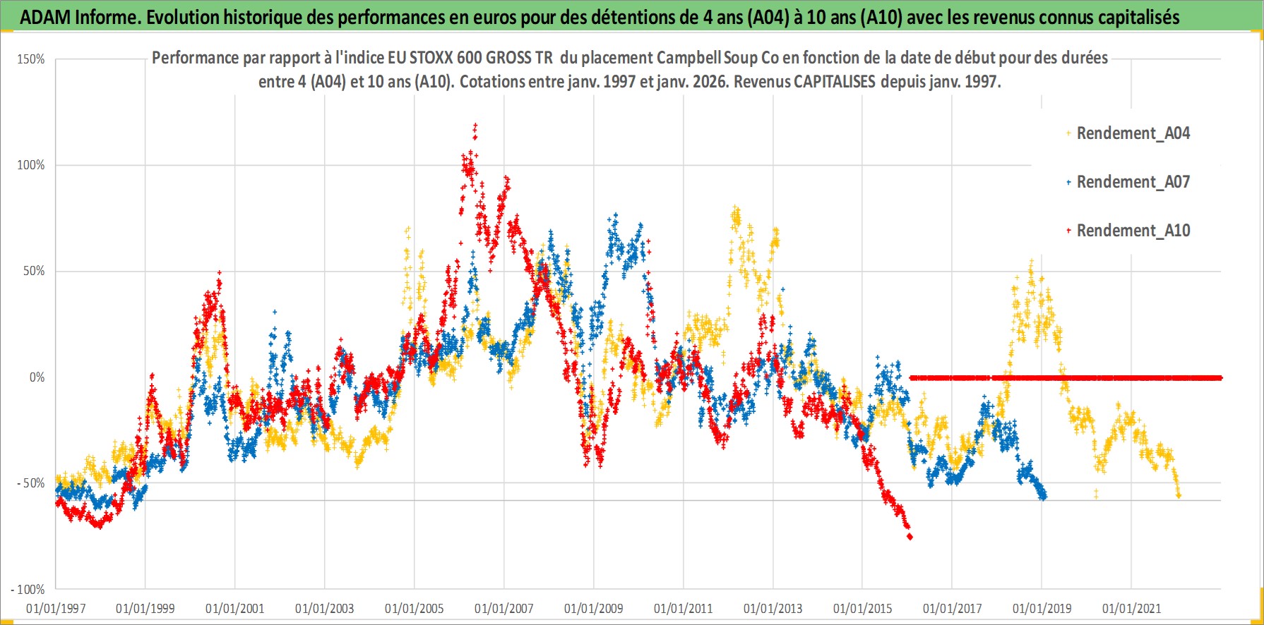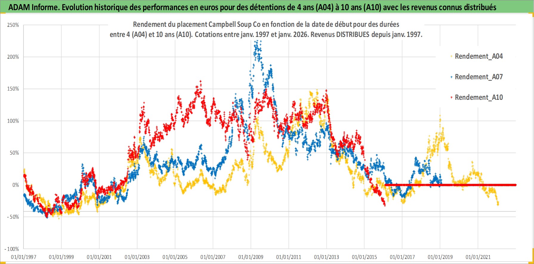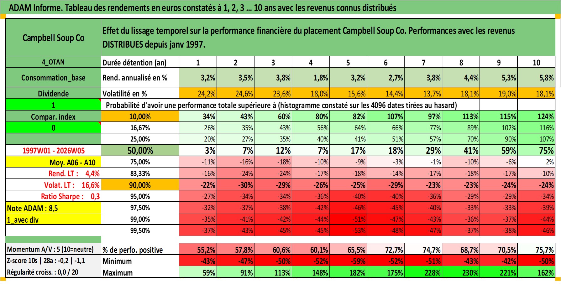 Site dédié aux investisseursPage dédiée sur site financeAnalyse des valorisations hebdomadaires de l'action Campbell Soup Co. Cet actif est cote en USD. Les valorisations sont en contrevaleur EURO et couvrent les semaines 1997W01 a 2026W05. Les revenus de cet actif financier sont pris en compte depuis la semaine 1997W02. La note globale ESG de cet actif est estimee a 8.0 (apres rebasage entre 0 et 20).