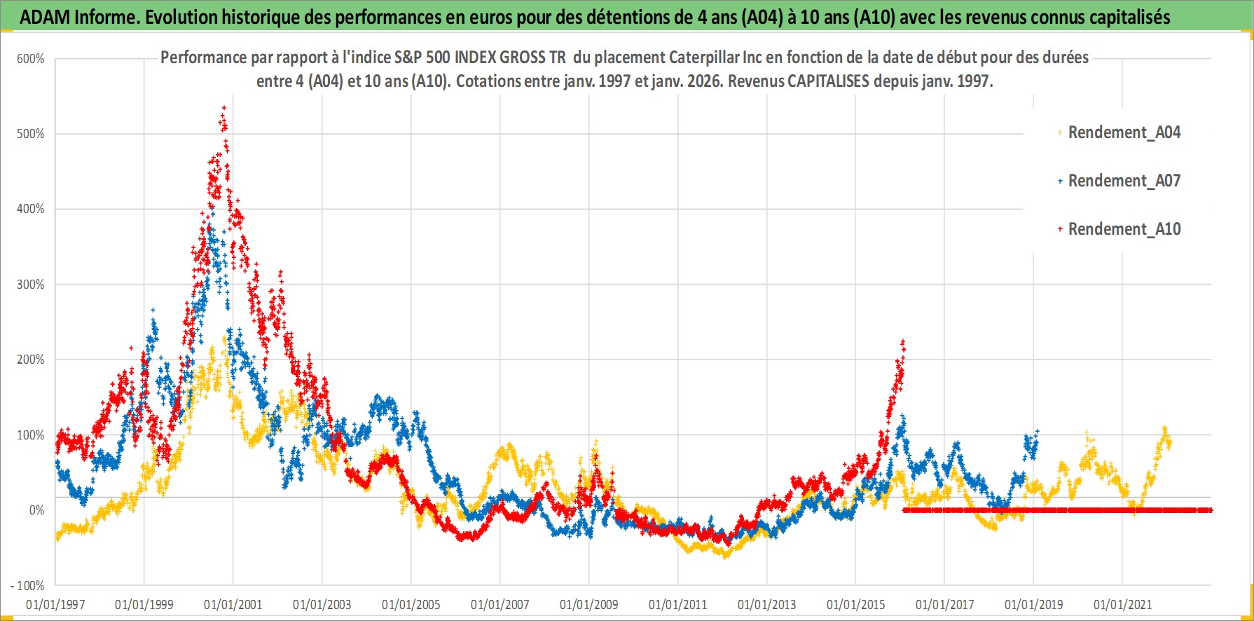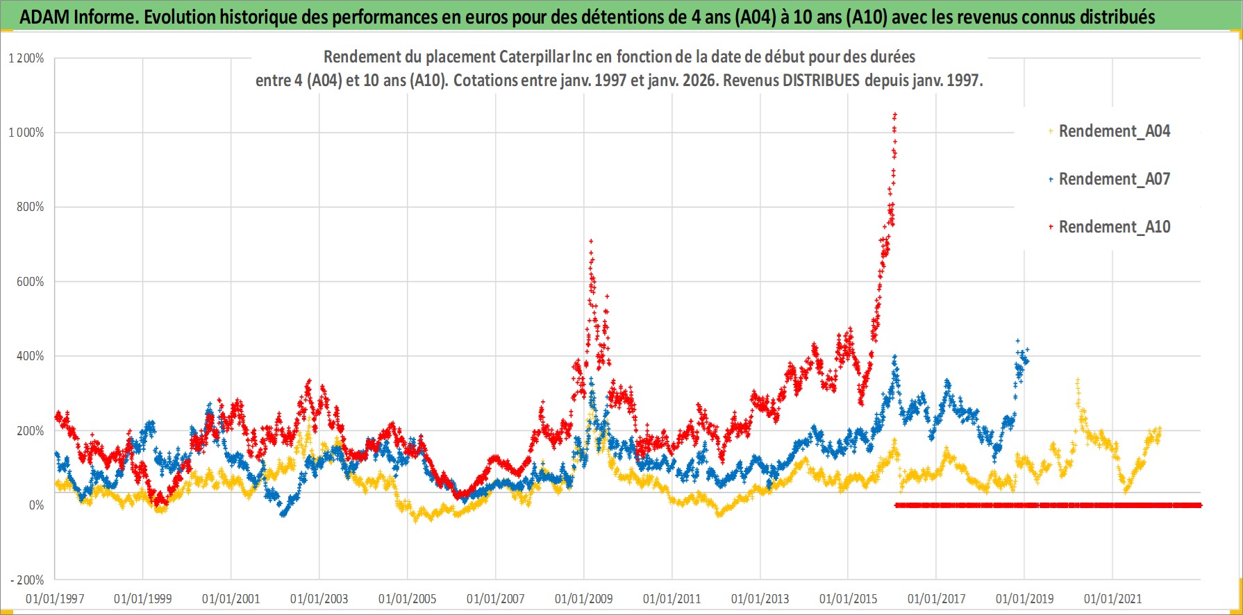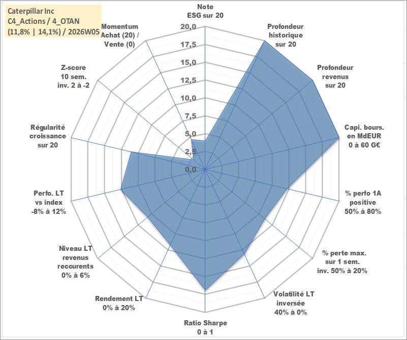 Site dédié aux investisseursPage dédiée sur site financeAnalyse des valorisations hebdomadaires de l'action Caterpillar Inc. Cet actif est cote en USD. Les valorisations sont en contrevaleur EURO et couvrent les semaines 1997W01 a 2026W05. Les revenus de cet actif financier sont pris en compte depuis la semaine 1997W03. La note globale ESG de cet actif est estimee a 4.0 (apres rebasage entre 0 et 20).