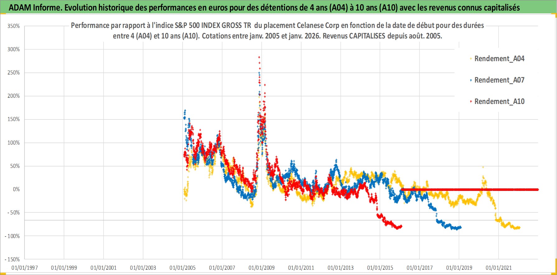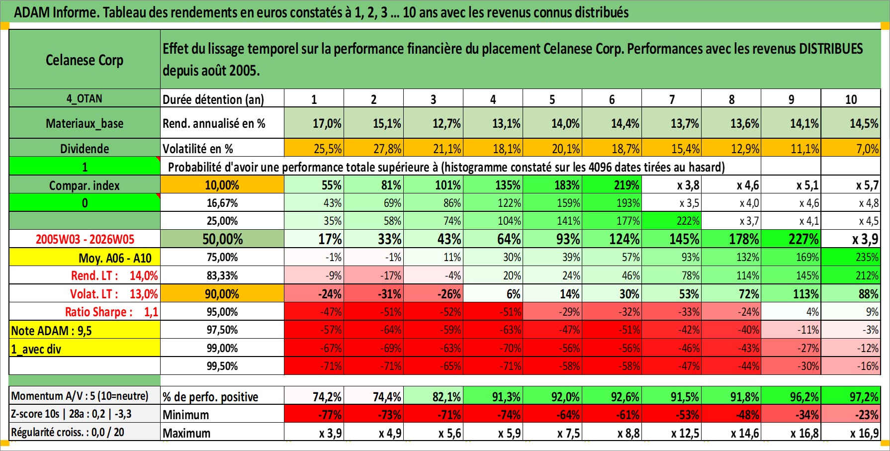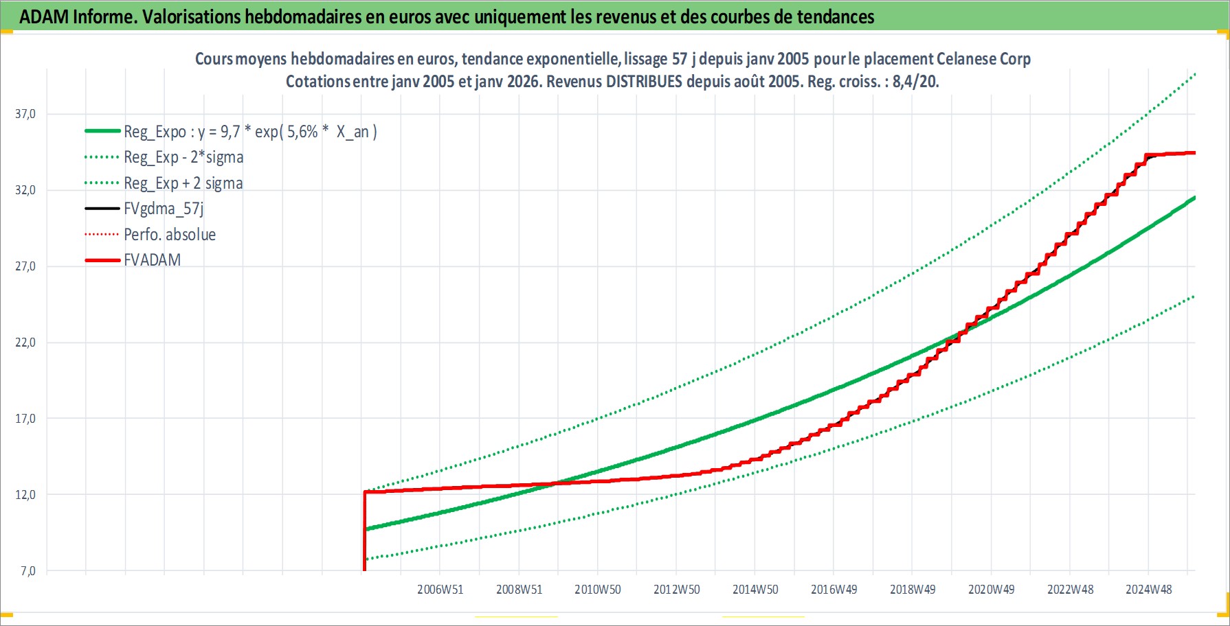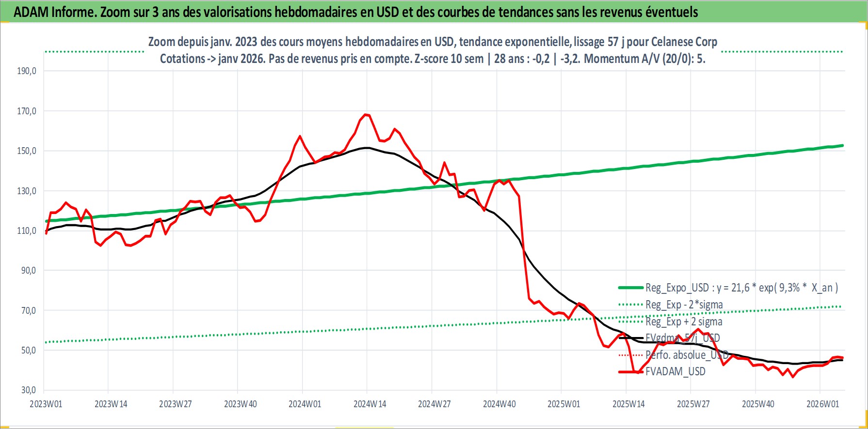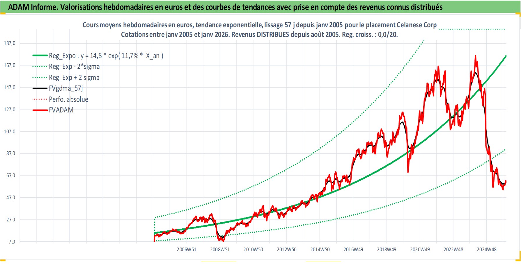 Site dédié aux investisseursPage dédiée sur site financeAnalyse des valorisations hebdomadaires de l'action Celanese Corp. Cet actif est cote en USD. Les valorisations sont en contrevaleur EURO et couvrent les semaines 2005W03 a 2026W05. Les revenus de cet actif financier sont pris en compte depuis la semaine 2005W31. La note globale ESG de cet actif est estimee a 6.0 (apres rebasage entre 0 et 20).