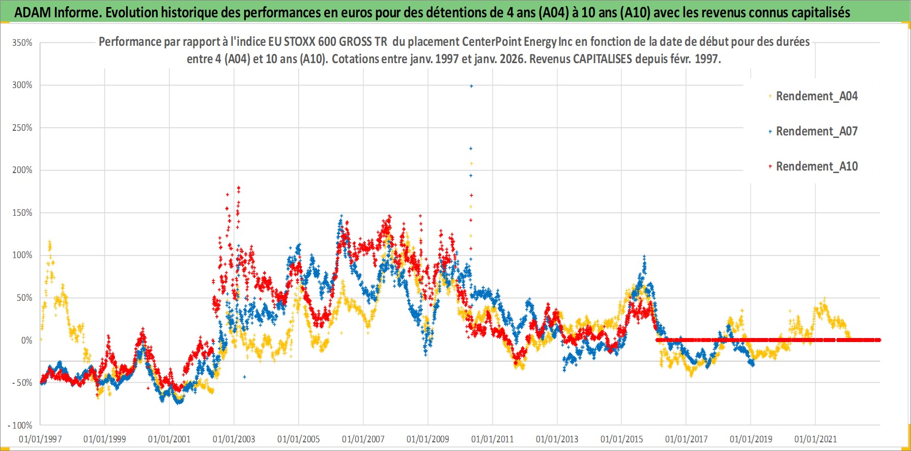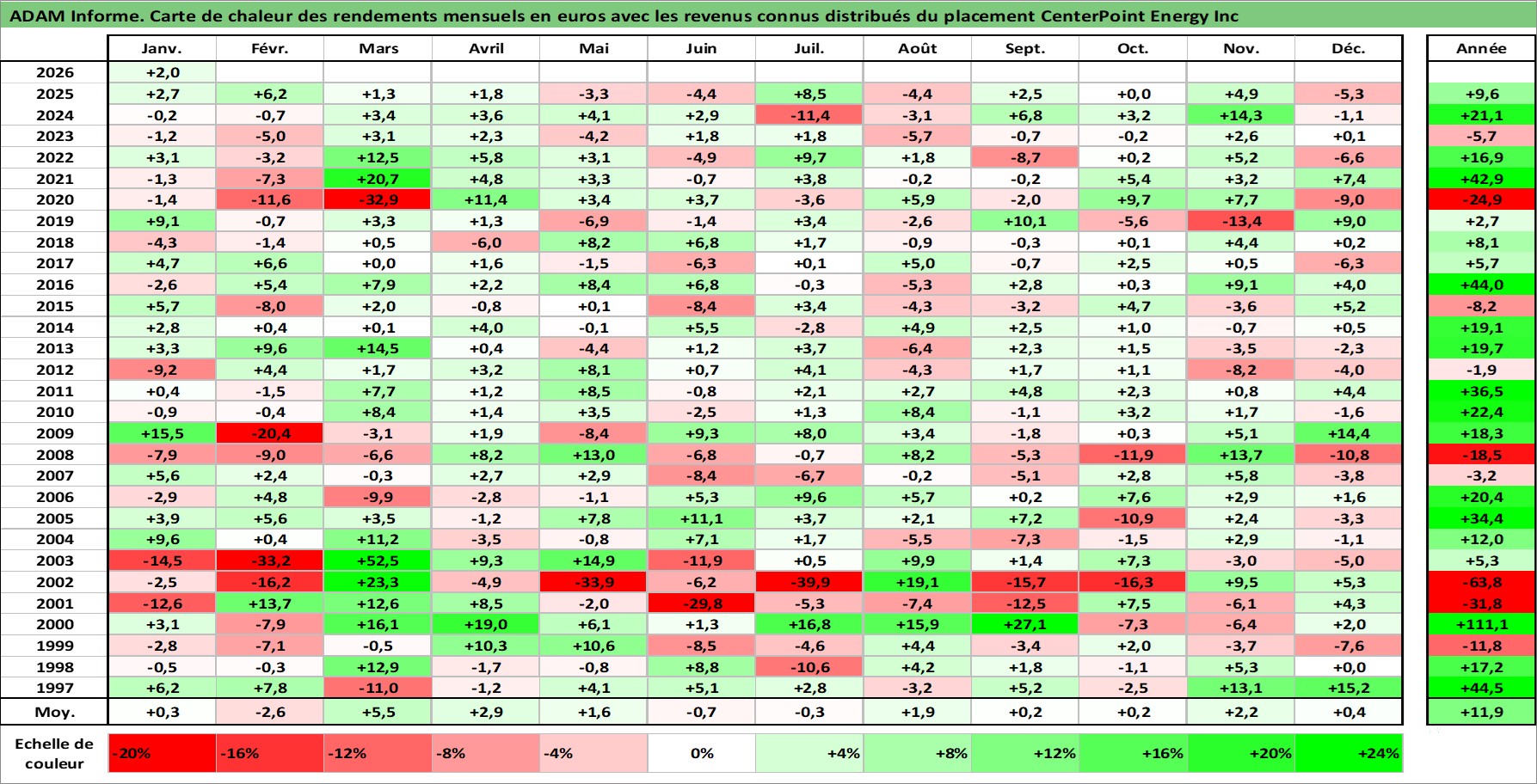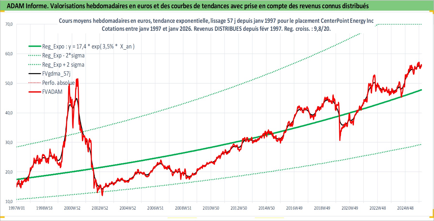 Site dédié aux investisseursPage dédiée sur site financeAnalyse des valorisations hebdomadaires de l'action CenterPoint Energy Inc. Cet actif est cote en USD. Les valorisations sont en contrevaleur EURO et couvrent les semaines 1997W01 a 2026W05. Les revenus de cet actif financier sont pris en compte depuis la semaine 1997W07. La note globale ESG de cet actif est estimee a 7.0 (apres rebasage entre 0 et 20).