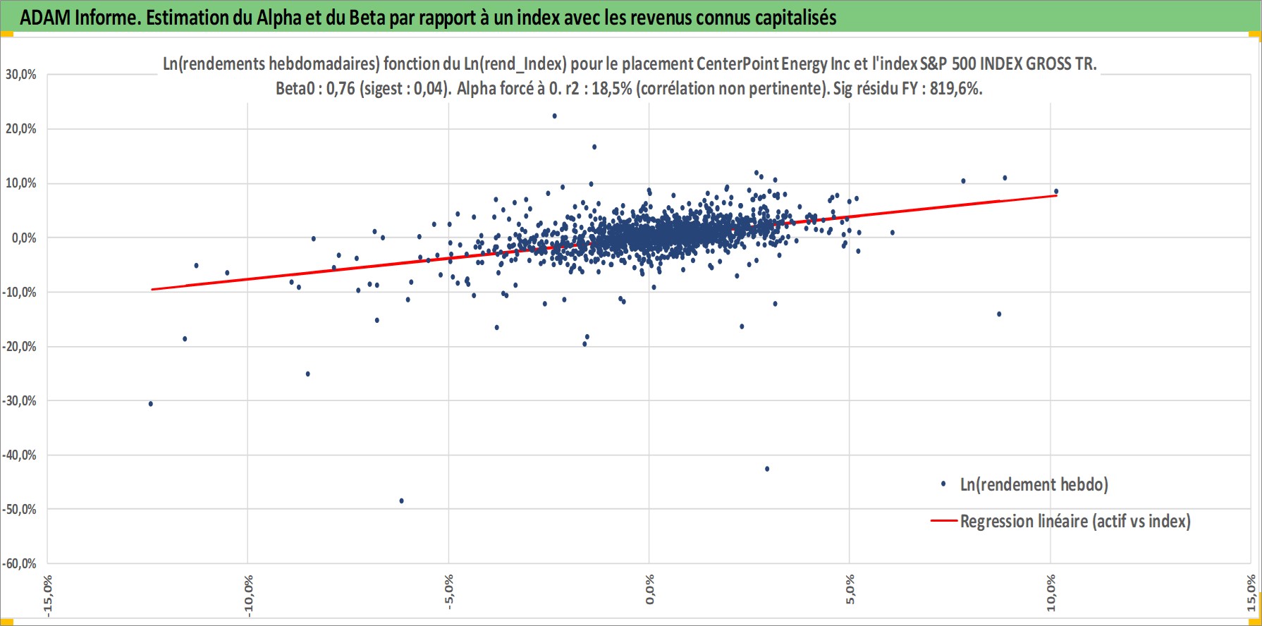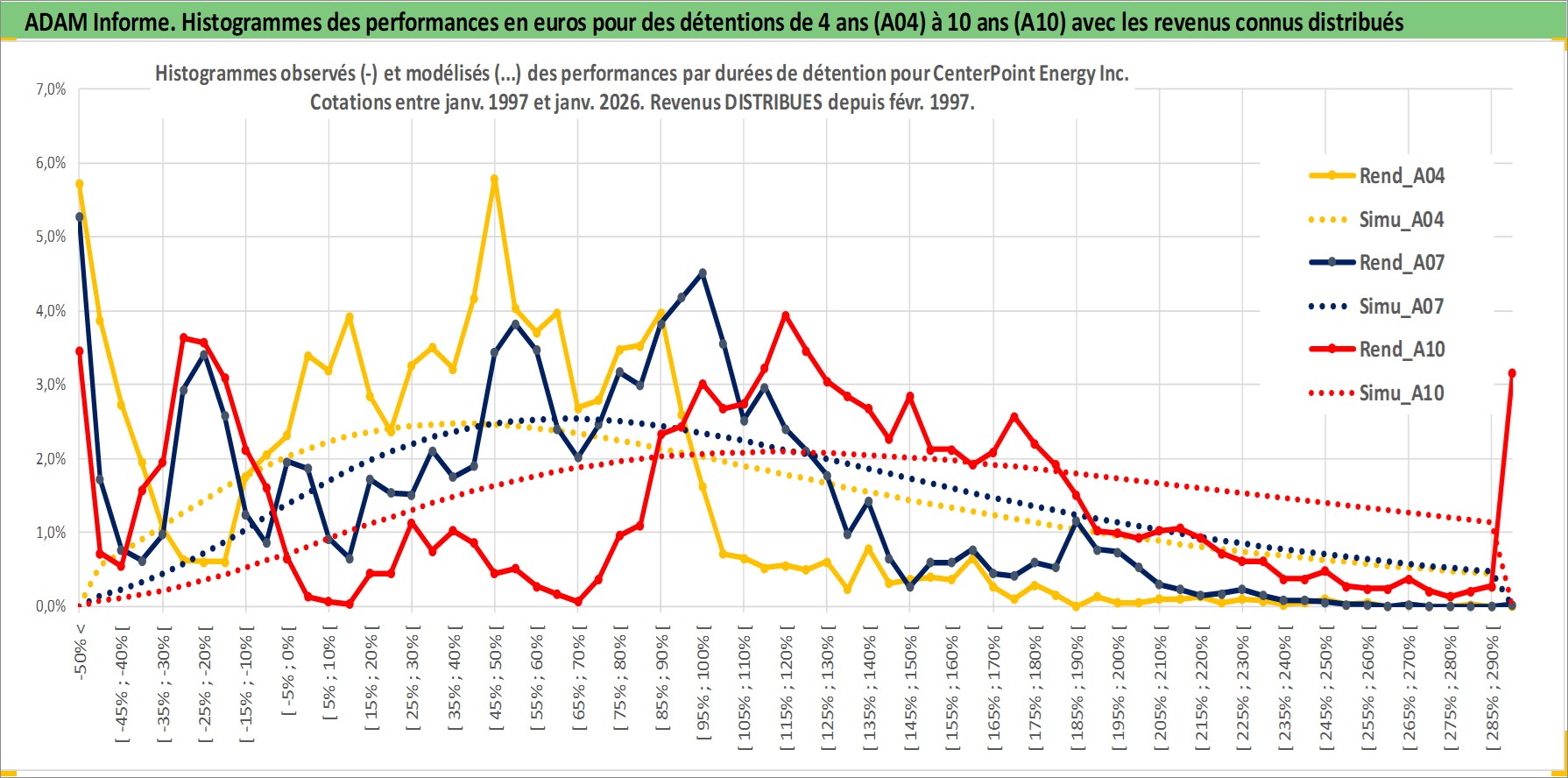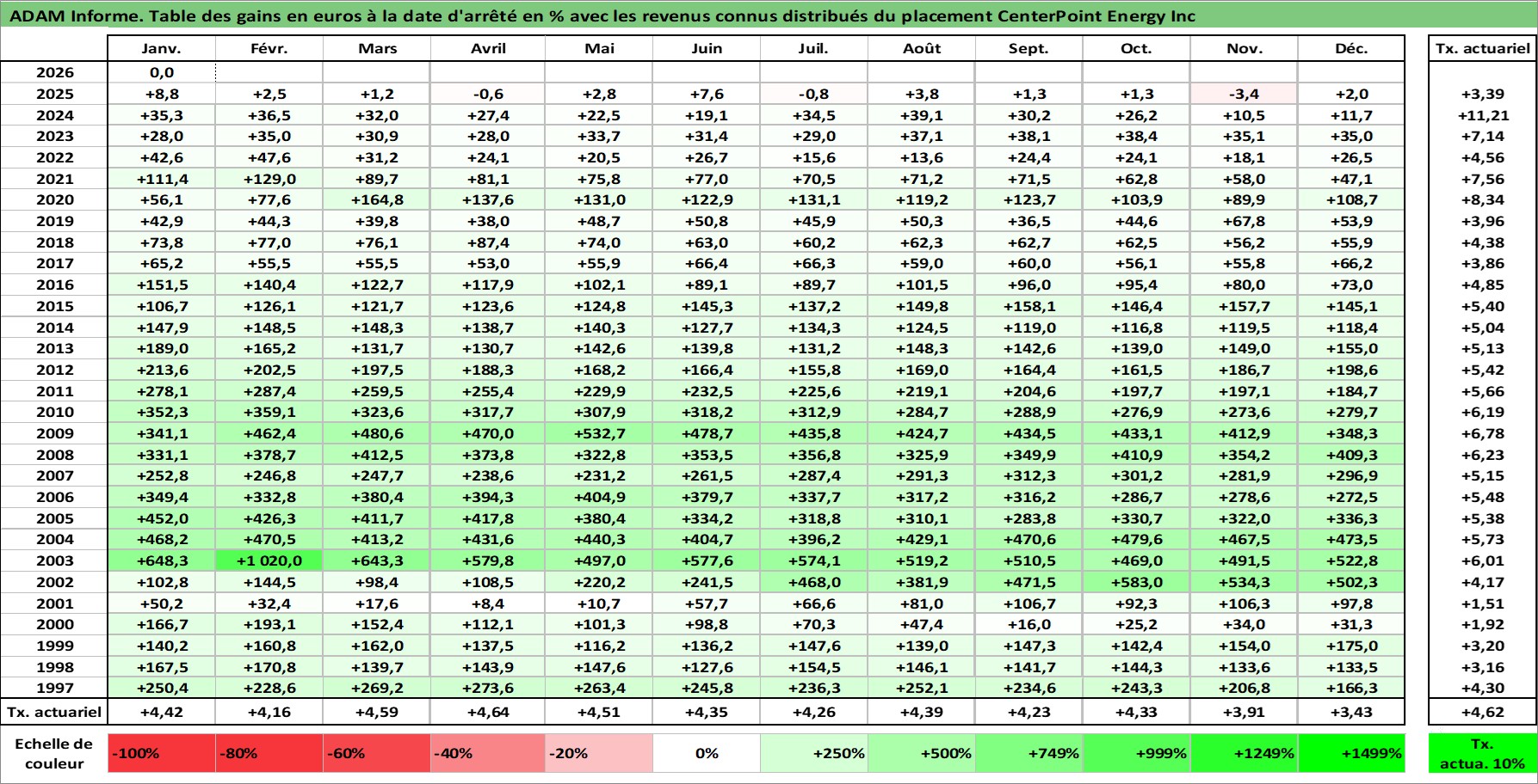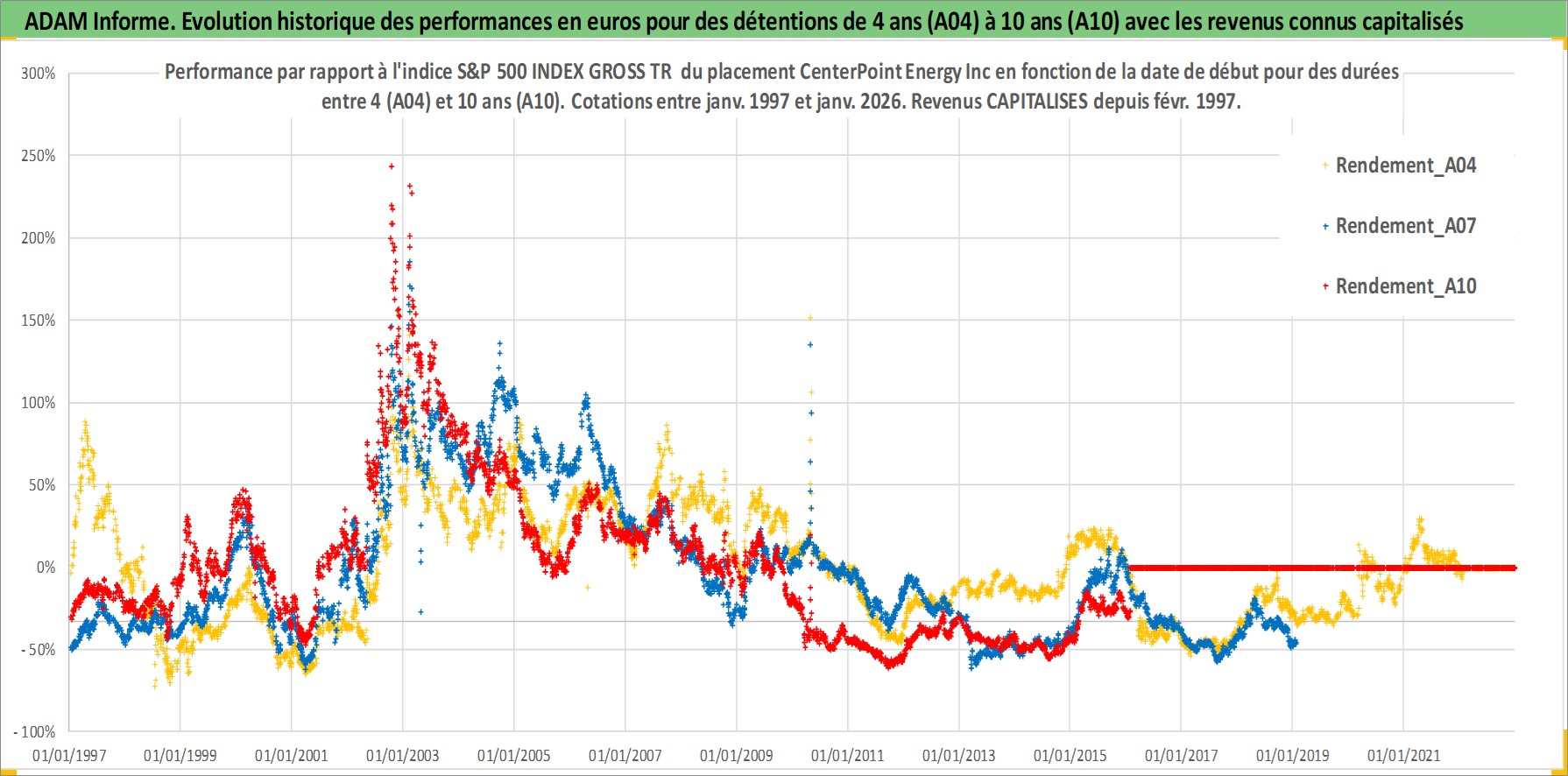 Site dédié aux investisseursPage dédiée sur site financeAnalyse des valorisations hebdomadaires de l'action CenterPoint Energy Inc. Cet actif est cote en USD. Les valorisations sont en contrevaleur EURO et couvrent les semaines 1997W01 a 2026W05. Les revenus de cet actif financier sont pris en compte depuis la semaine 1997W07. La note globale ESG de cet actif est estimee a 7.0 (apres rebasage entre 0 et 20).