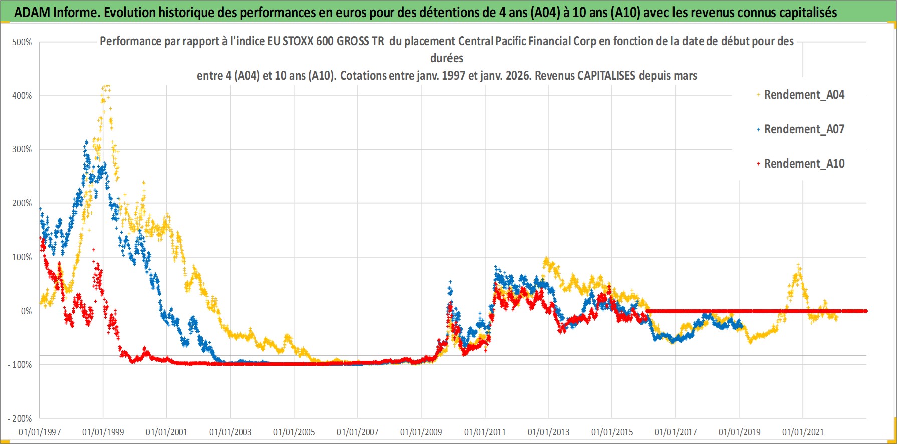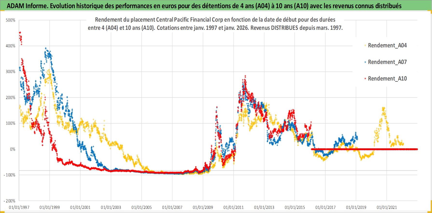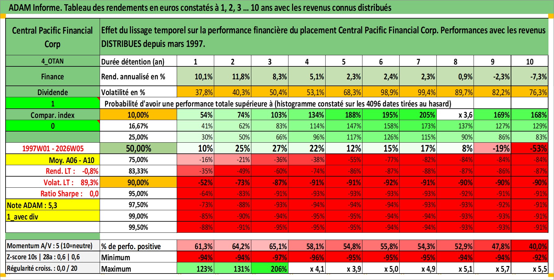 Site dédié aux investisseursPage dédiée sur site financeAnalyse des valorisations hebdomadaires de l'action Central Pacific Financial Corp. Cet actif est cote en USD. Les valorisations sont en contrevaleur EURO et couvrent les semaines 1997W01 a 2026W05. Les revenus de cet actif financier sont pris en compte depuis la semaine 1997W13. La note ESG de cet actif n'est pas connue.