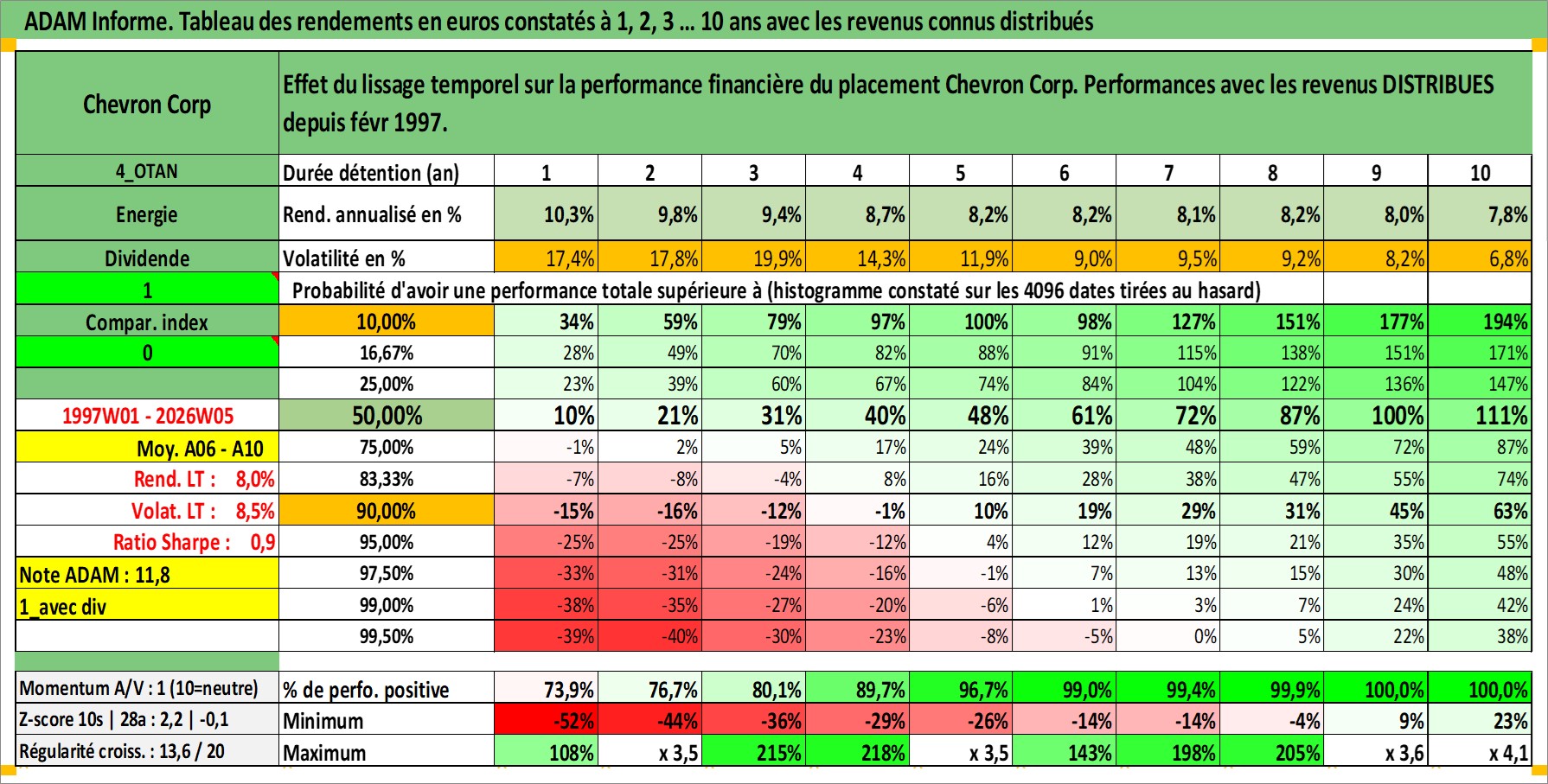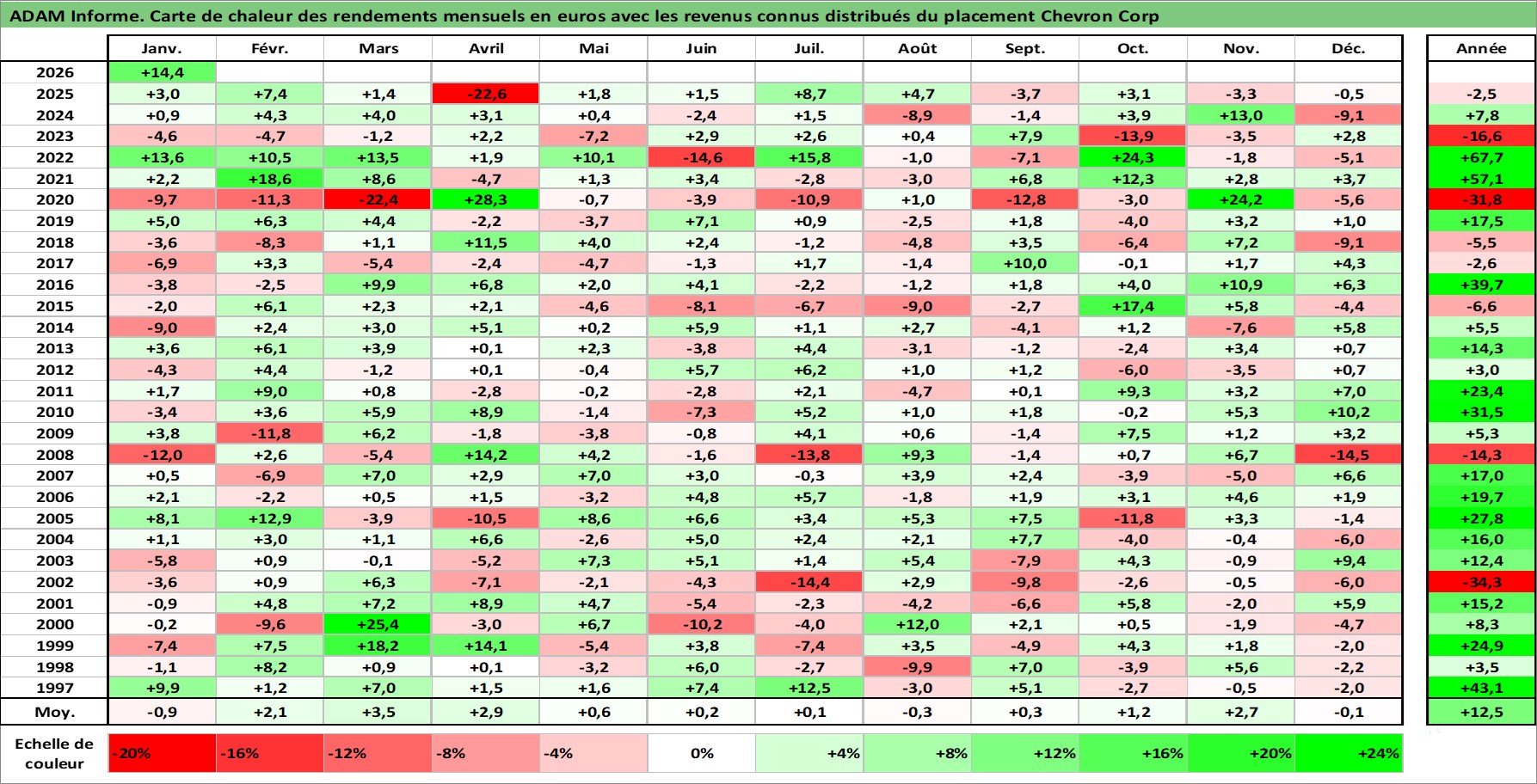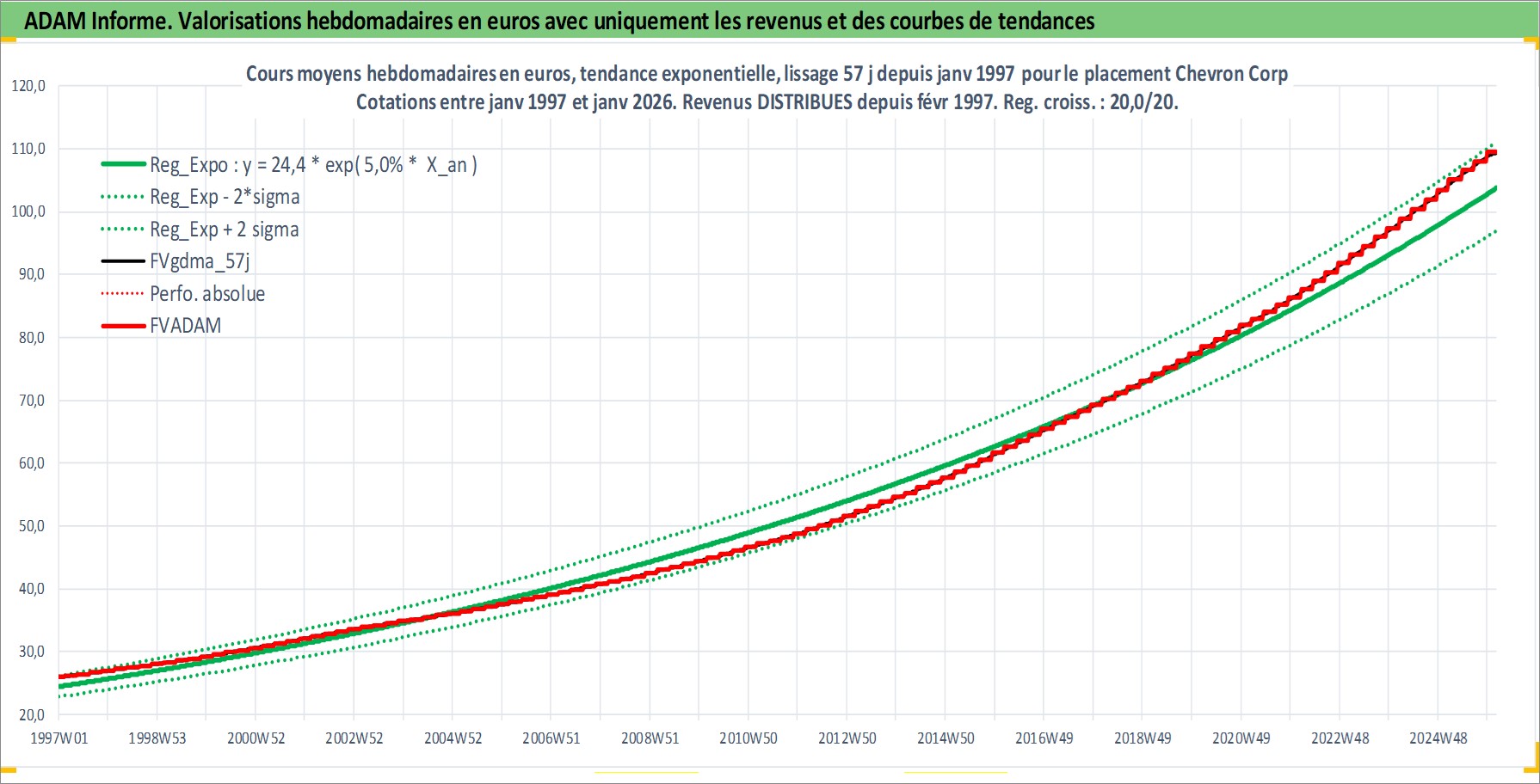 Site dédié aux investisseursPage dédiée sur site financeAnalyse des valorisations hebdomadaires de l'action Chevron Corp. Cet actif est cote en USD. Les valorisations sont en contrevaleur EURO et couvrent les semaines 1997W01 a 2026W05. Les revenus de cet actif financier sont pris en compte depuis la semaine 1997W08. La note globale ESG de cet actif est estimee a 2.0 (apres rebasage entre 0 et 20).