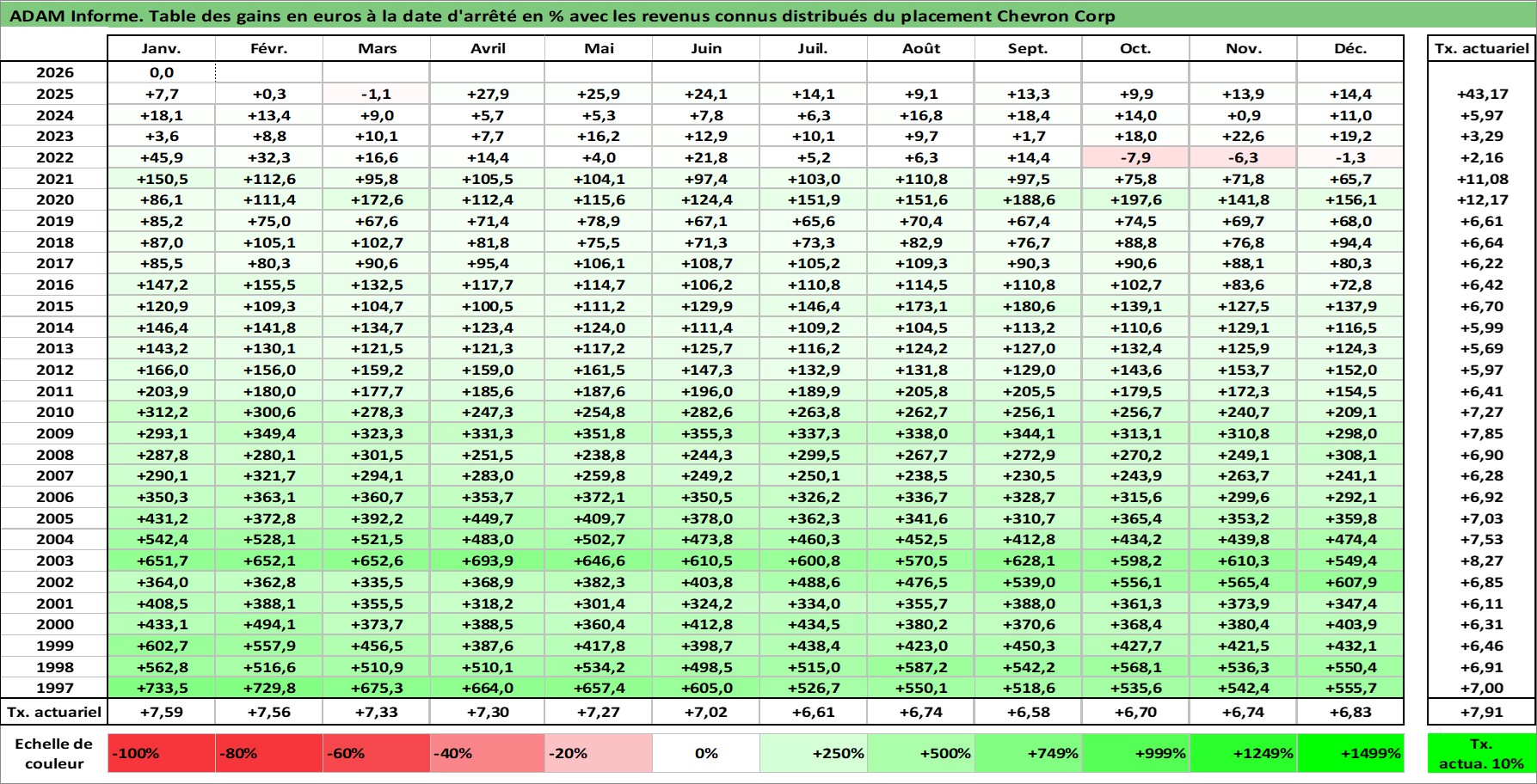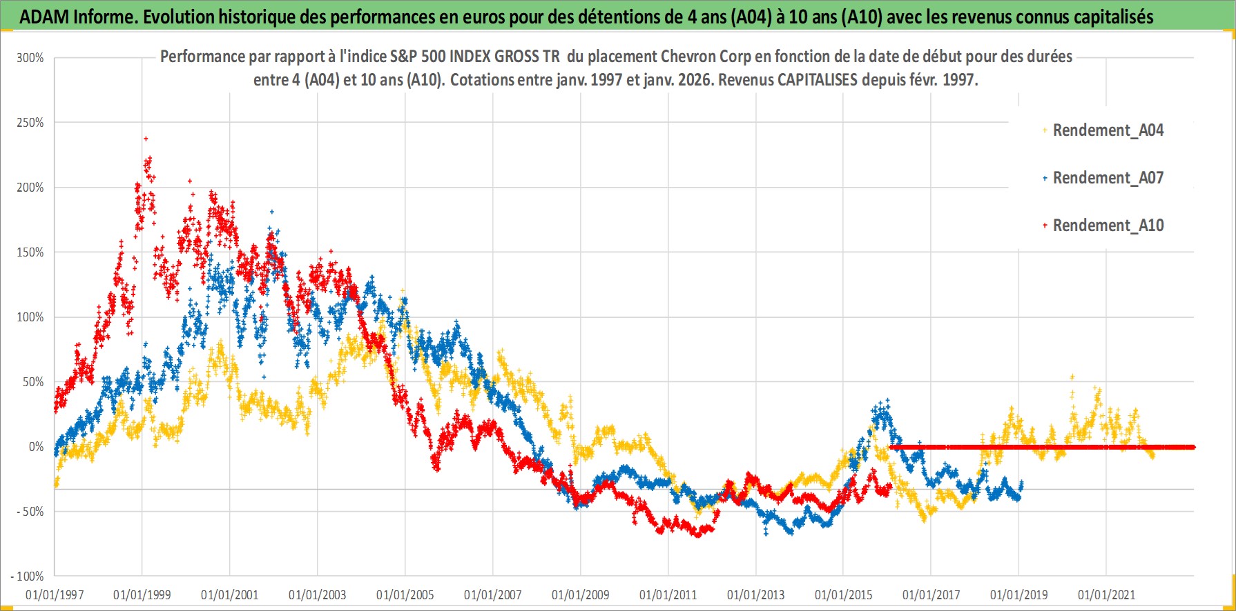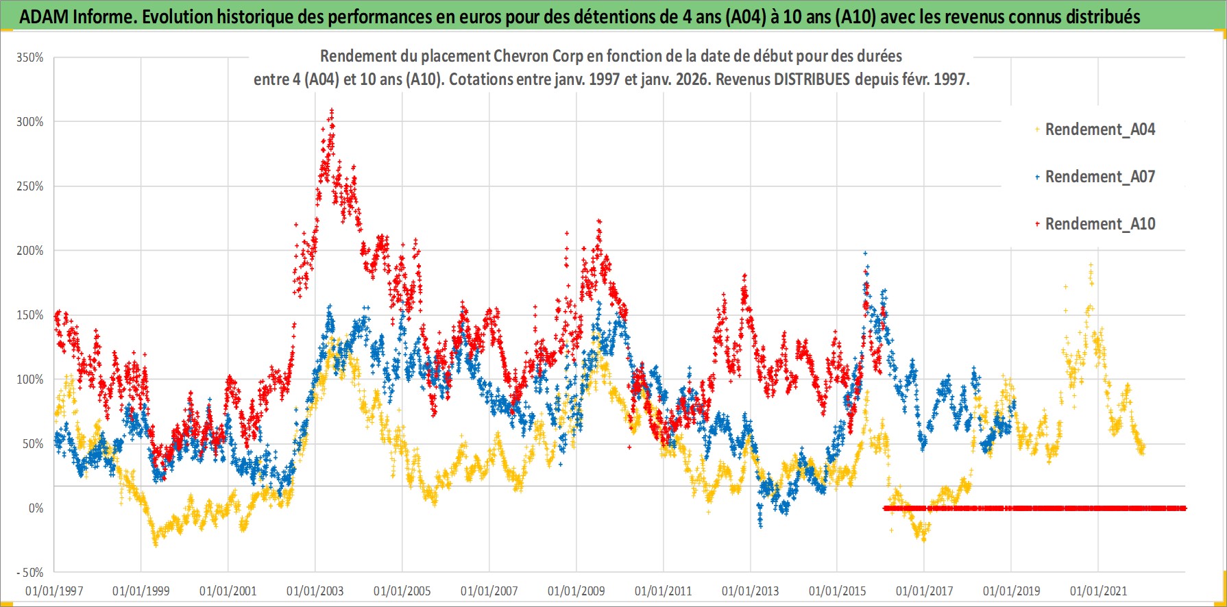 Site dédié aux investisseursPage dédiée sur site financeAnalyse des valorisations hebdomadaires de l'action Chevron Corp. Cet actif est cote en USD. Les valorisations sont en contrevaleur EURO et couvrent les semaines 1997W01 a 2026W05. Les revenus de cet actif financier sont pris en compte depuis la semaine 1997W08. La note globale ESG de cet actif est estimee a 2.0 (apres rebasage entre 0 et 20).